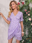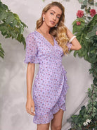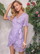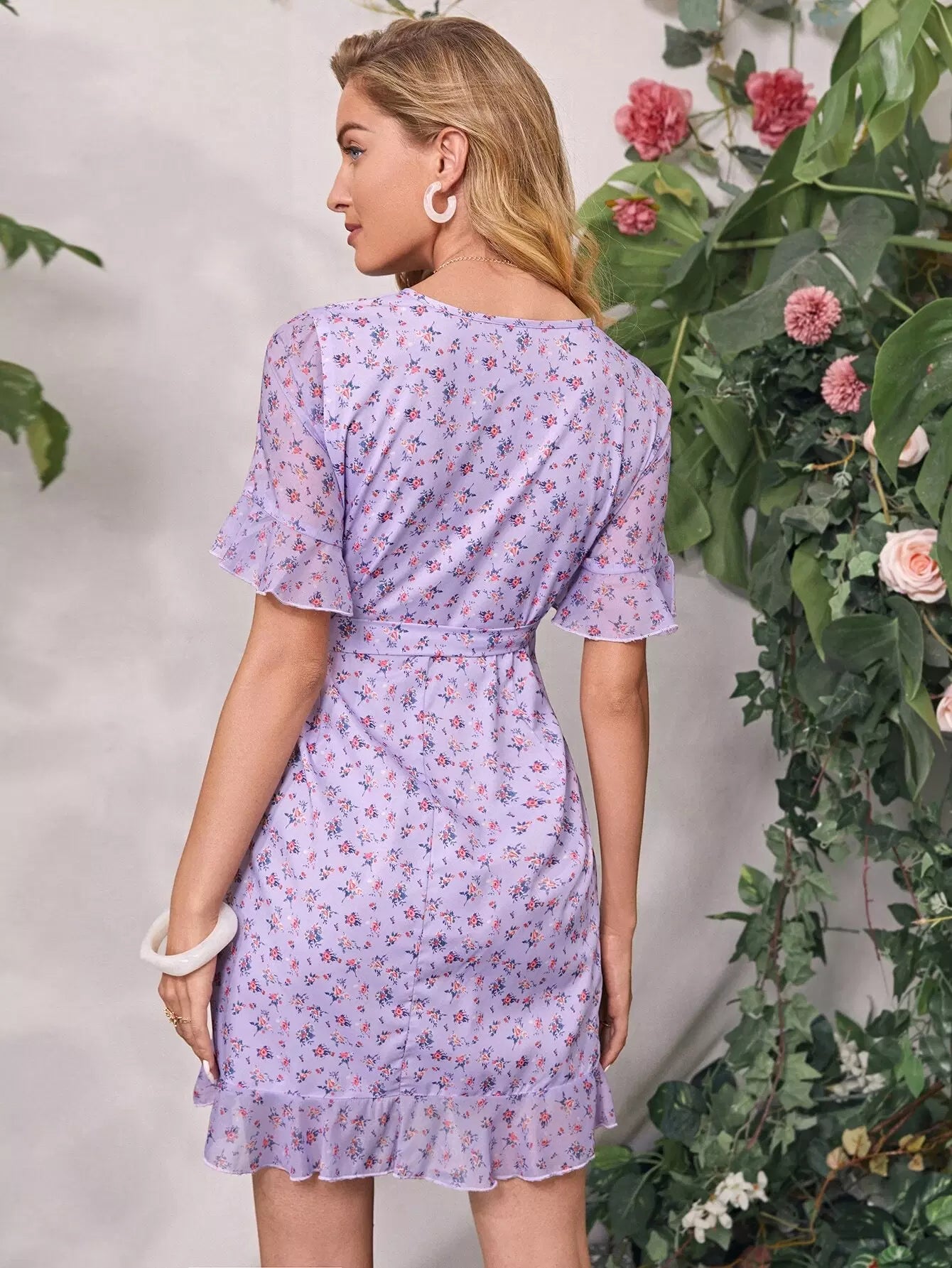 Flounce Sleeve Surplice Neck Ruffle Hem Ditsy Floral Dress Without Belt