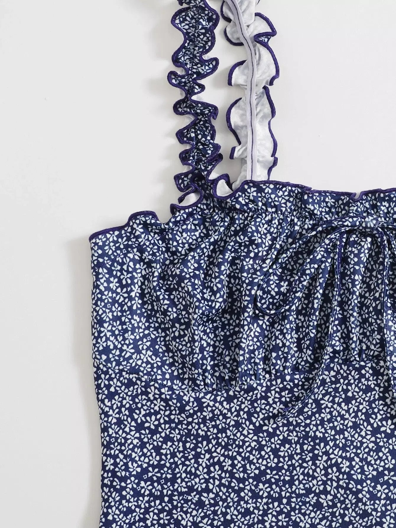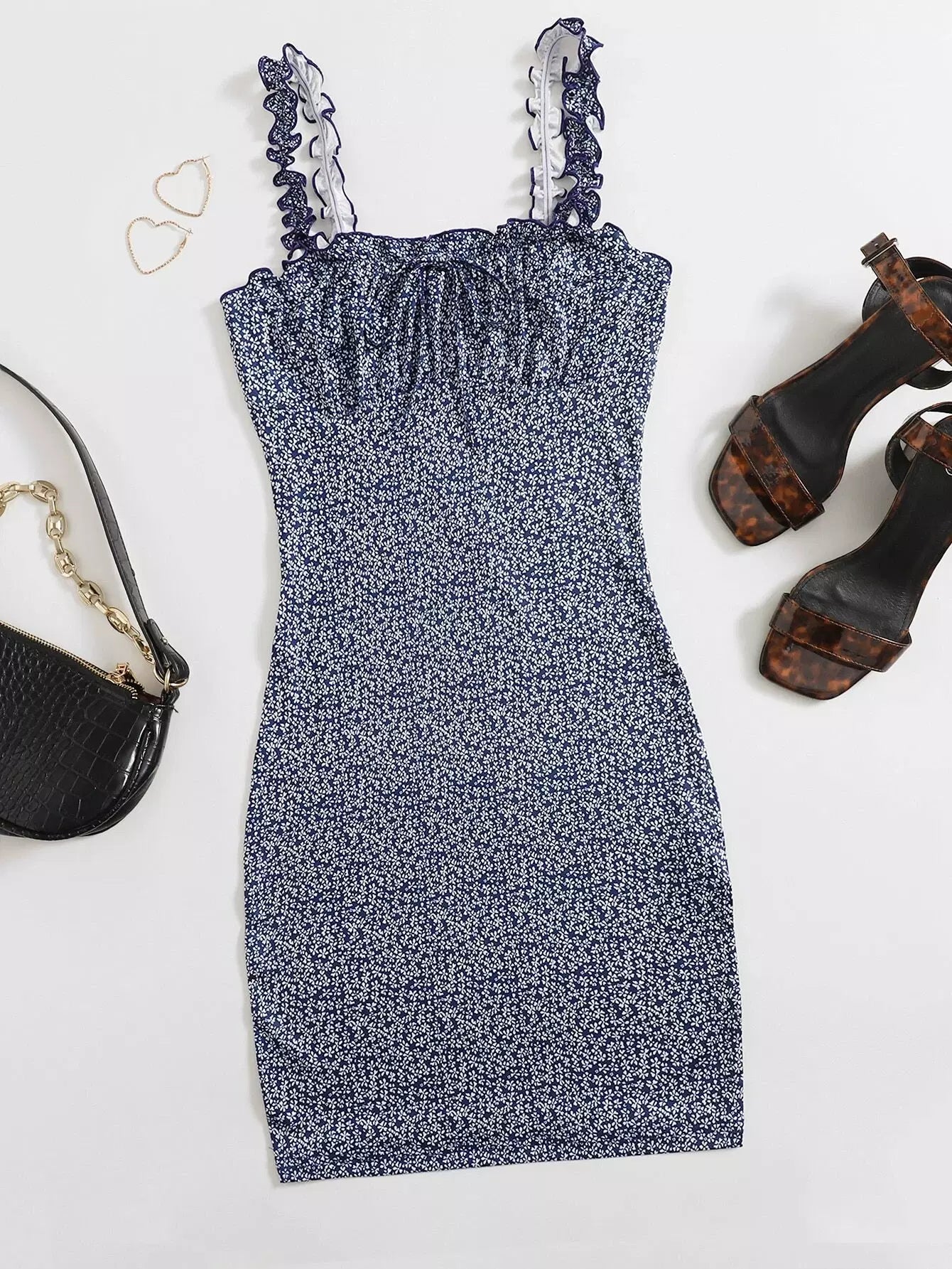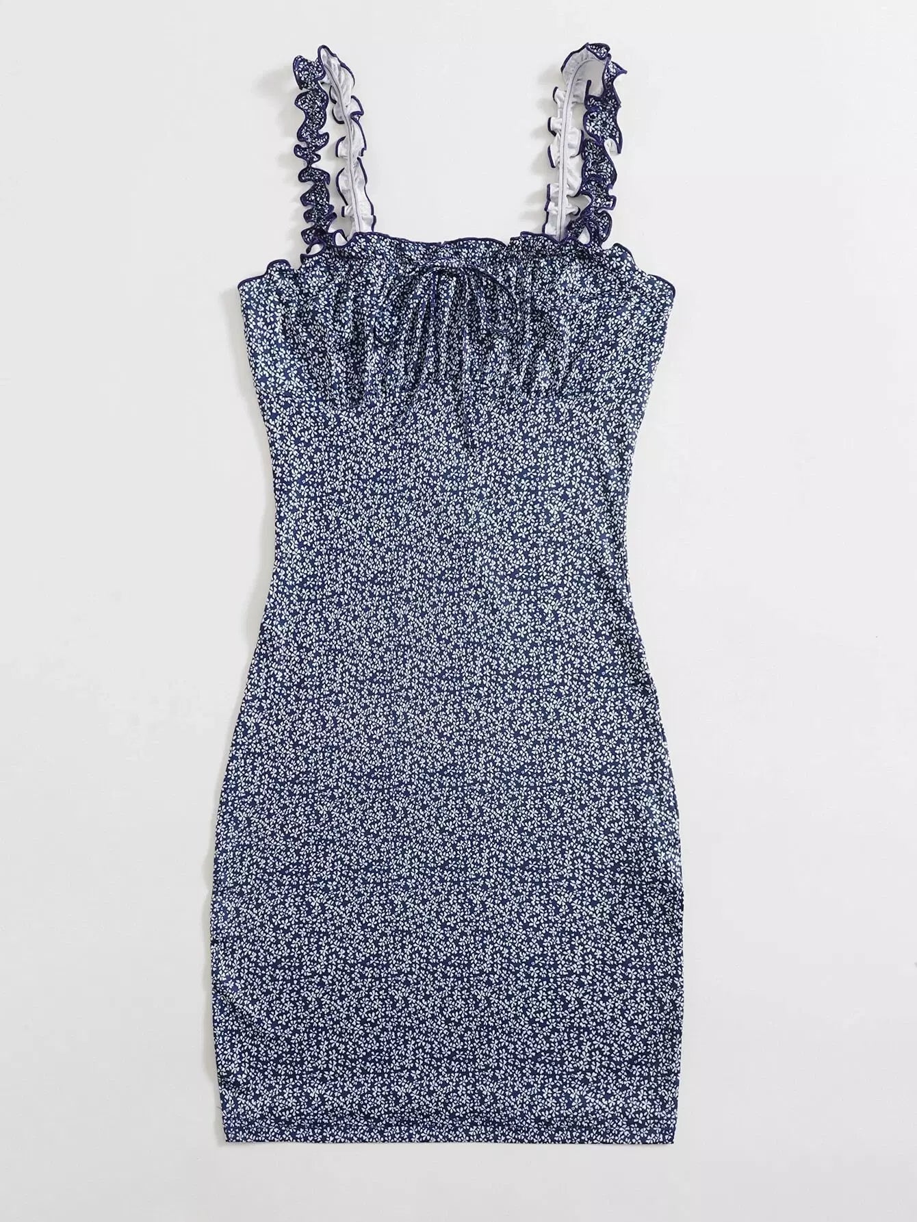 Frill Straps Knot Ruched Bust Ditsy Floral Dress