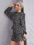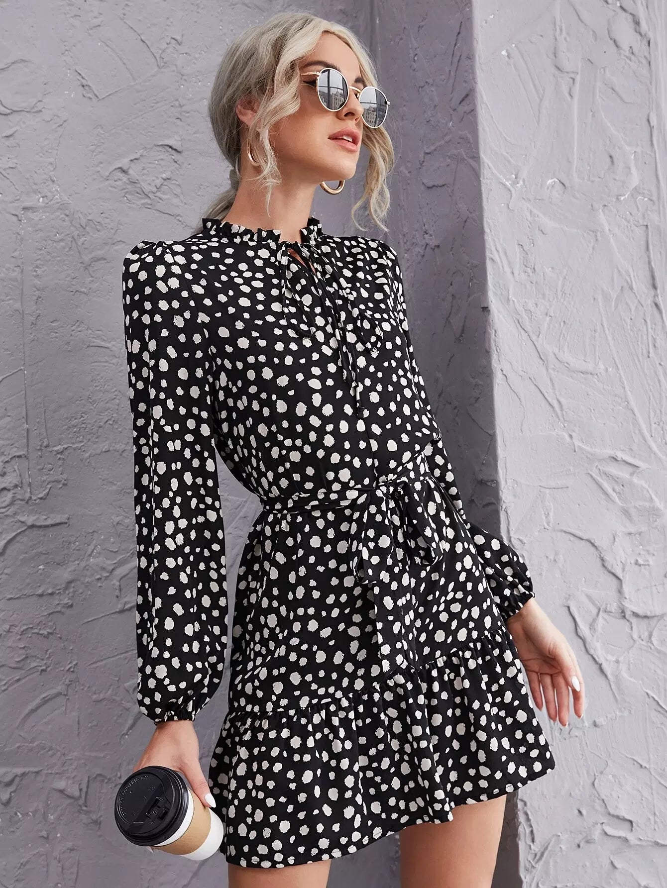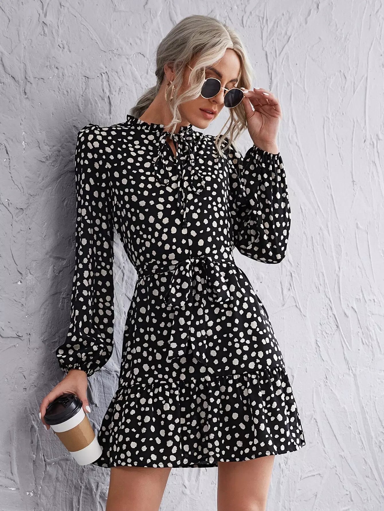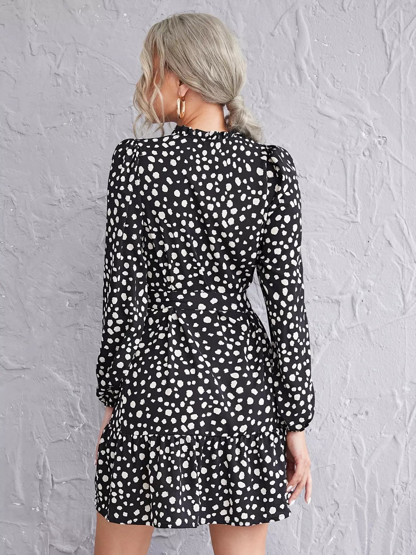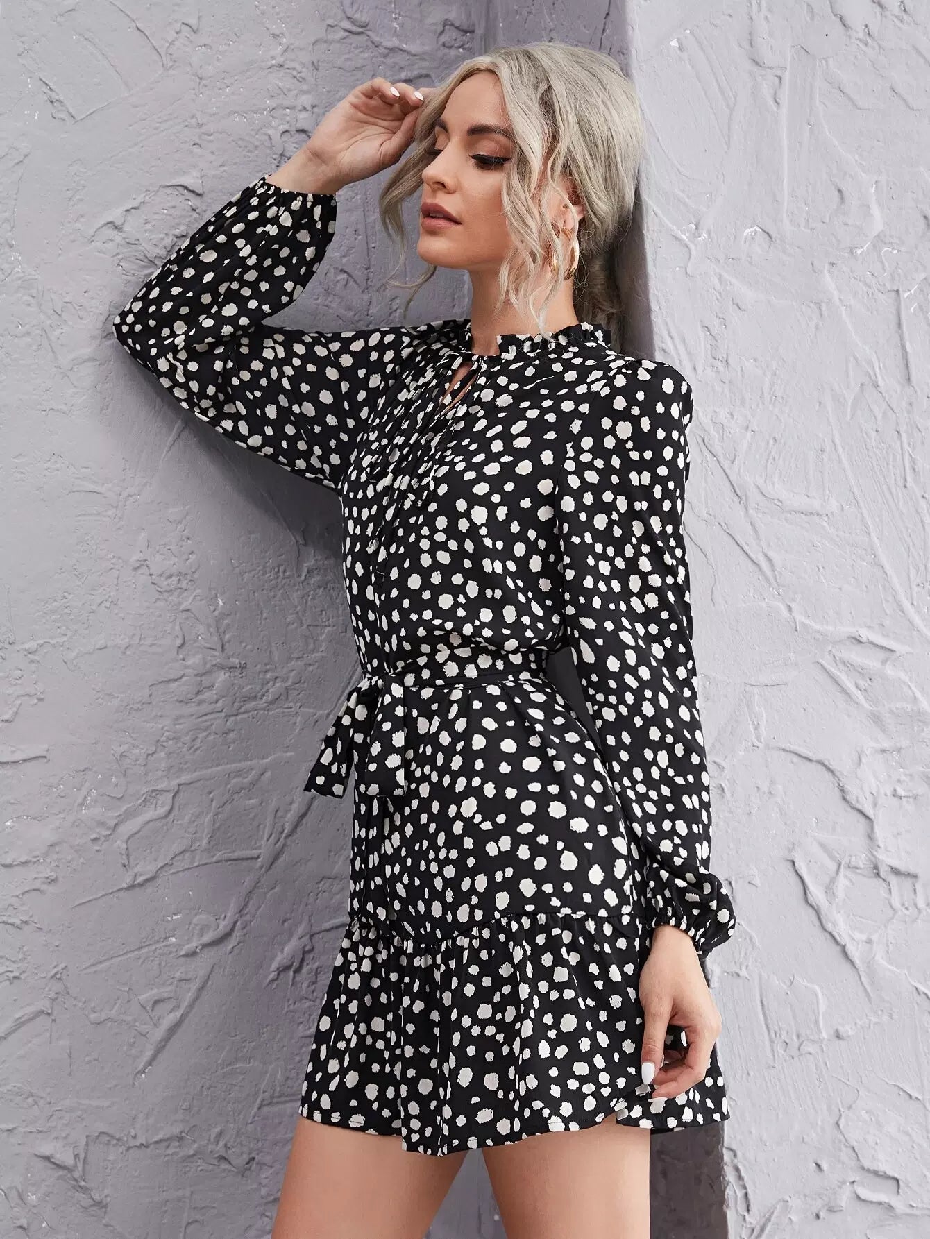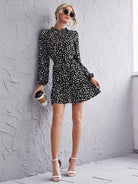 Frill Tie Neck Ruffle Hem Dalmatian Dress Without Belt