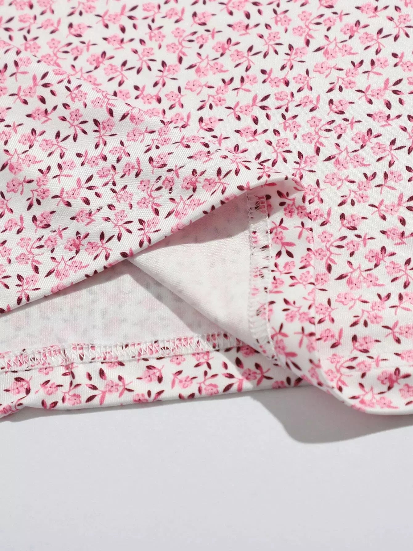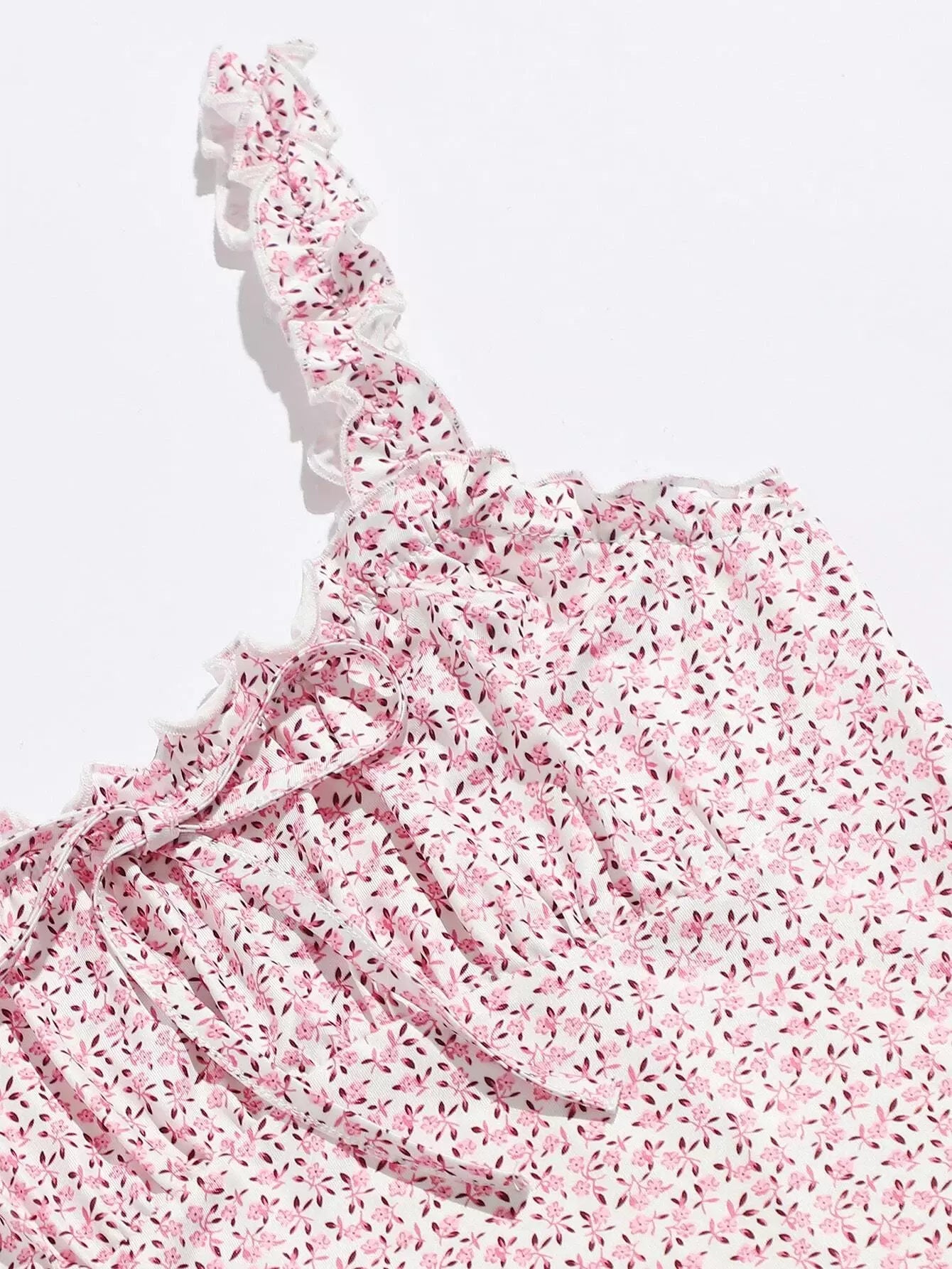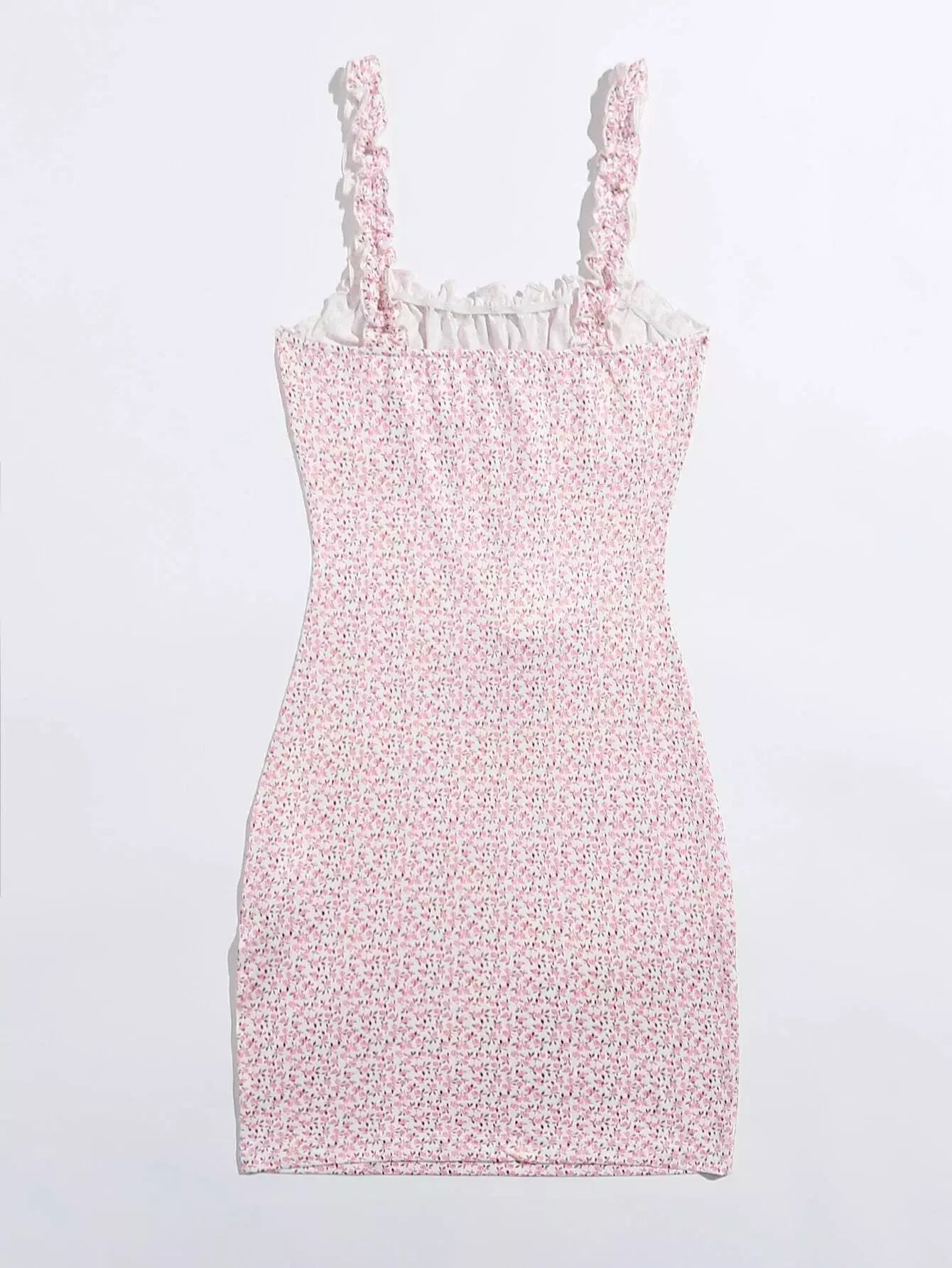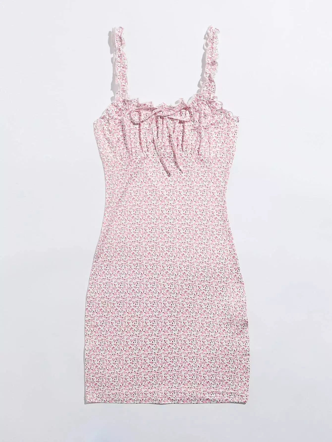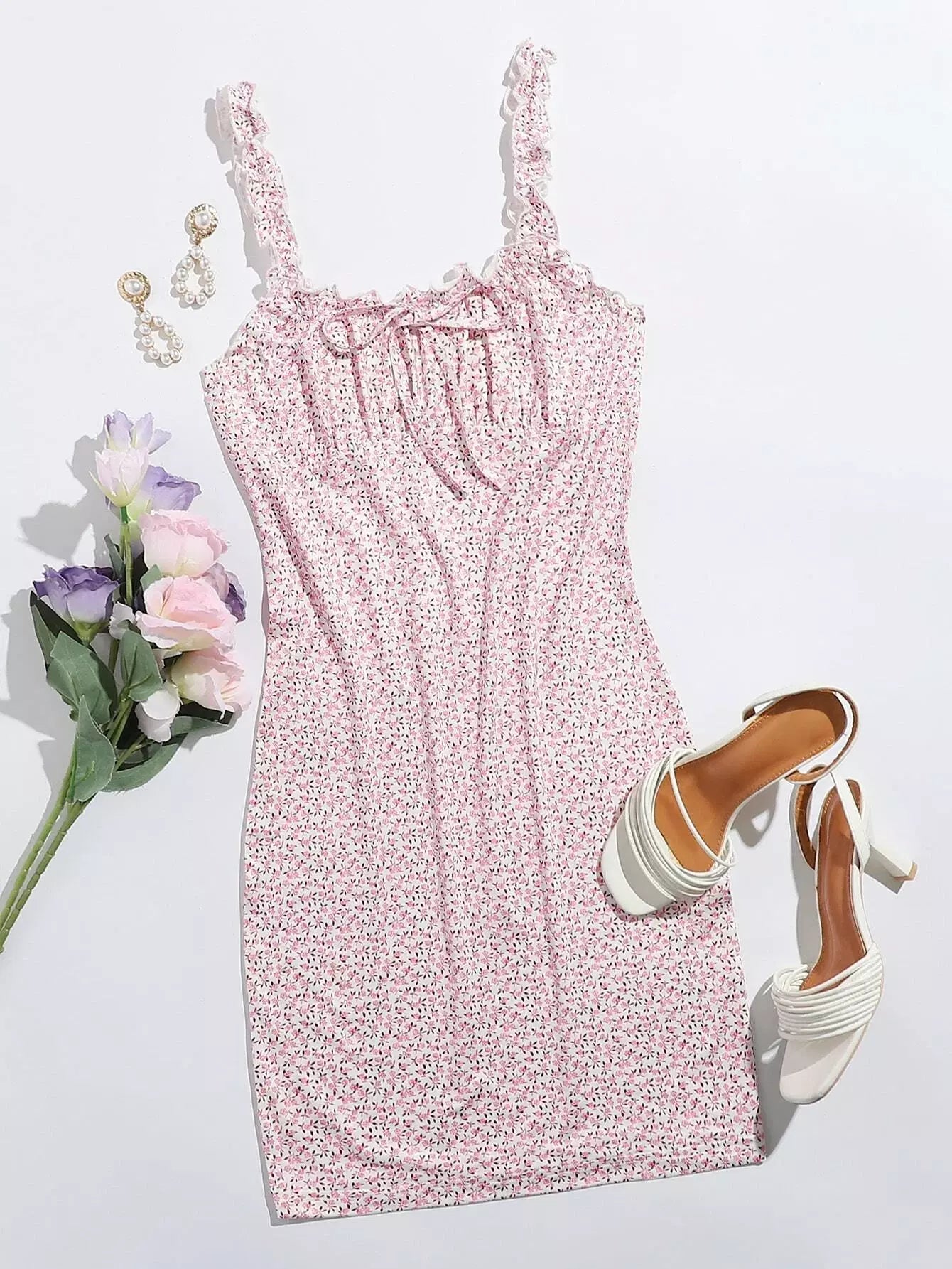 Frill Trim Strap Knot Front Ruched Bust Ditsy Floral Dress