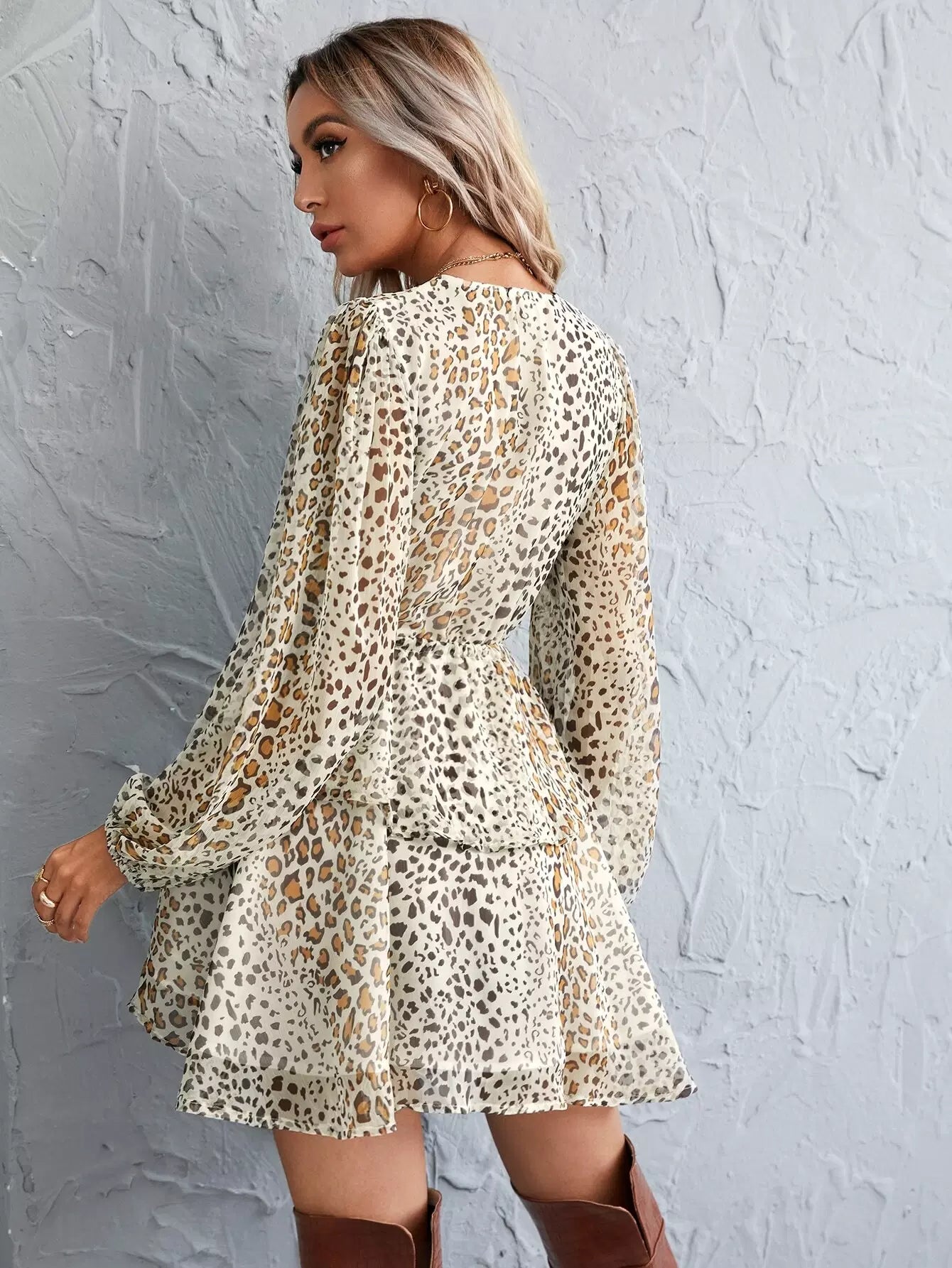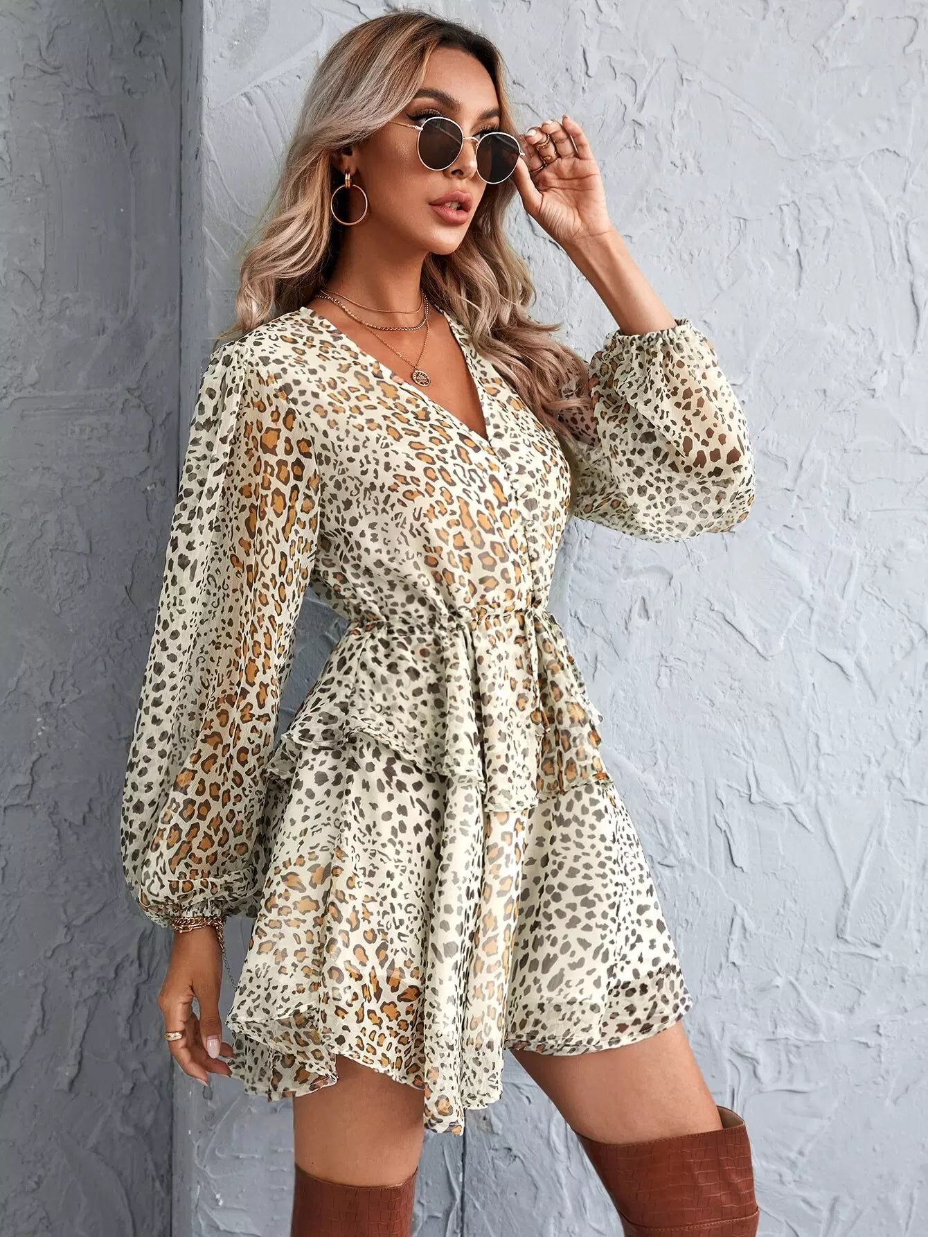Leopard Print Drawstring Waist Layered Hem Dress