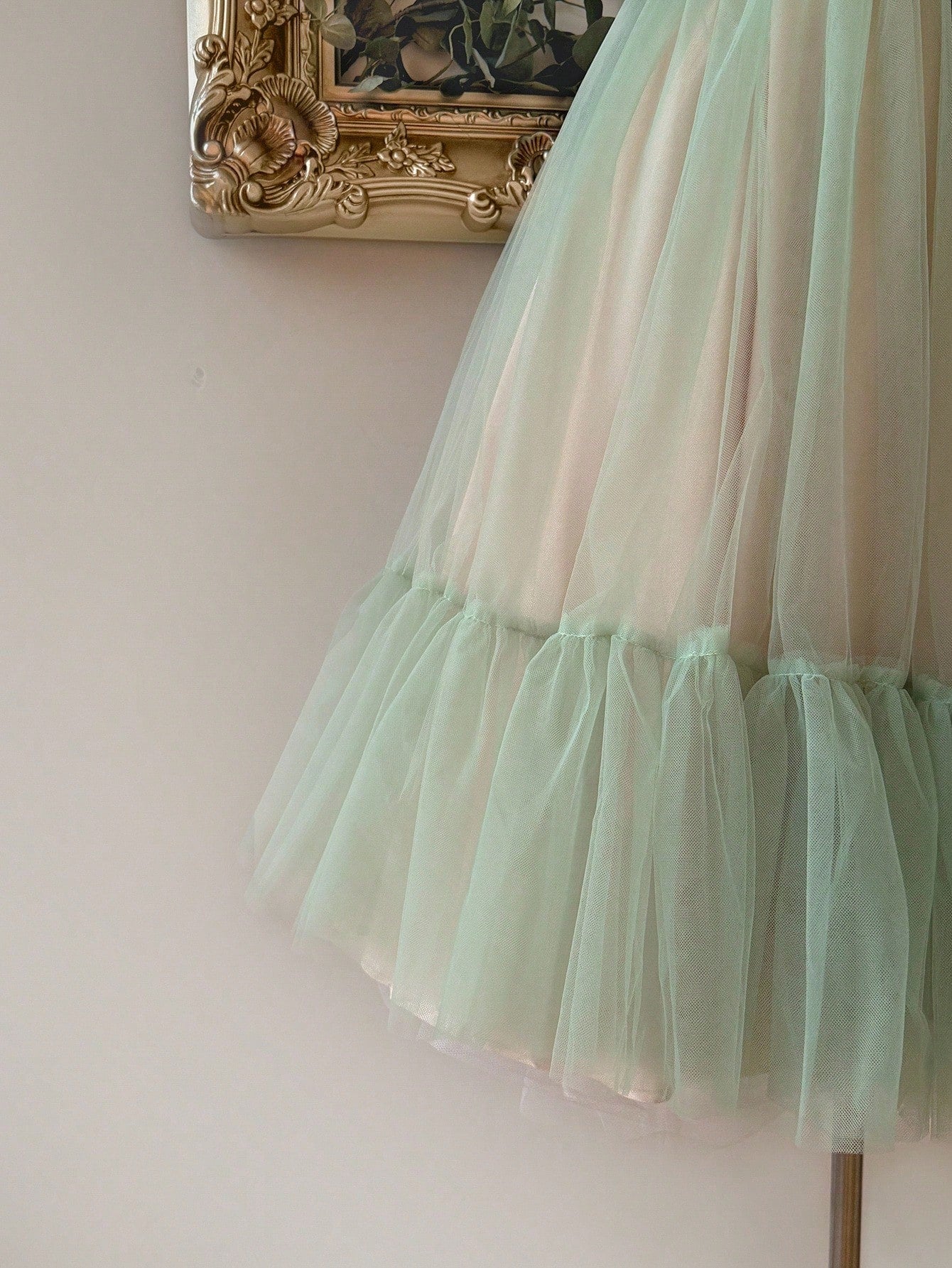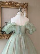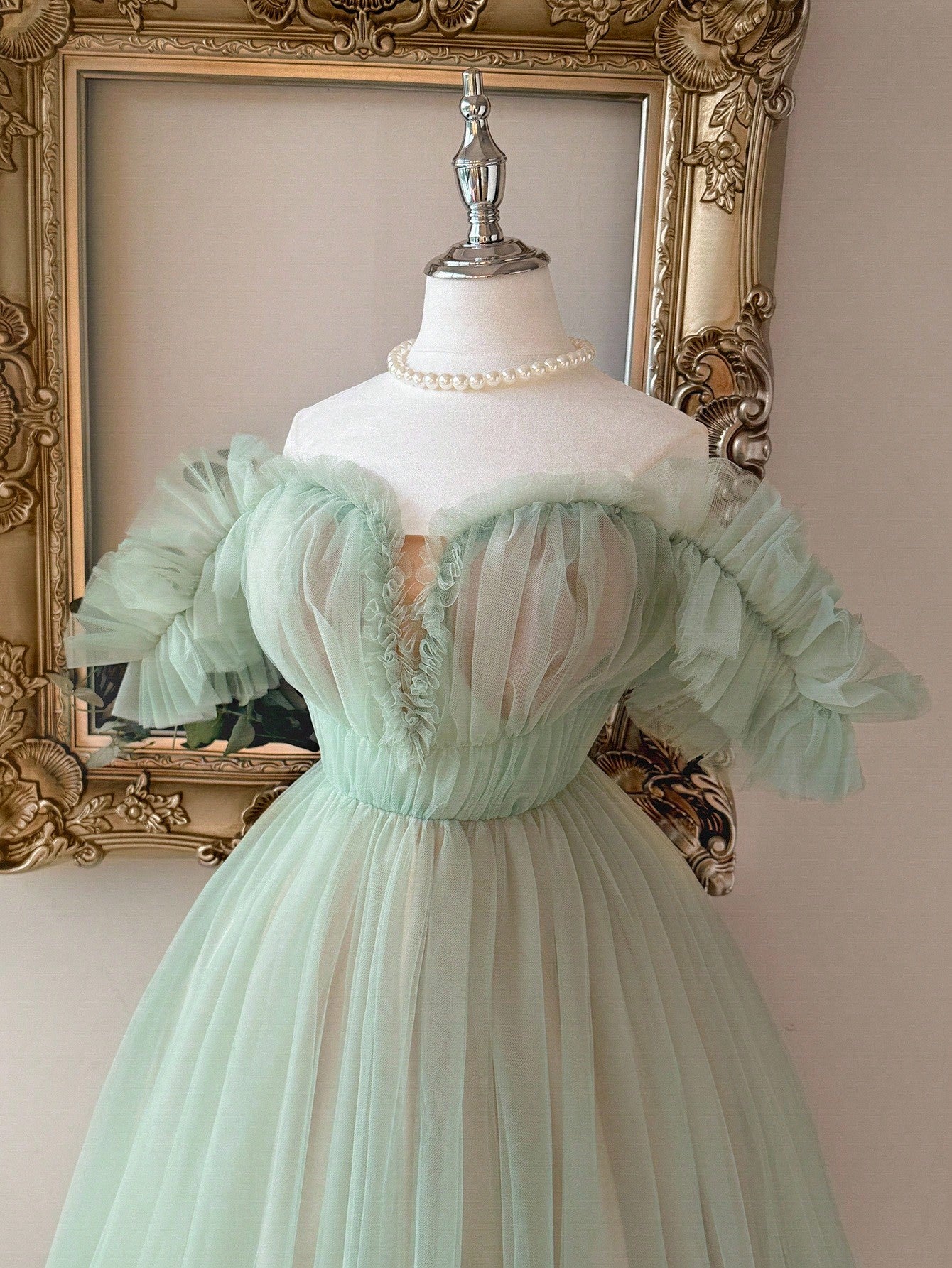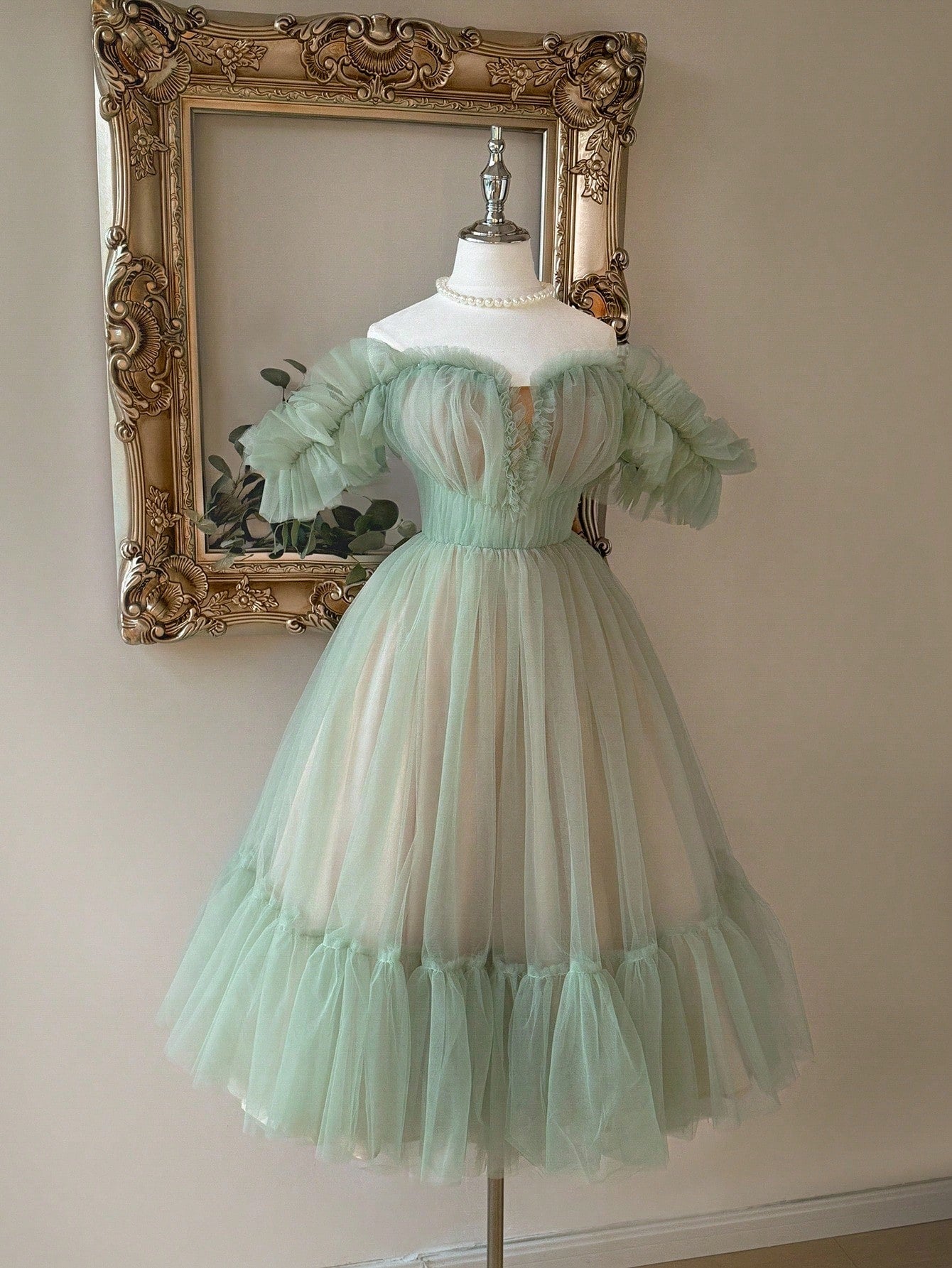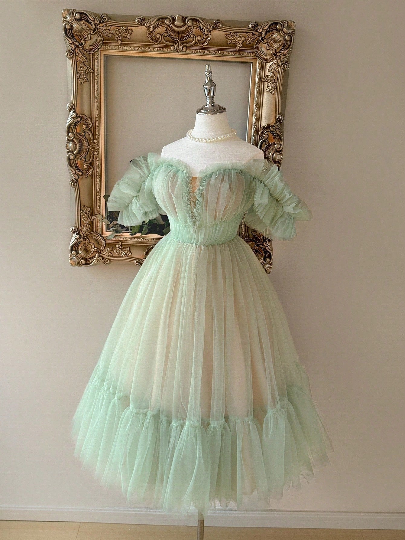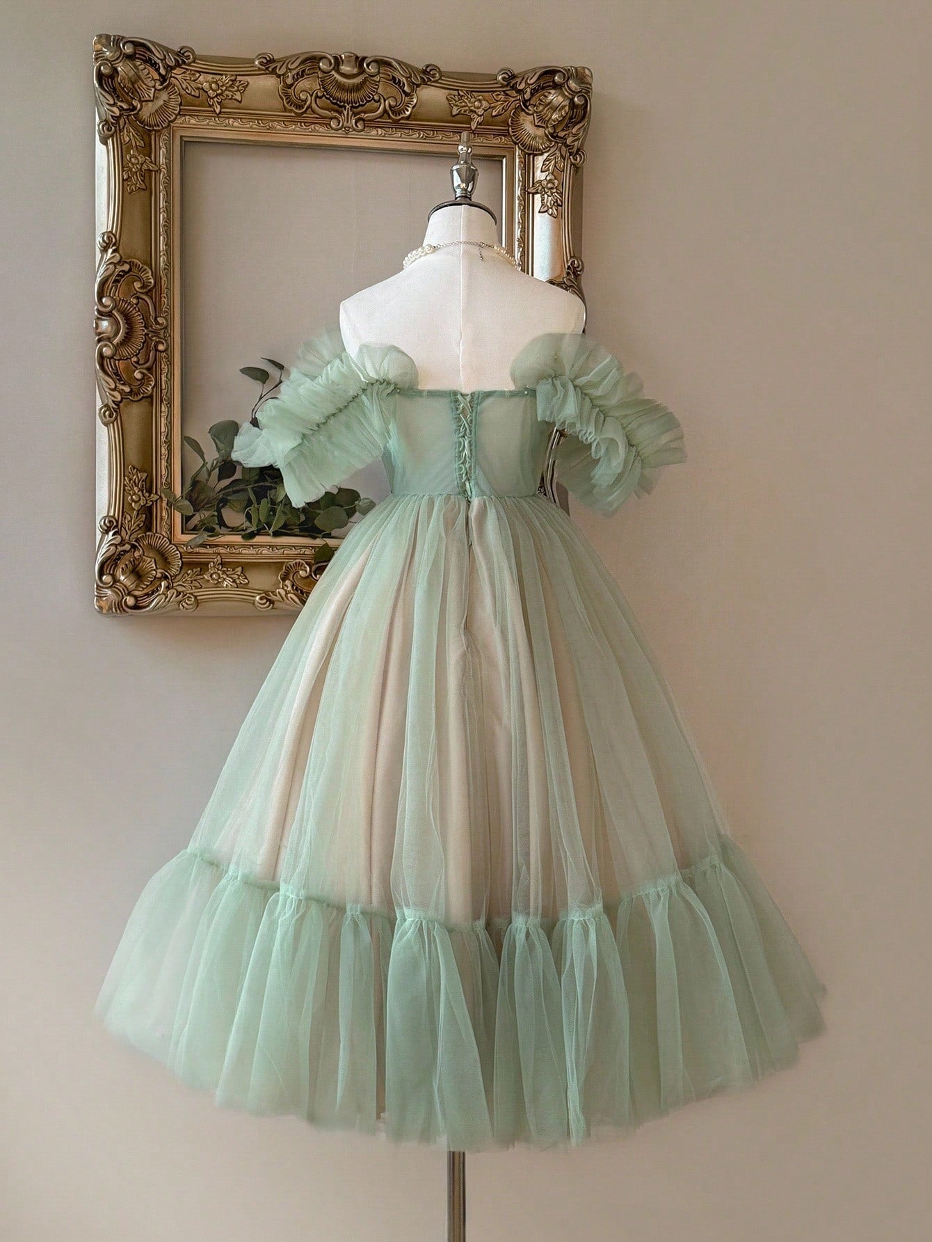 Lovelzi Elegant, Romantic, Energetic, Green, Mesh Fabric, Ruffles, One Shoulder, Waist-Length, Large