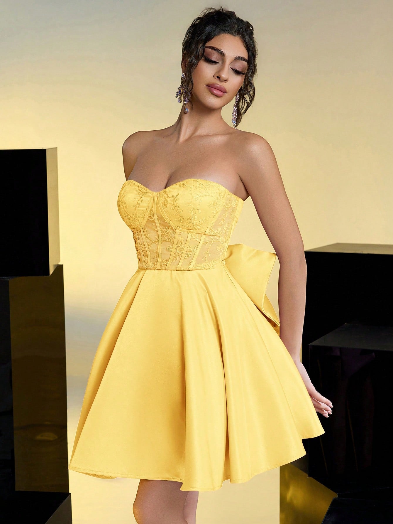Lovelzi Elegant & Sweet Strapless Romantic Sheer Sequins Lace Embroidered High Waist Slim Fit Adjustable