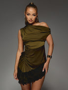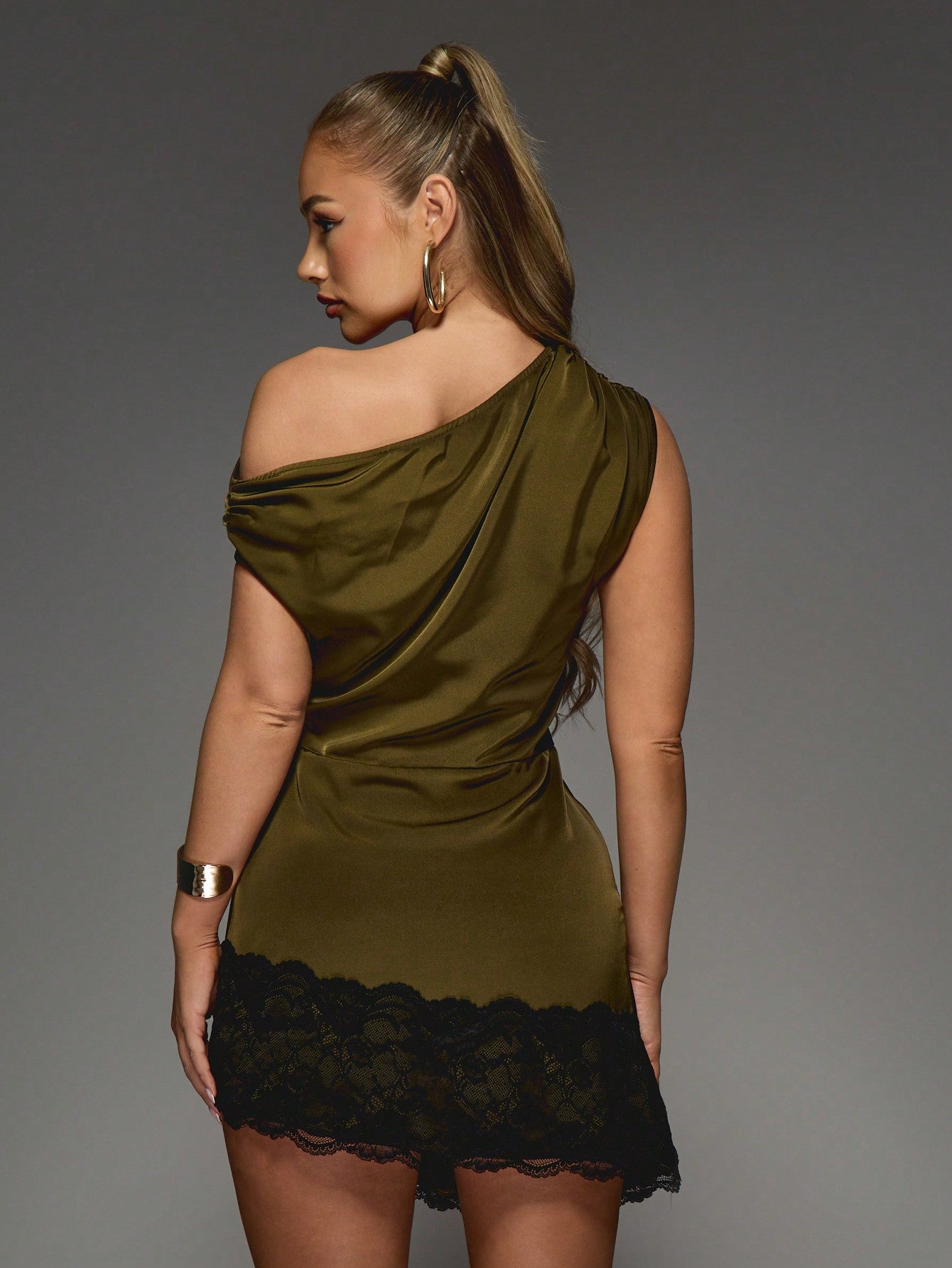 MISSGUIDED One Shoulder Draped Mini Dress With Ruched Side Asymmetric Design Black Lace Trim Satin Evening