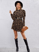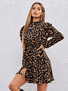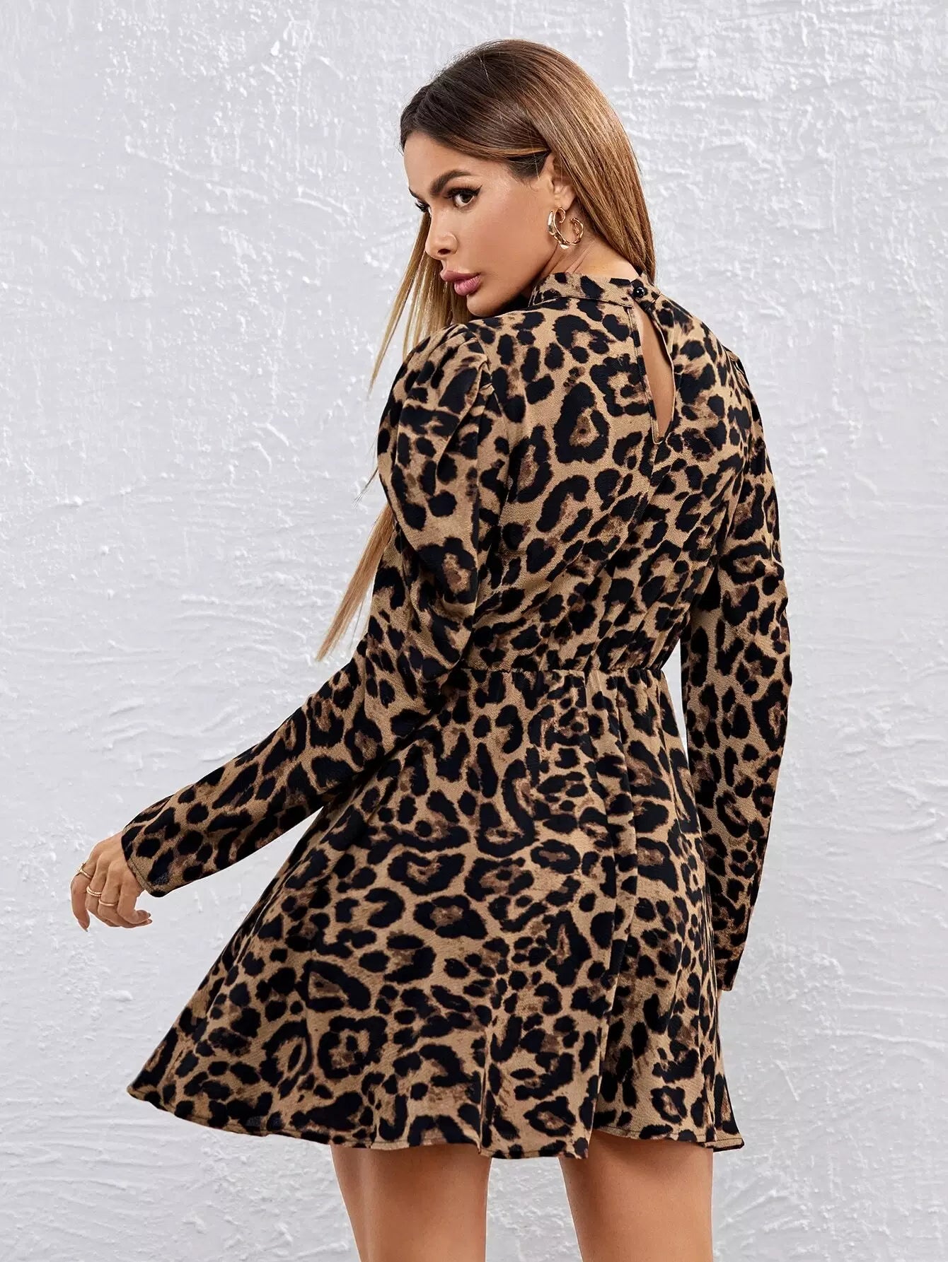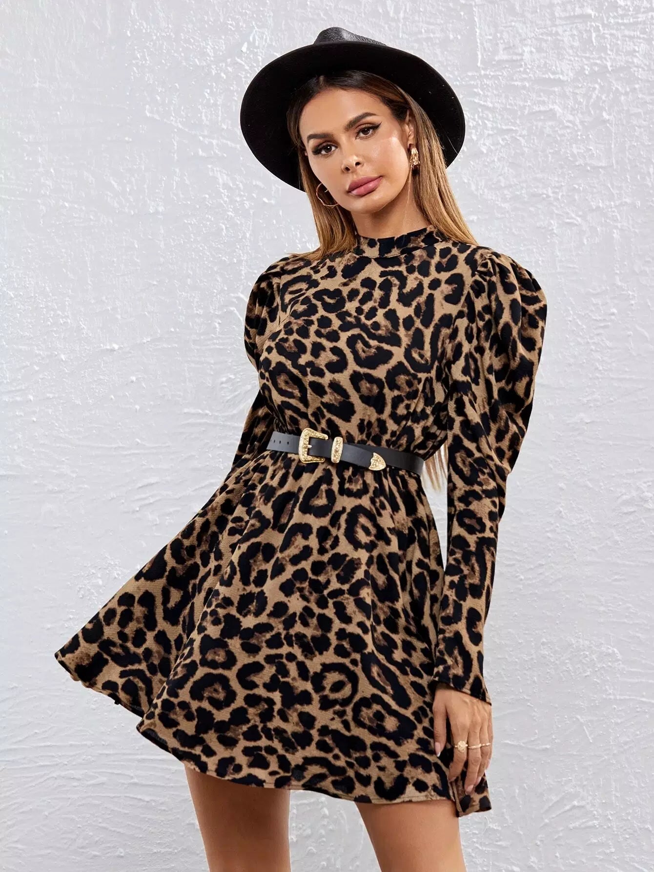 Mock-Neck Leg-of-mutton Sleeve Leopard Dress Without Belt