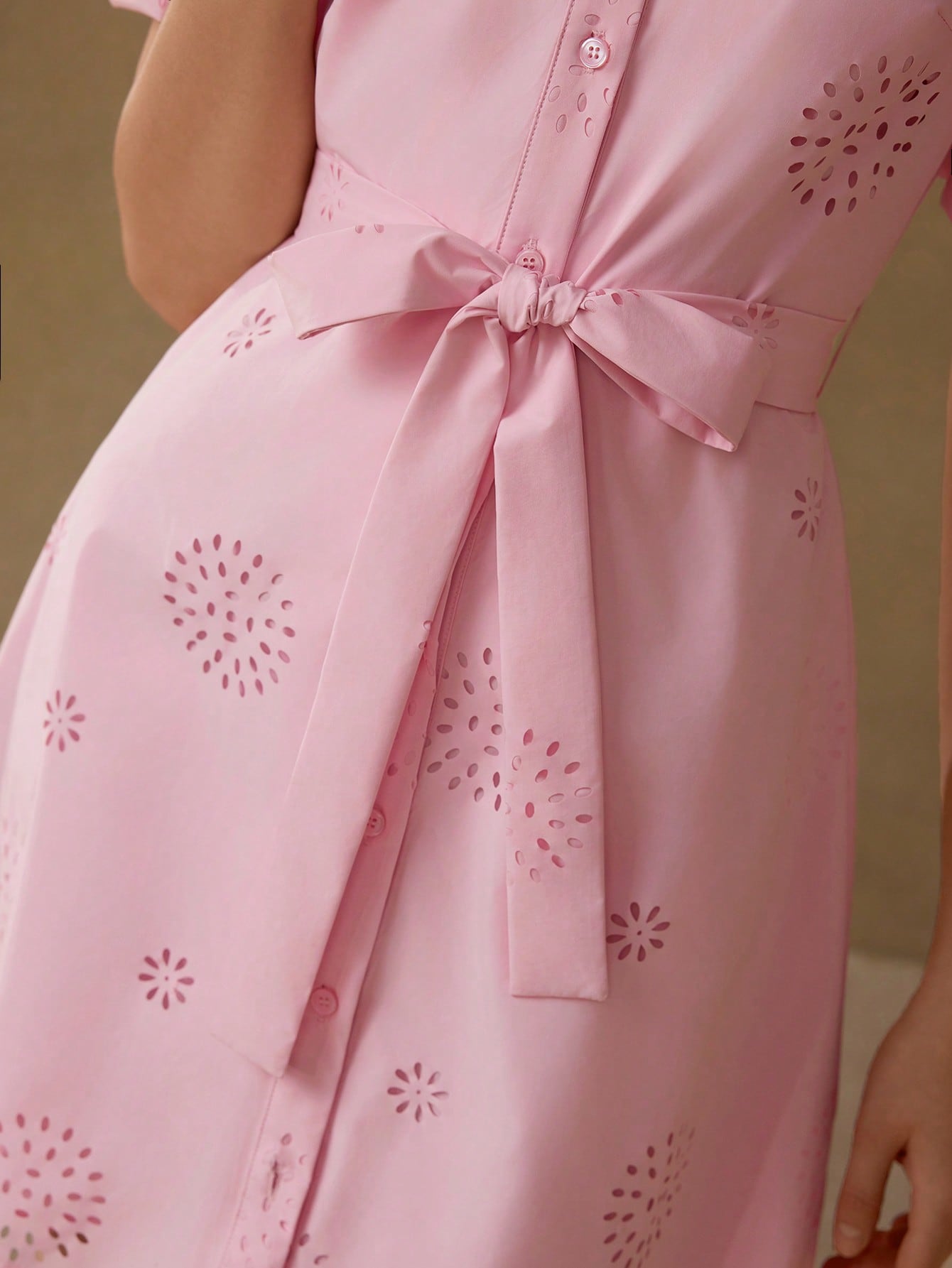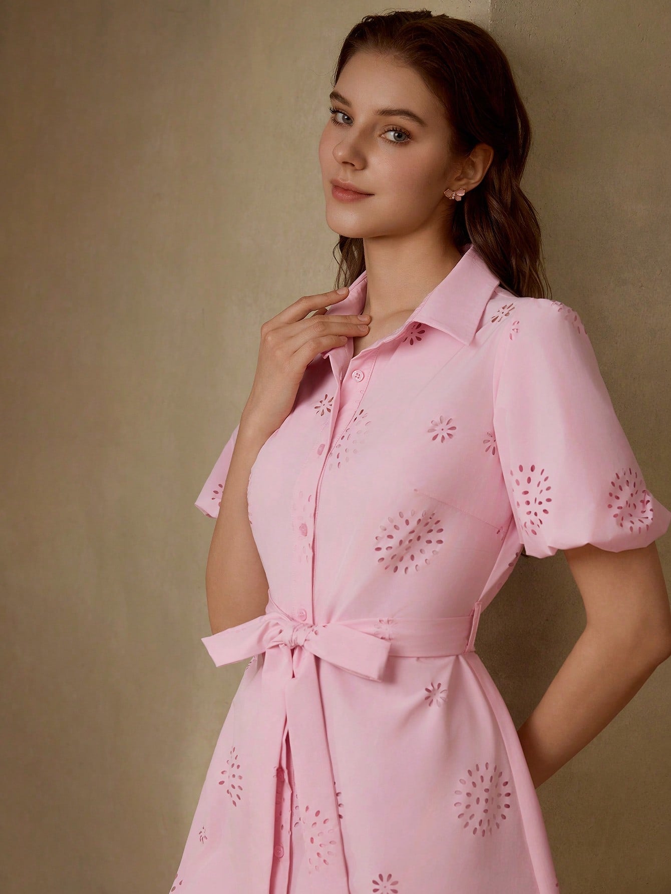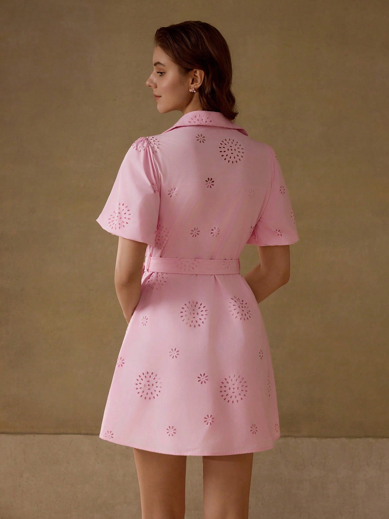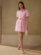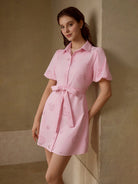 MOTF PREMIUM SOLID LASER CUT PUFF SLEEVE BELTED SHIRT SHORT DRESS