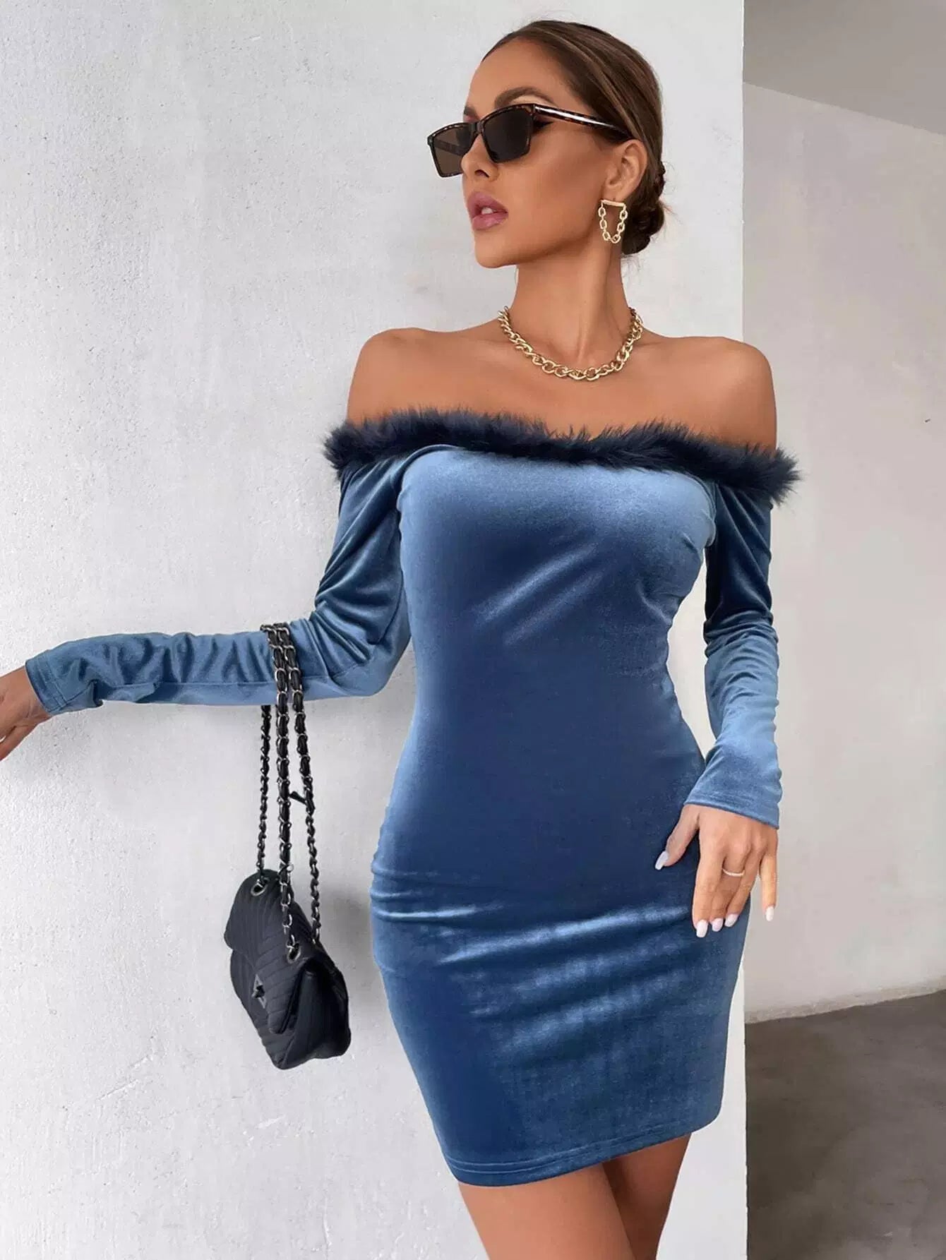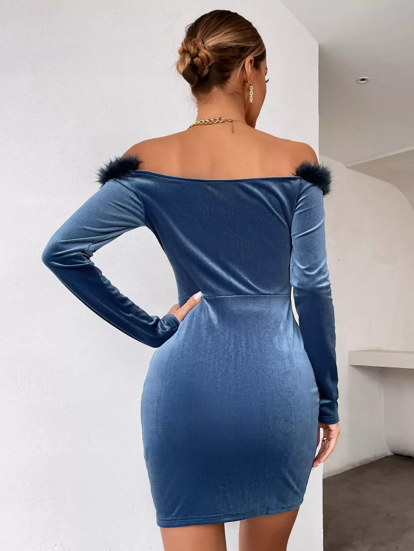 Off Shoulder Fuzzy Trim Velvet Bodycon Dress