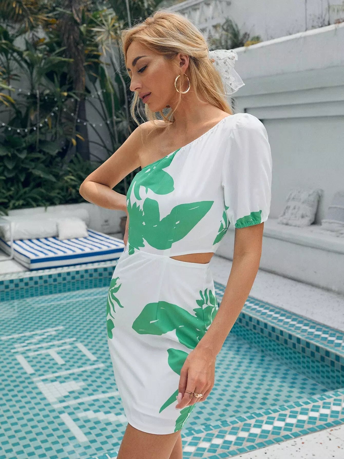 One Shoulder Puff Sleeve Cut-out Floral Dress