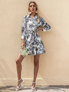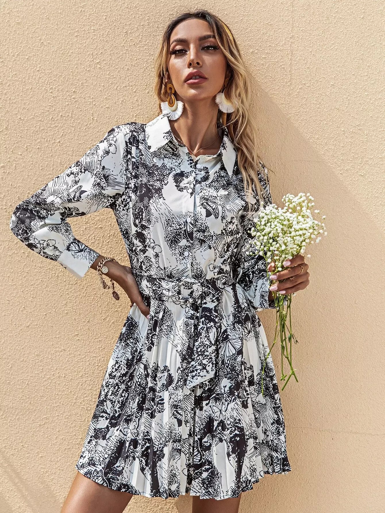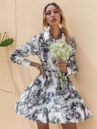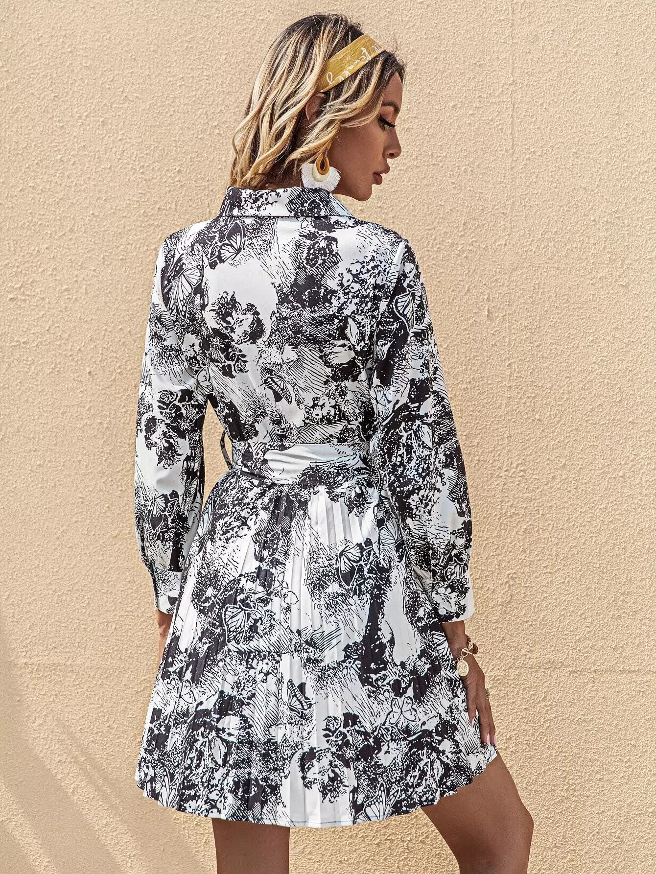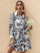 Painting Print Button Front Pleated Dress Without Belt