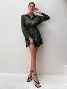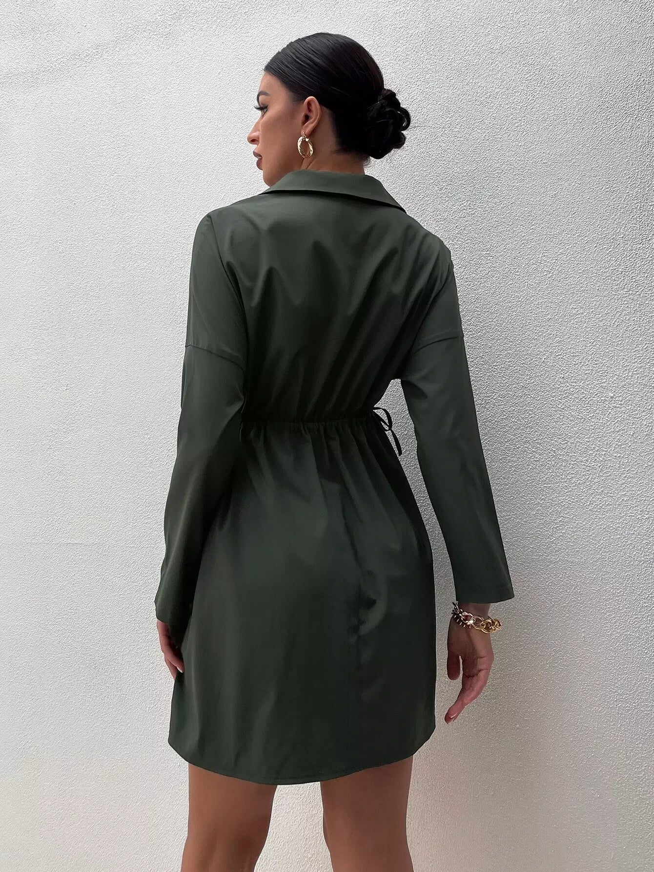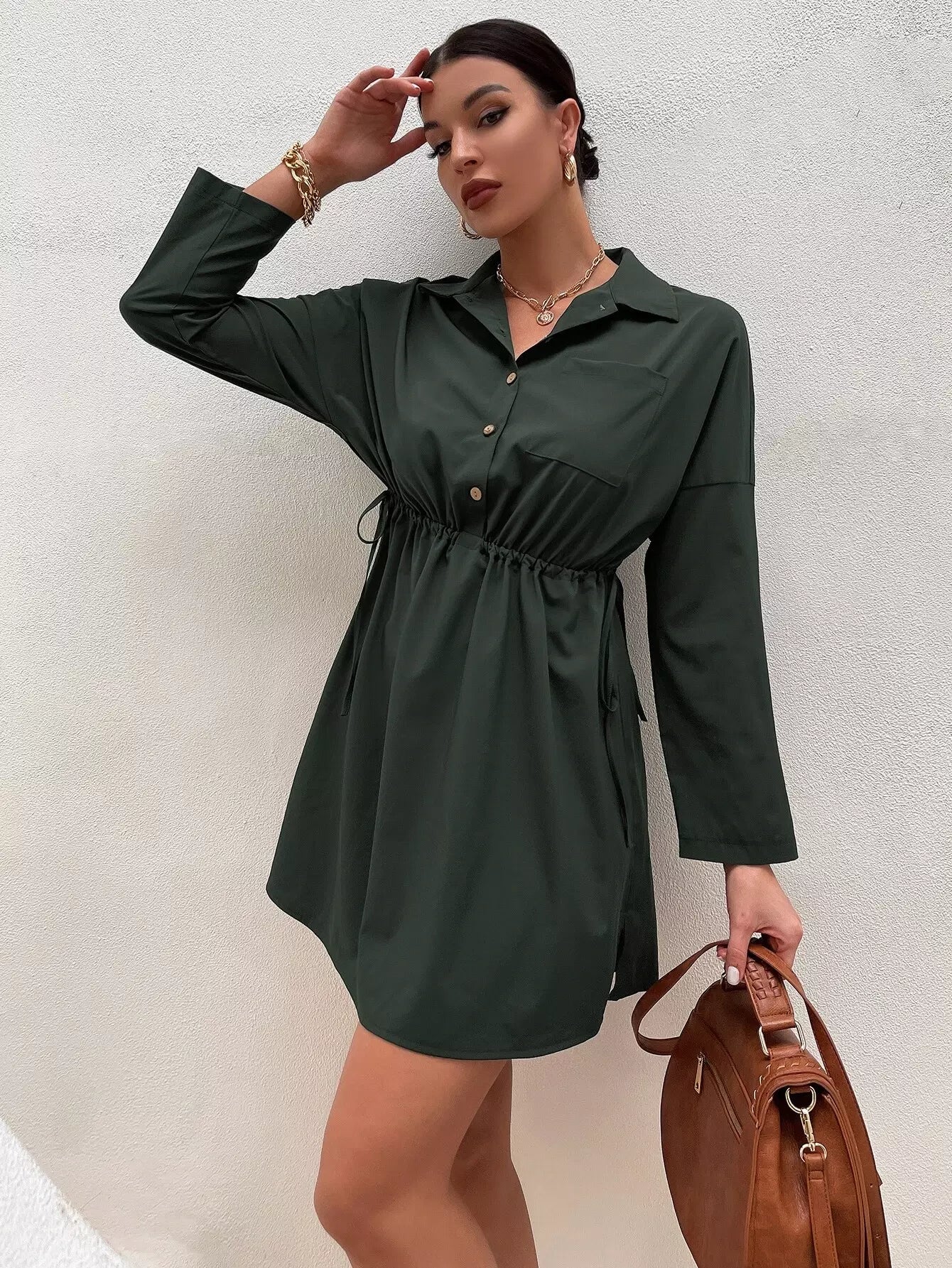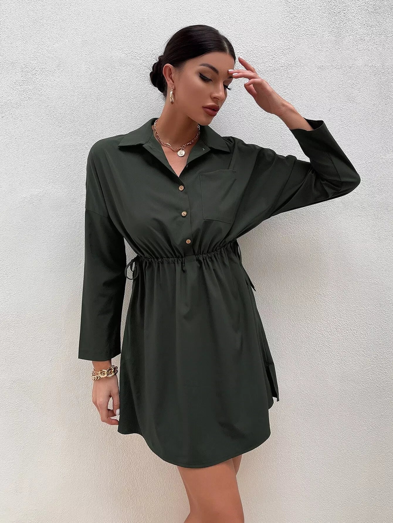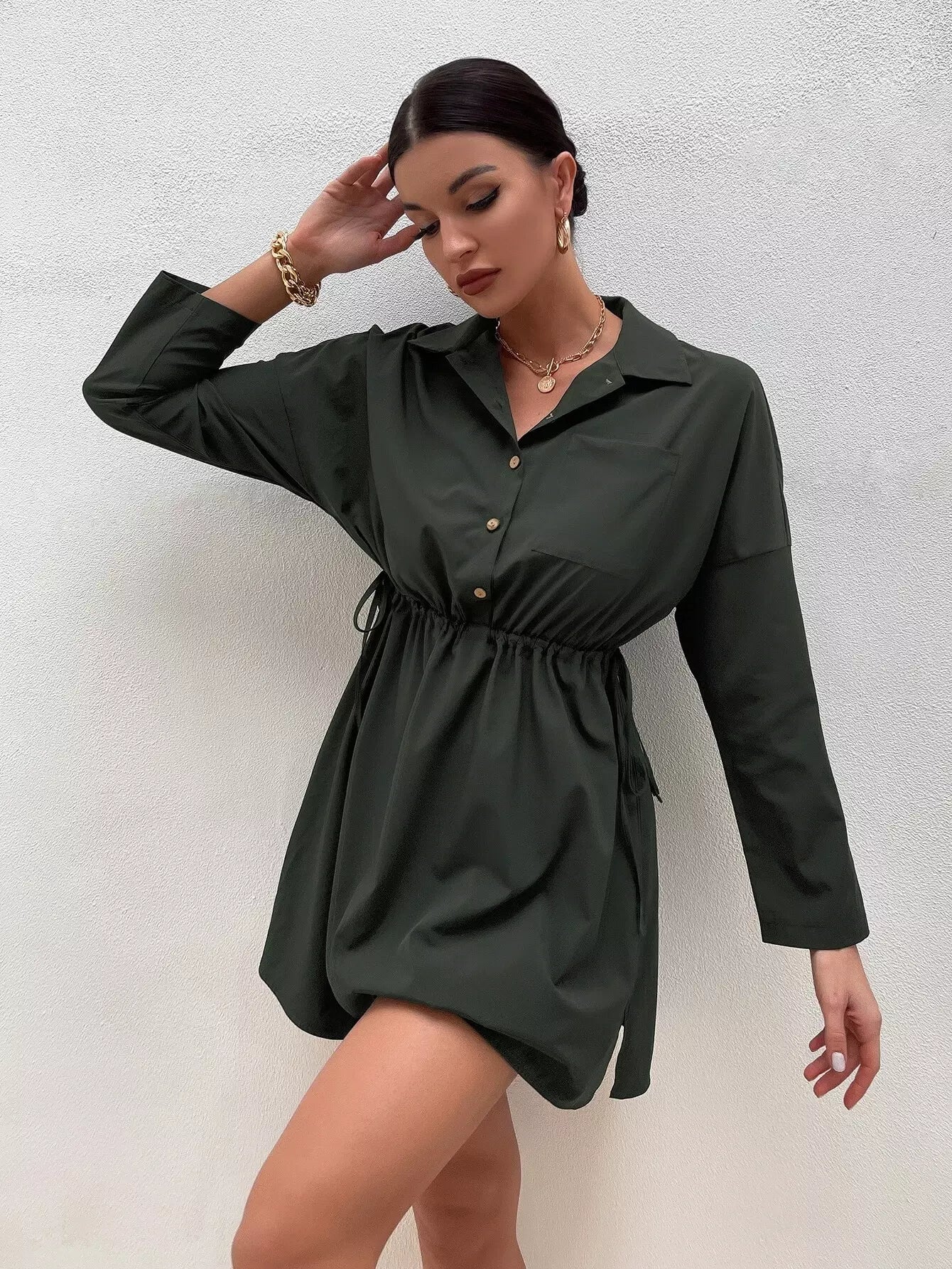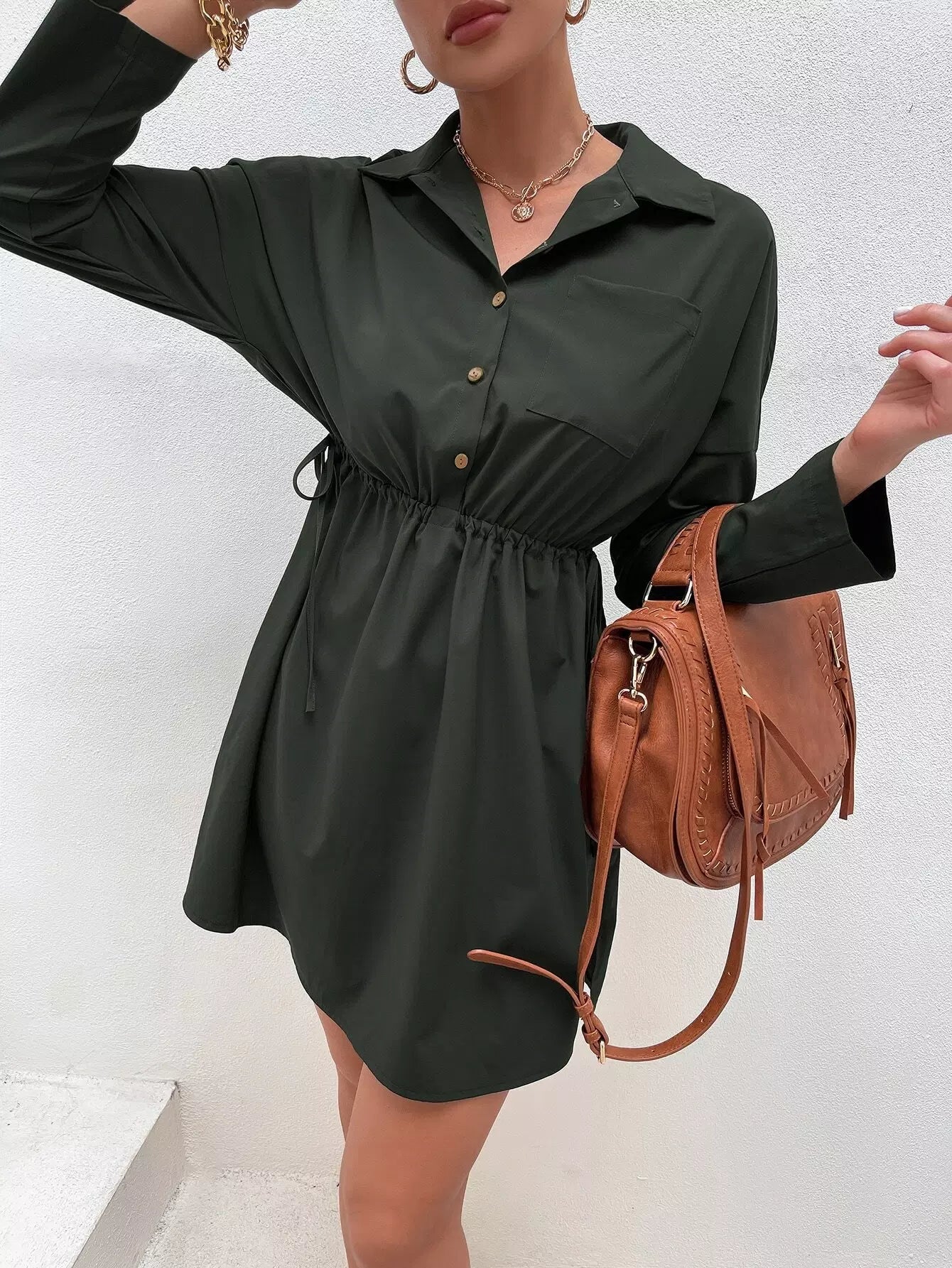 Patched Pocket Drop Shoulder Drawstring Waist Dress