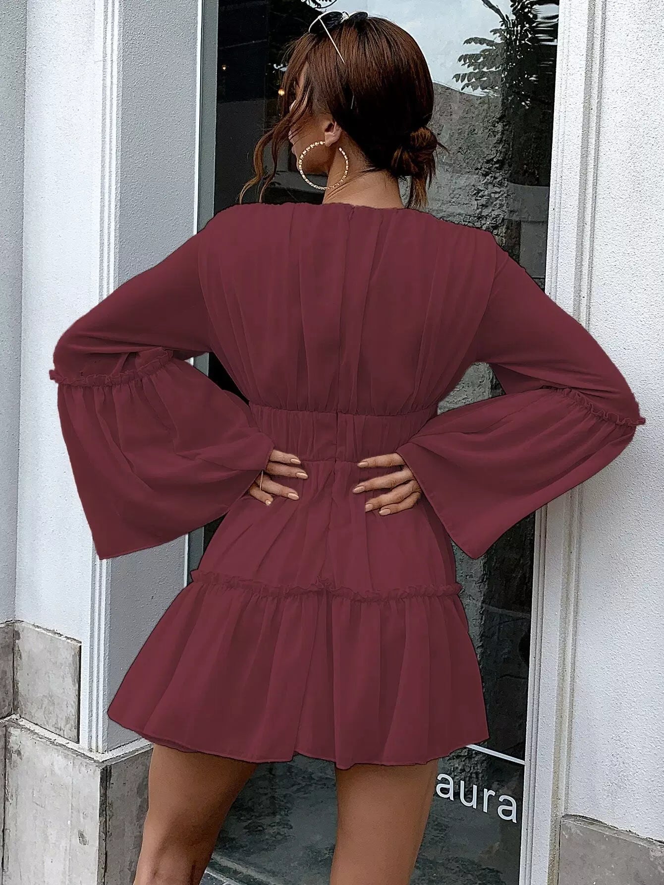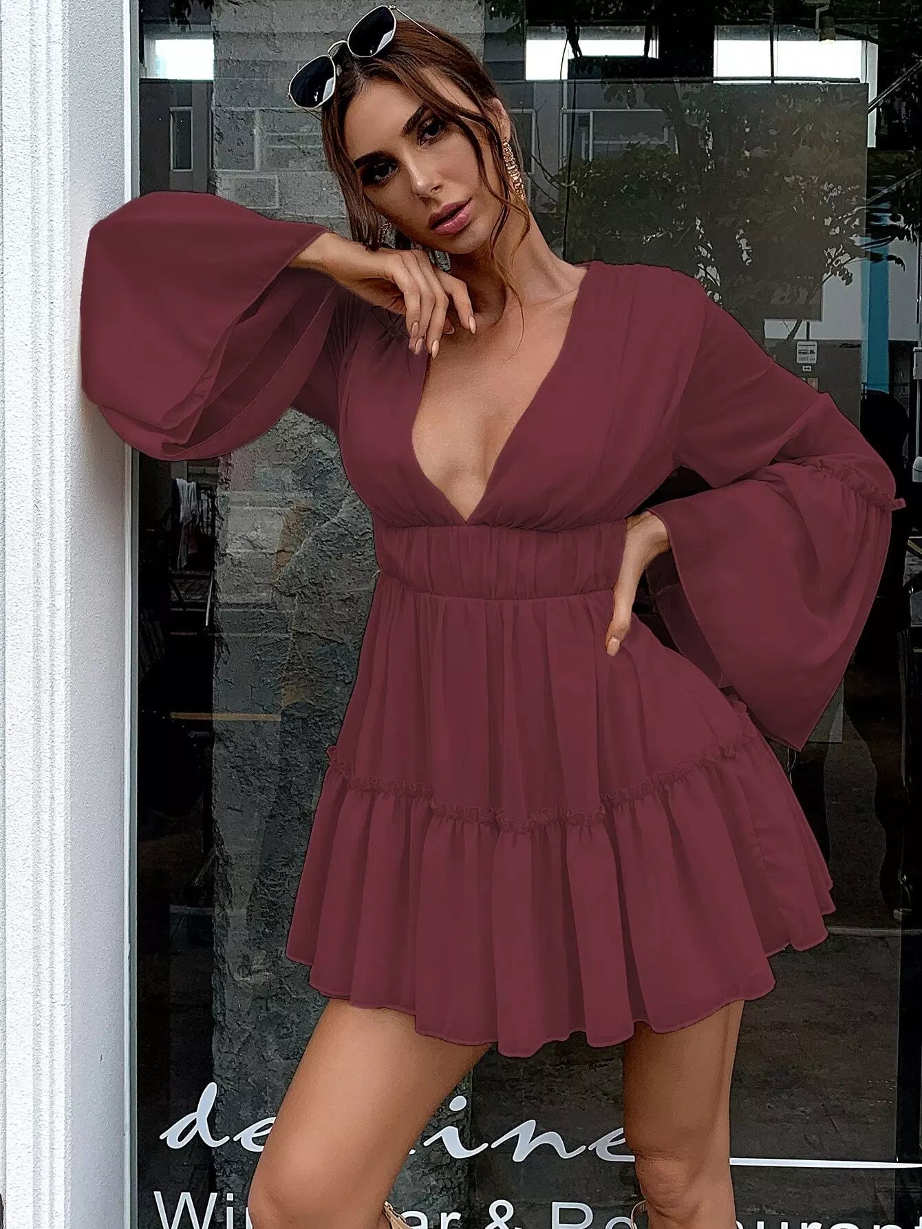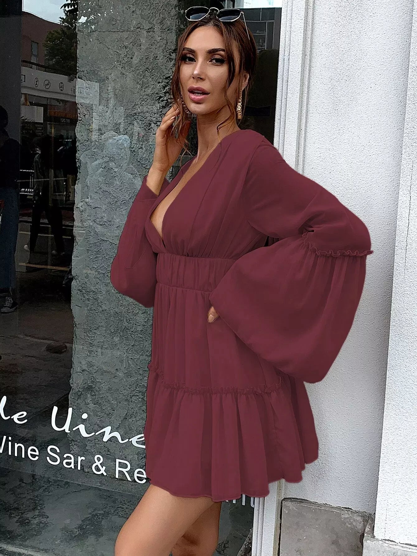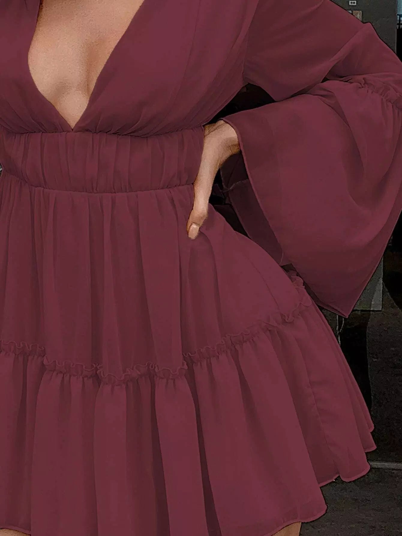 Plunging Neck Bell Sleeve Tiered Ruffle Dress