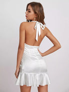 Plunging Neck Tied Backless Ruched Allover Print Dress