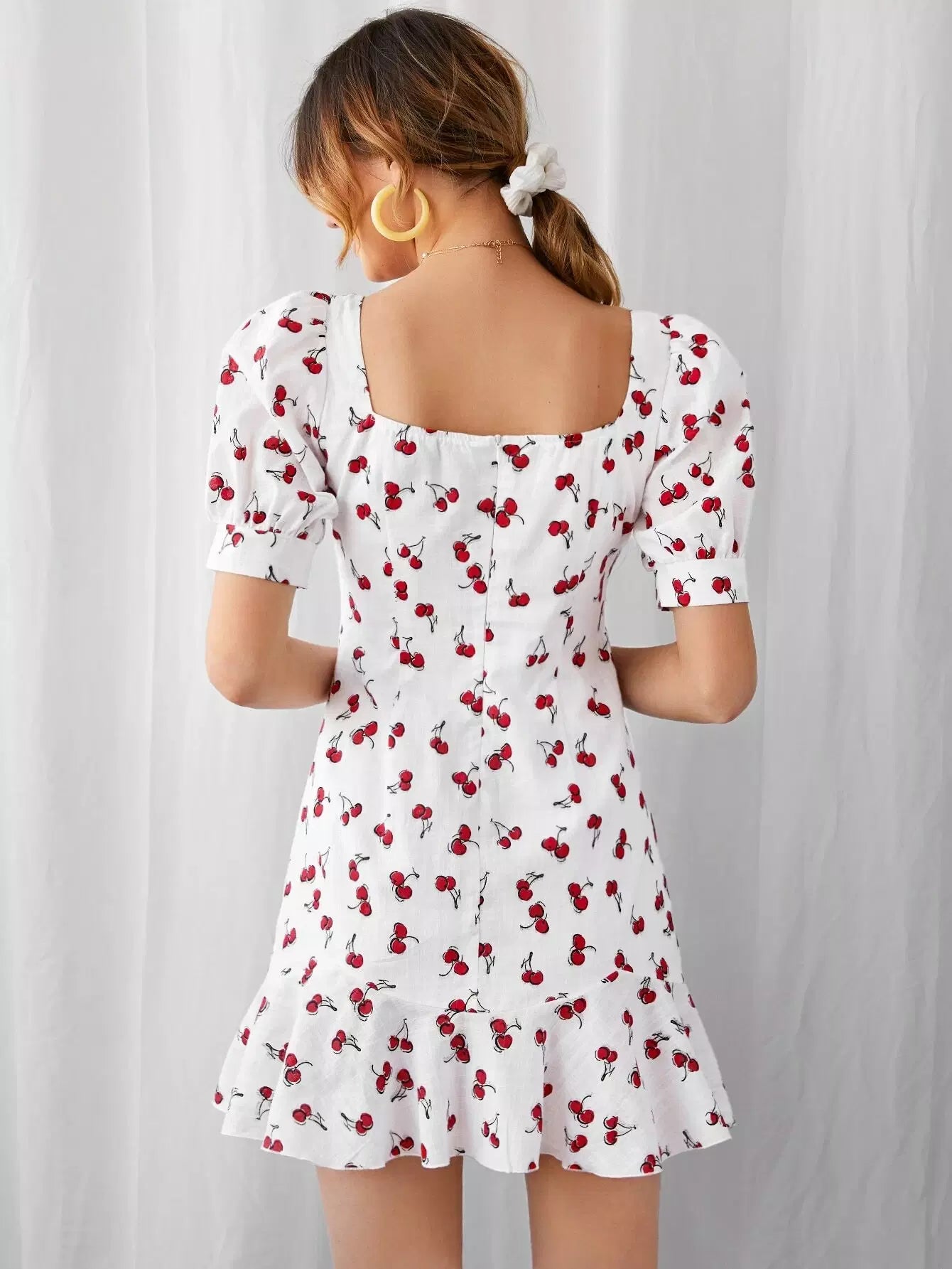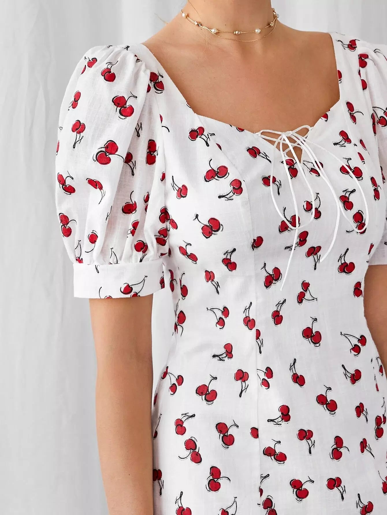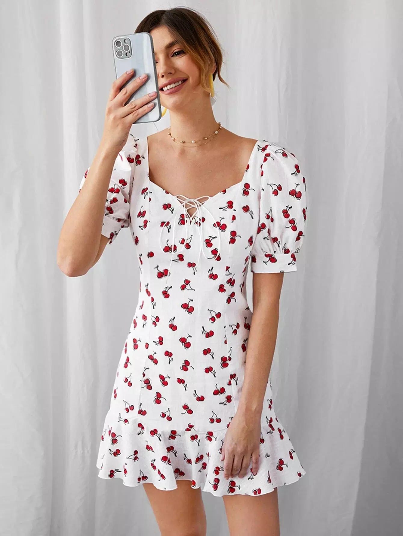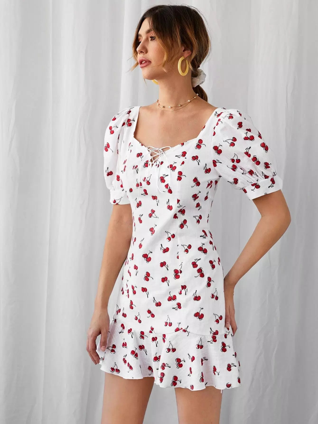 Puff Sleeve Lace Up Front Ruffle Hem Allover Cherry Print Dress