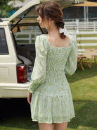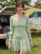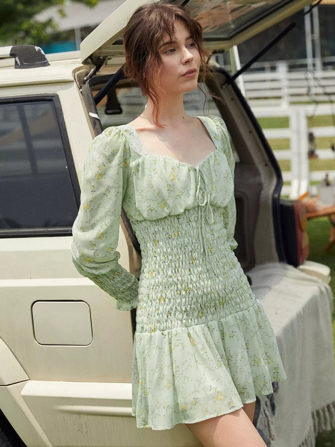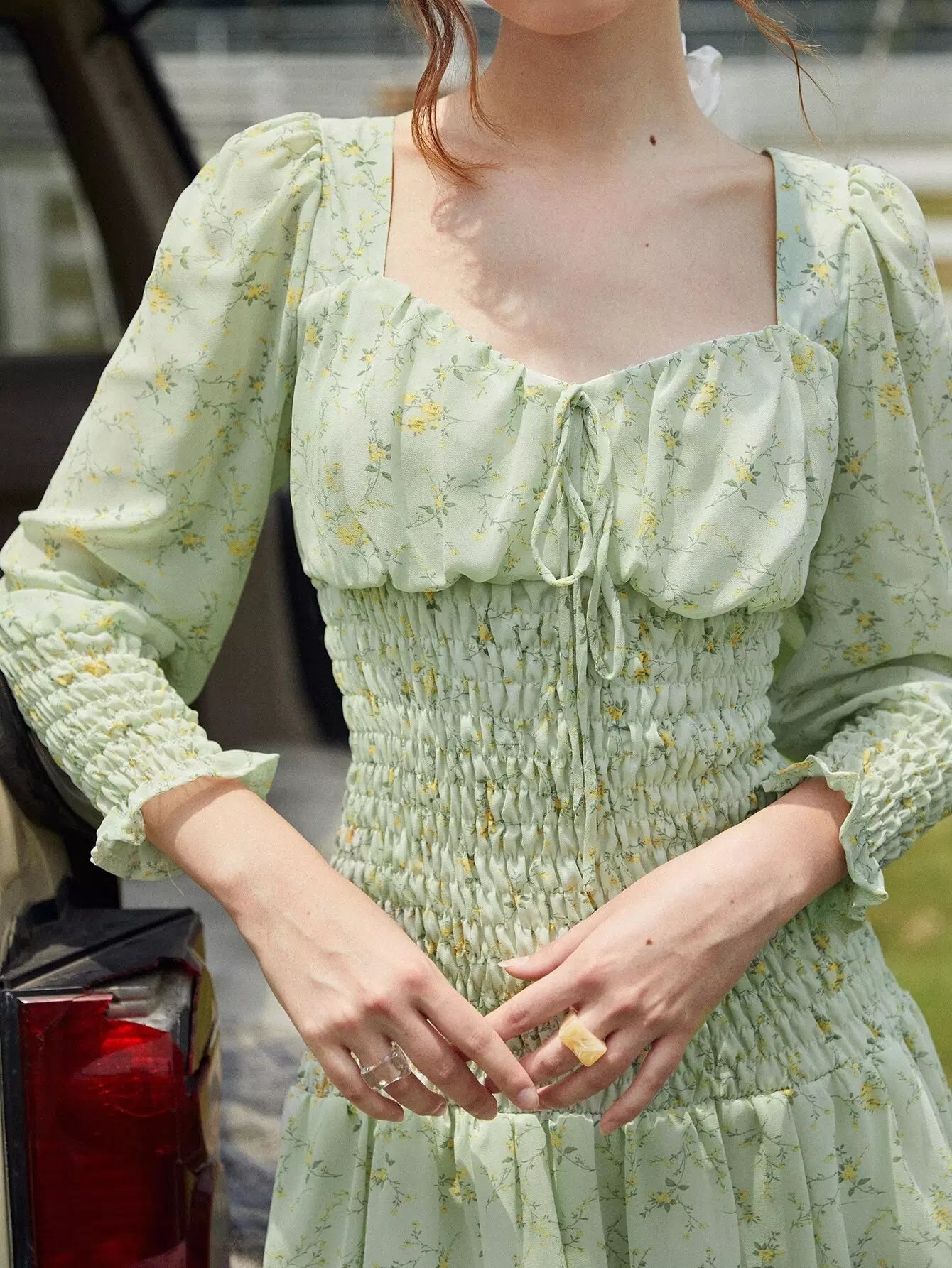 Ruched Bust Shirred Ruffle Hem Floral Dress