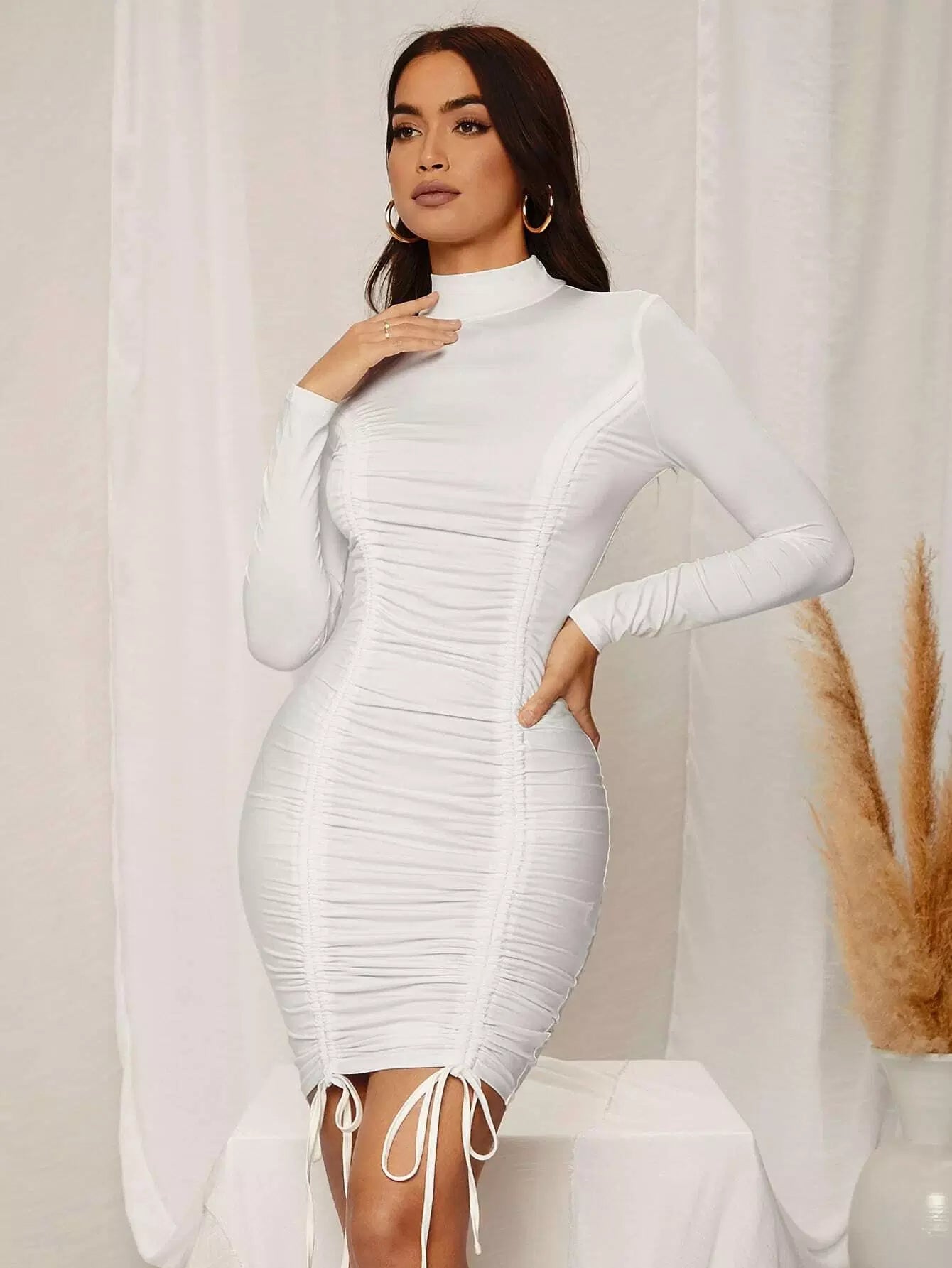 Ruched Drawstring Front Mock Neck Bodycon Dress