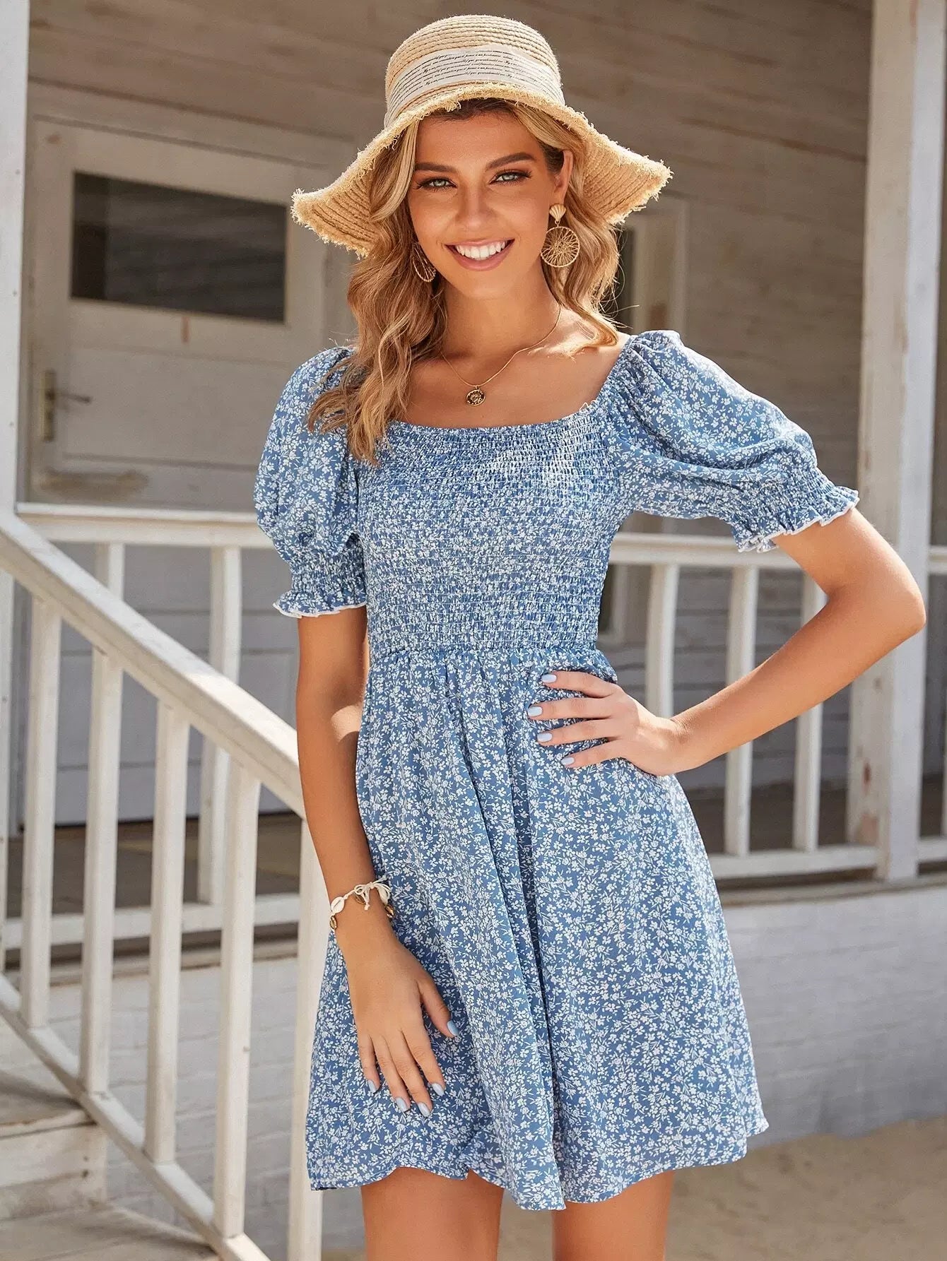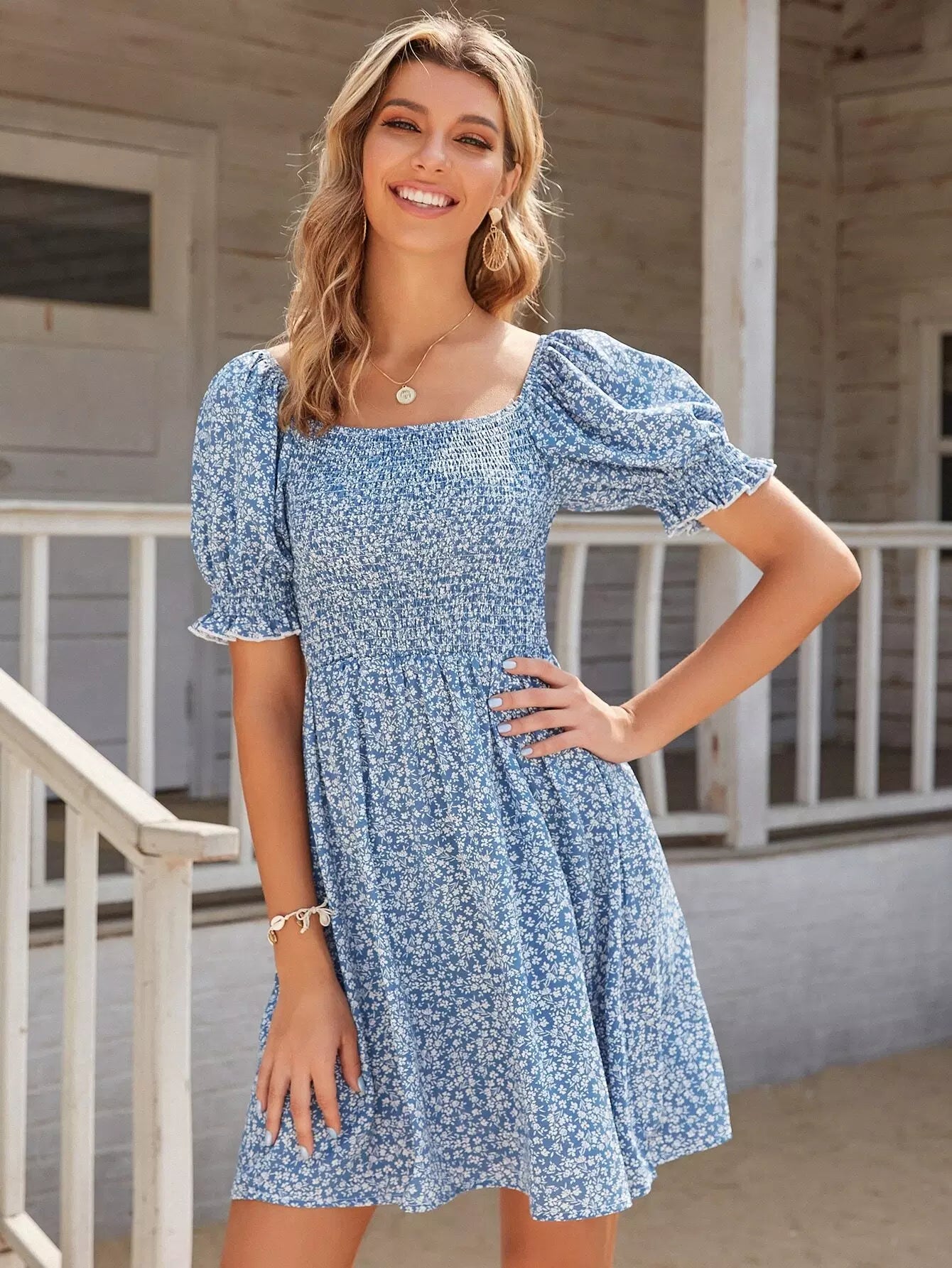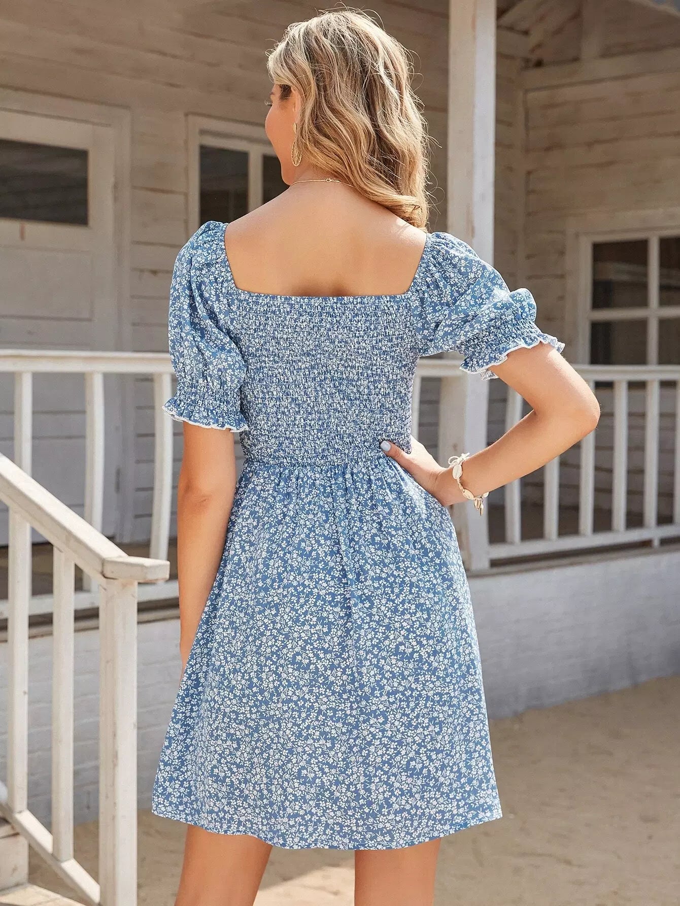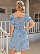 Square Neck Shirred Bodice Ditsy Floral Dress