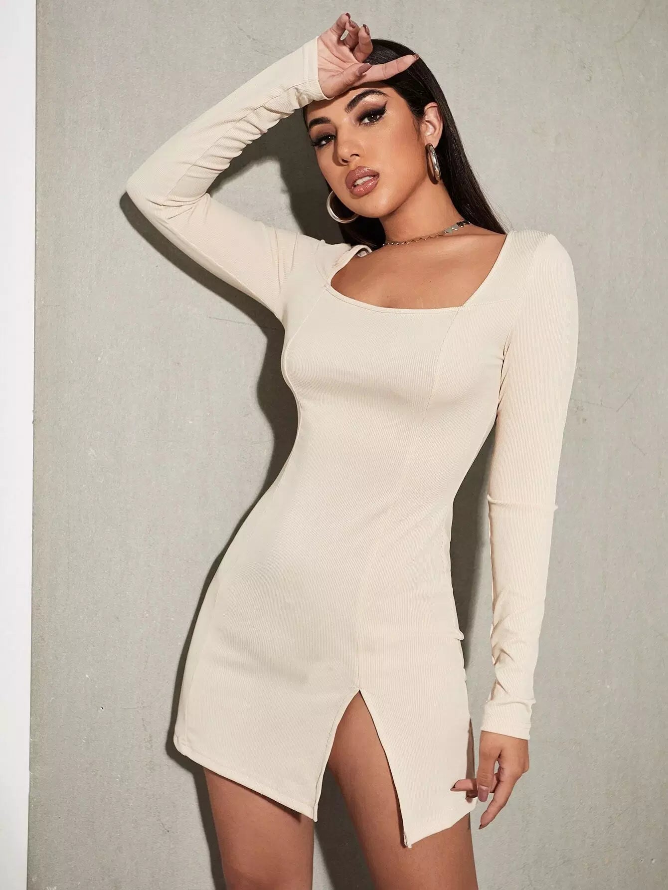 Square Neck Slit Hem Rib-knit Dress