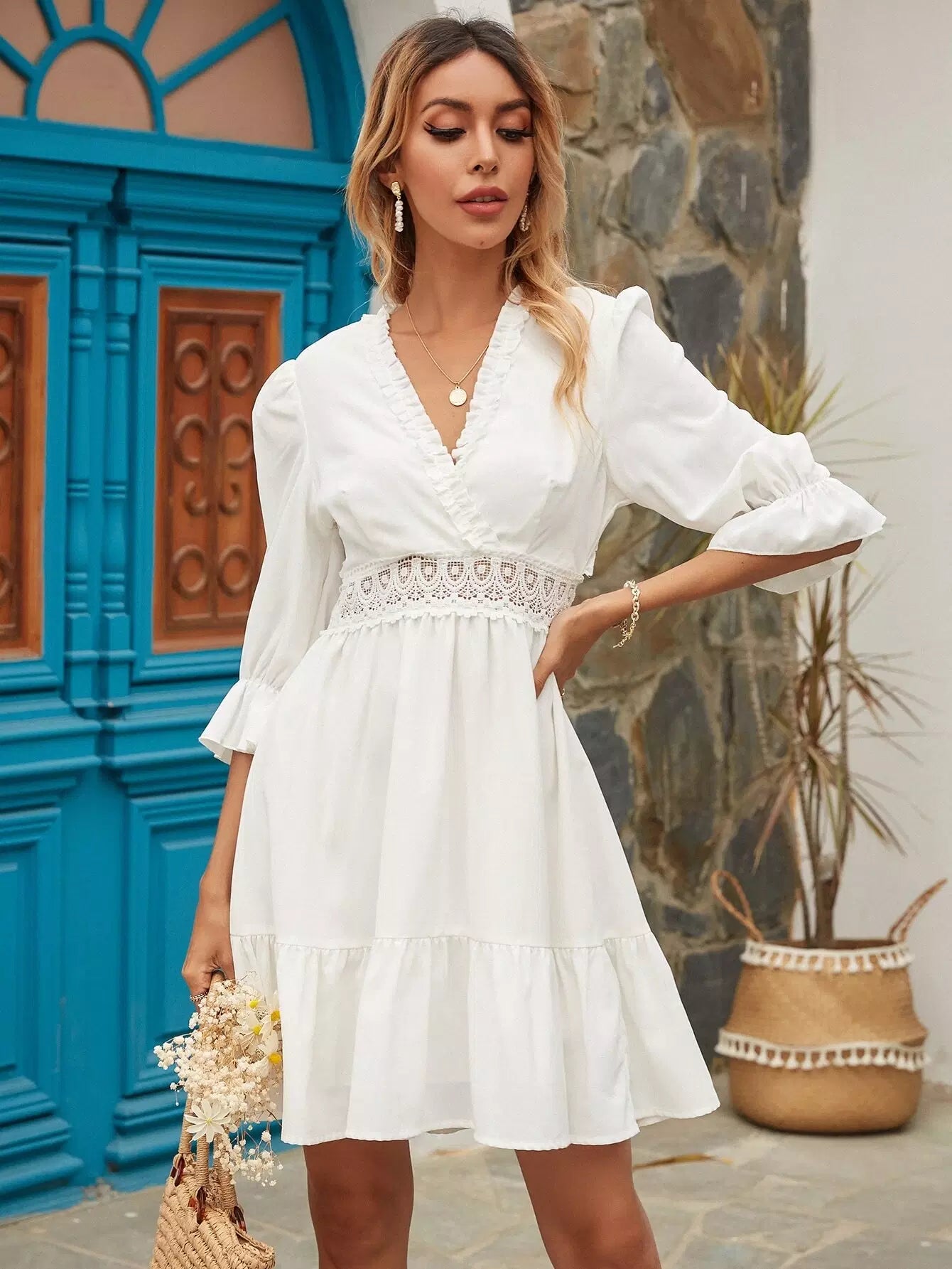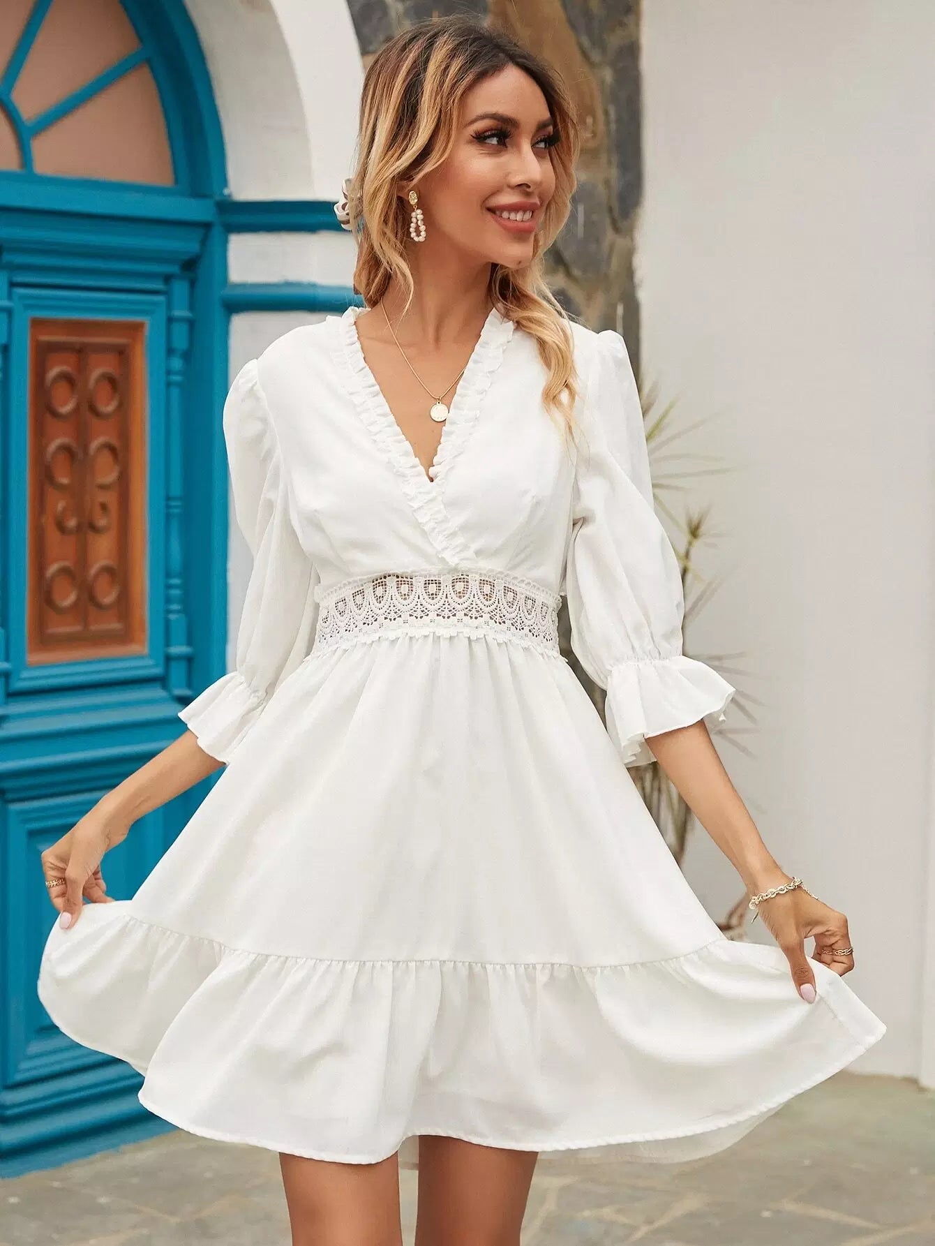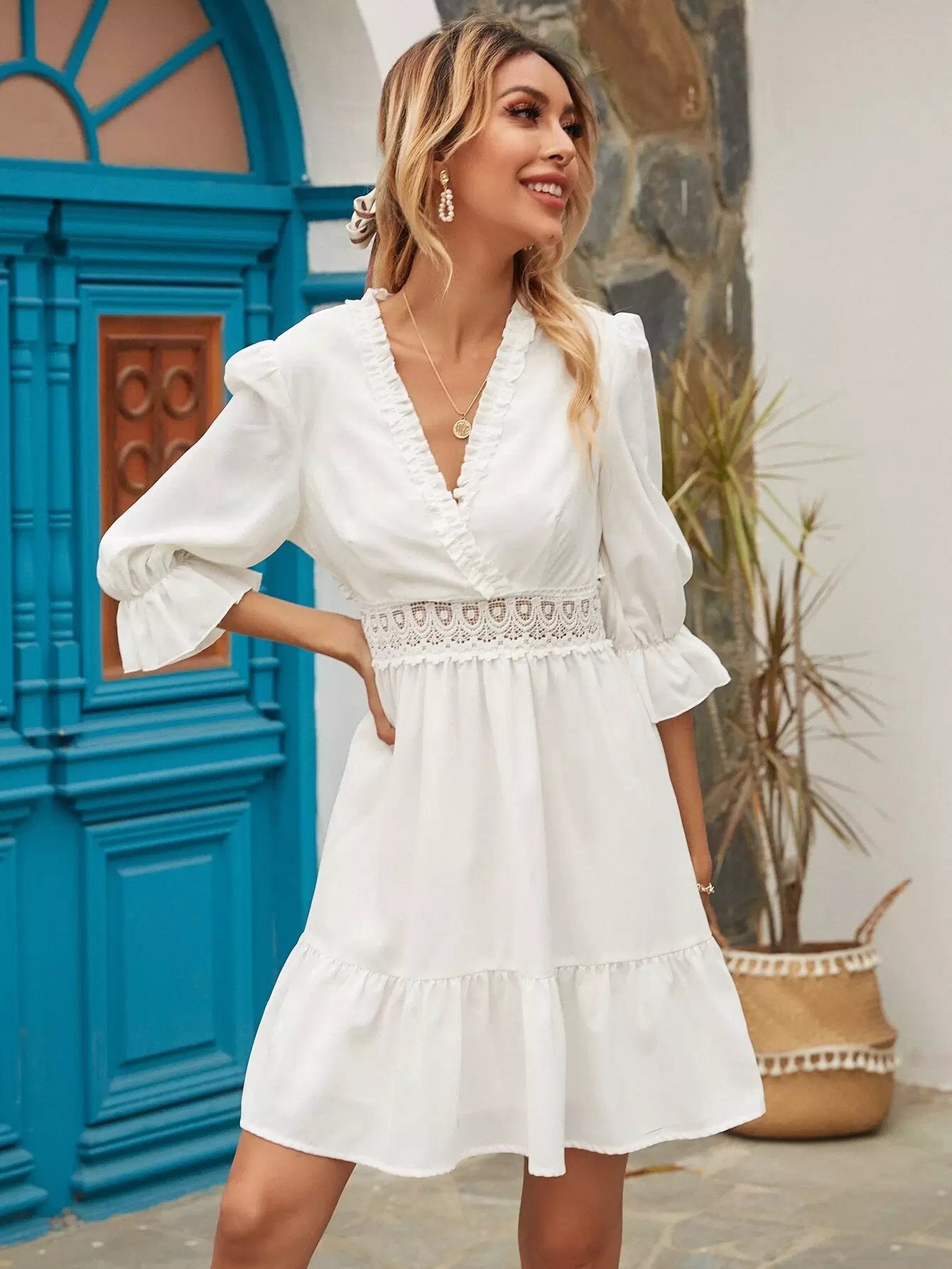 Surplice Front Contrast Lace Ruffle Hem Dress