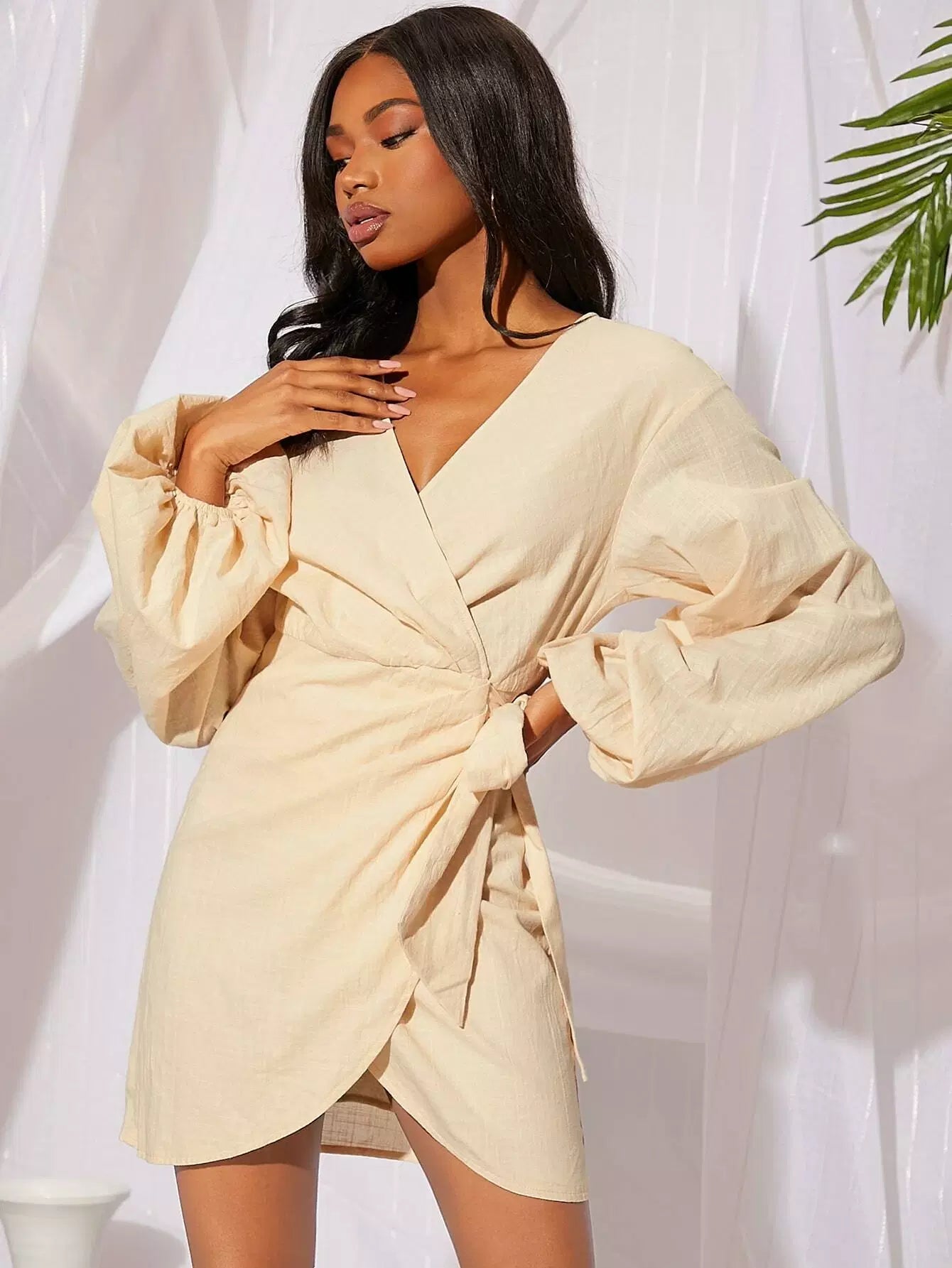 Surplice Neck Knot Side Lantern Sleeve Dress