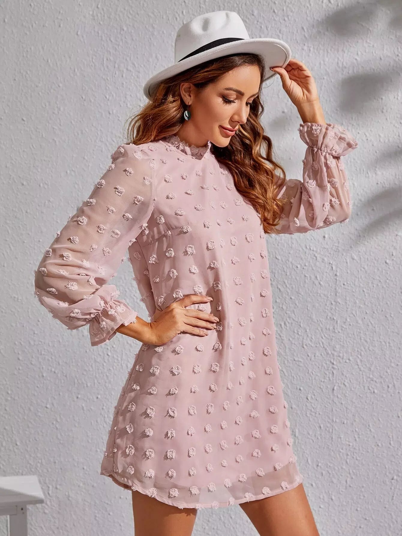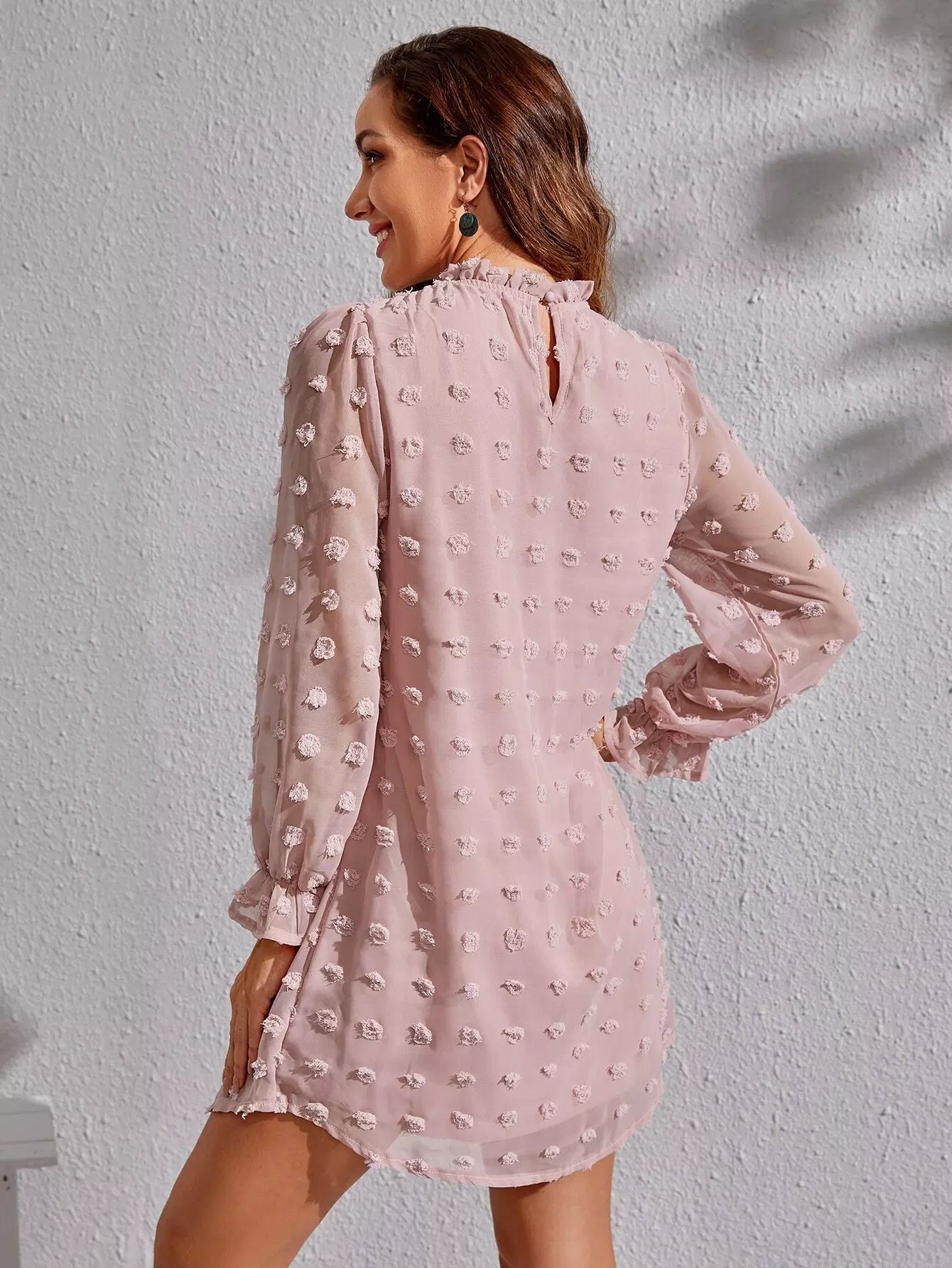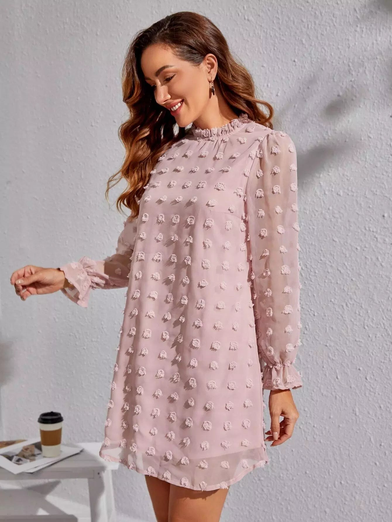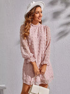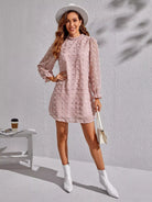 Swiss Dot Flounce Sleeve Frilled Neck Tunic Dress