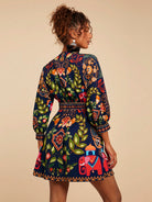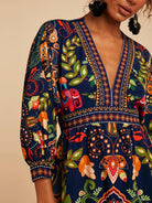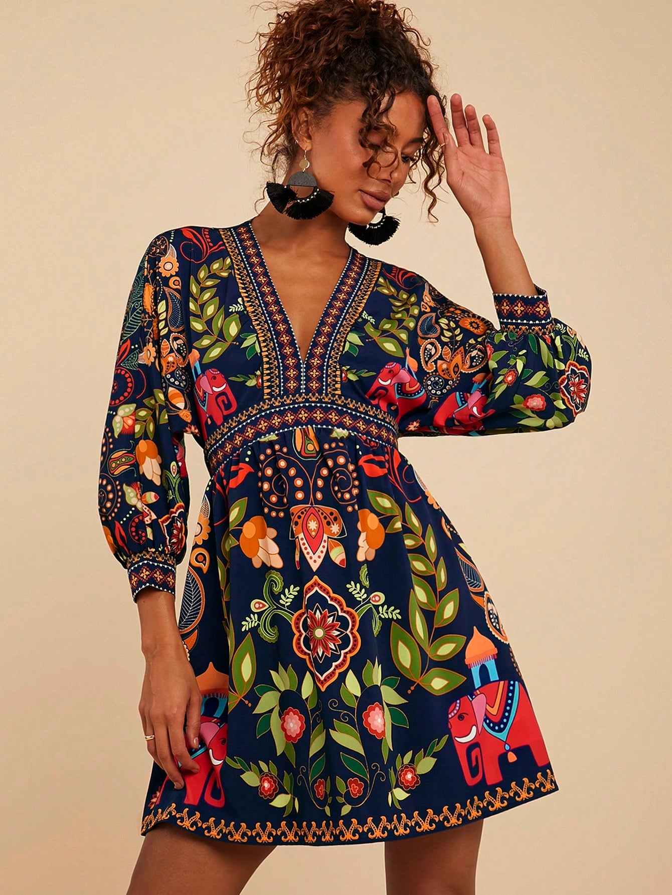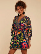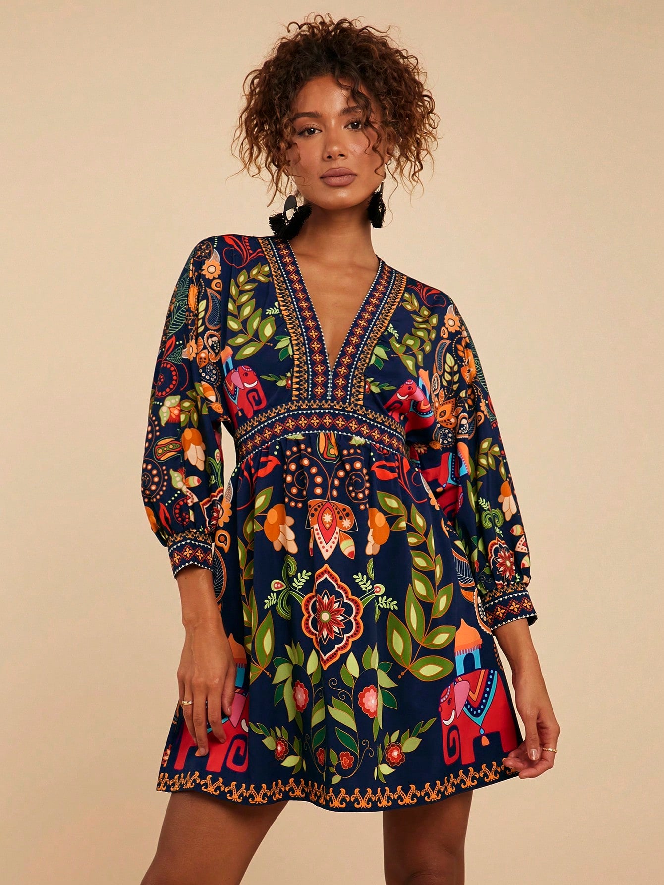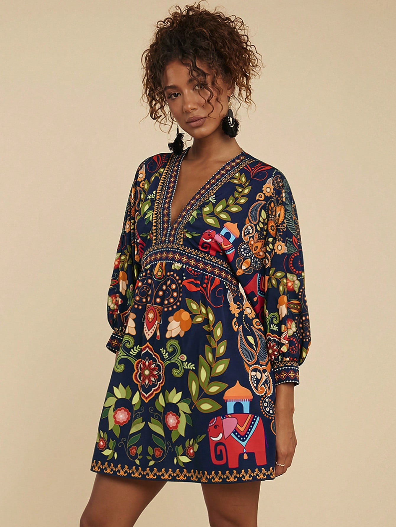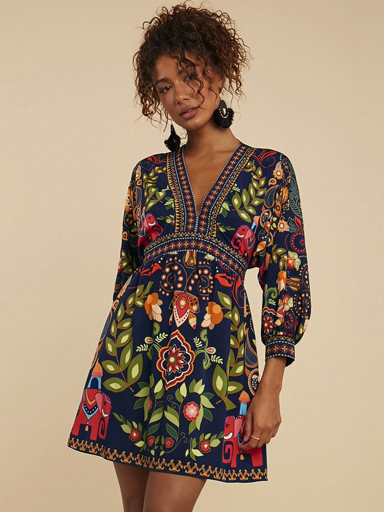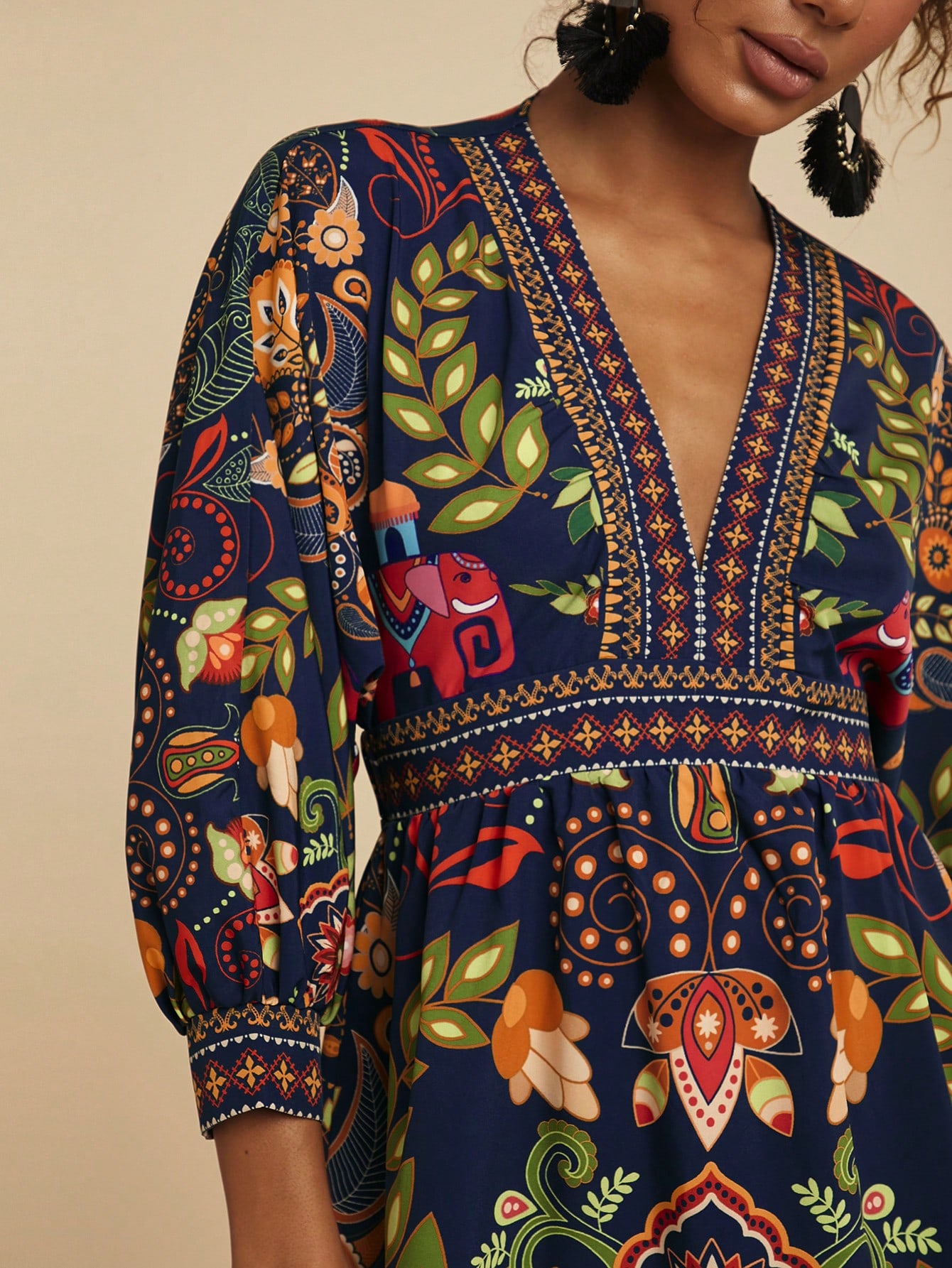 Travachic Vacation Floral Print V-Neck 3/4 Sleeve Mini Dress For Women