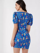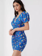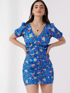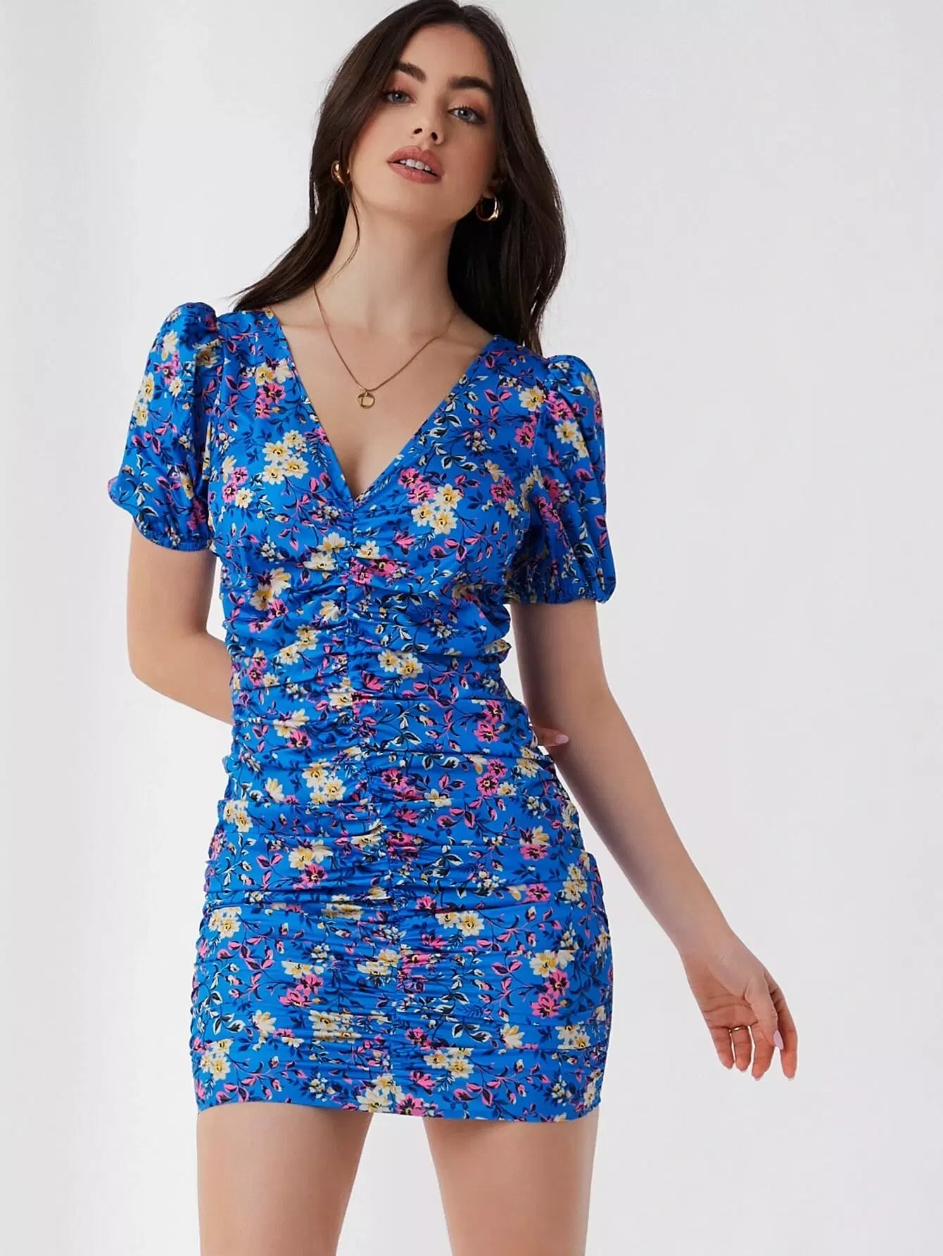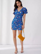 V-neck Puff Sleeve Ruched Detail Allover Floral Print Dress