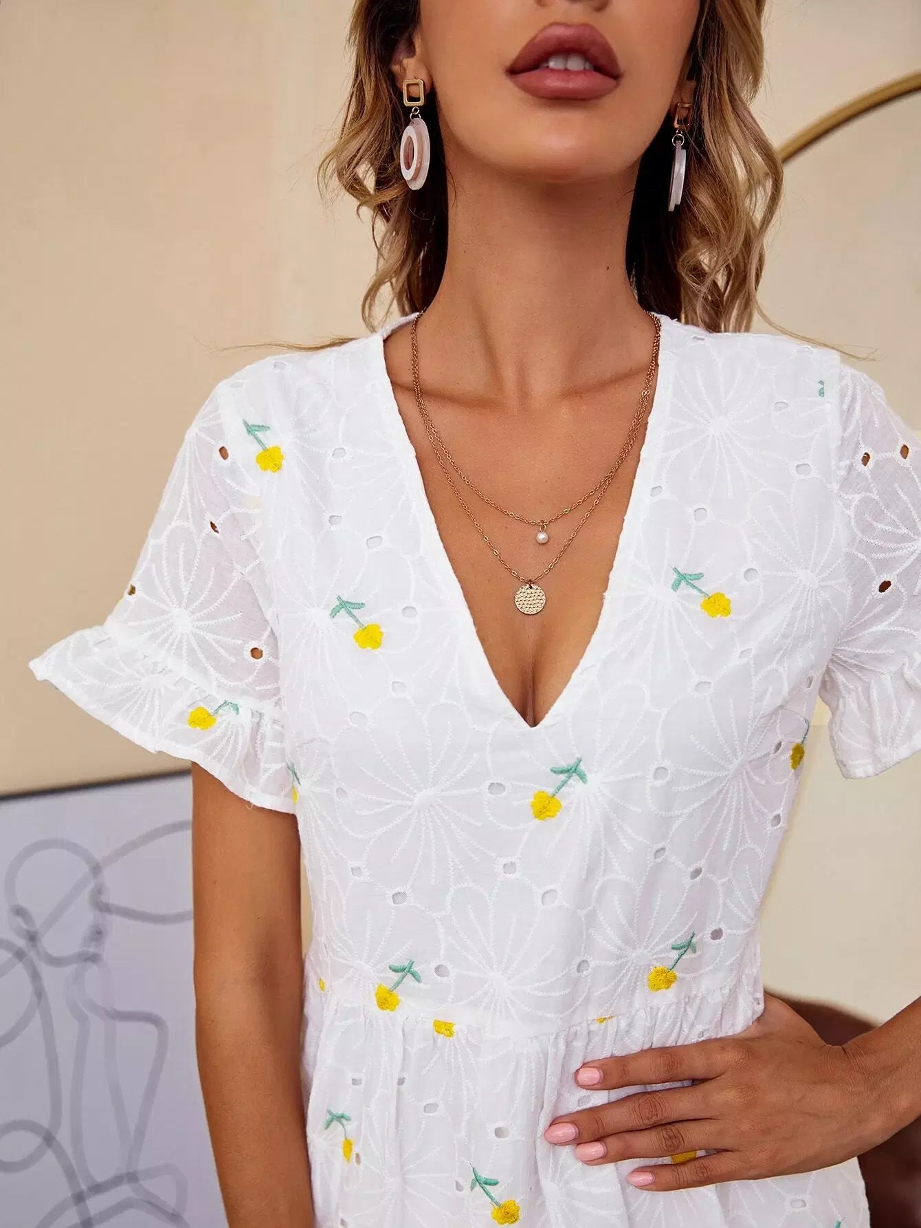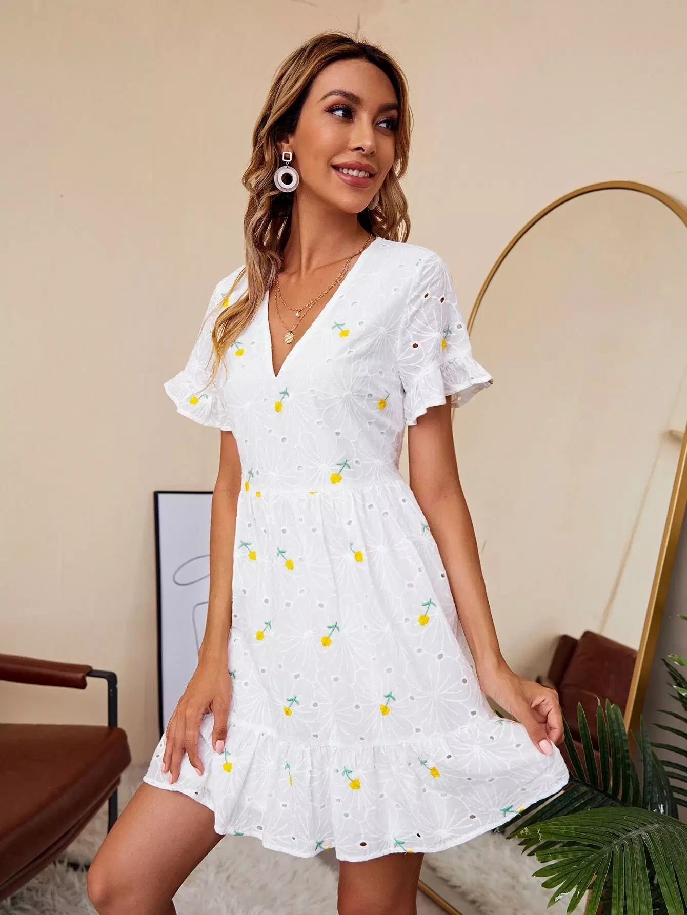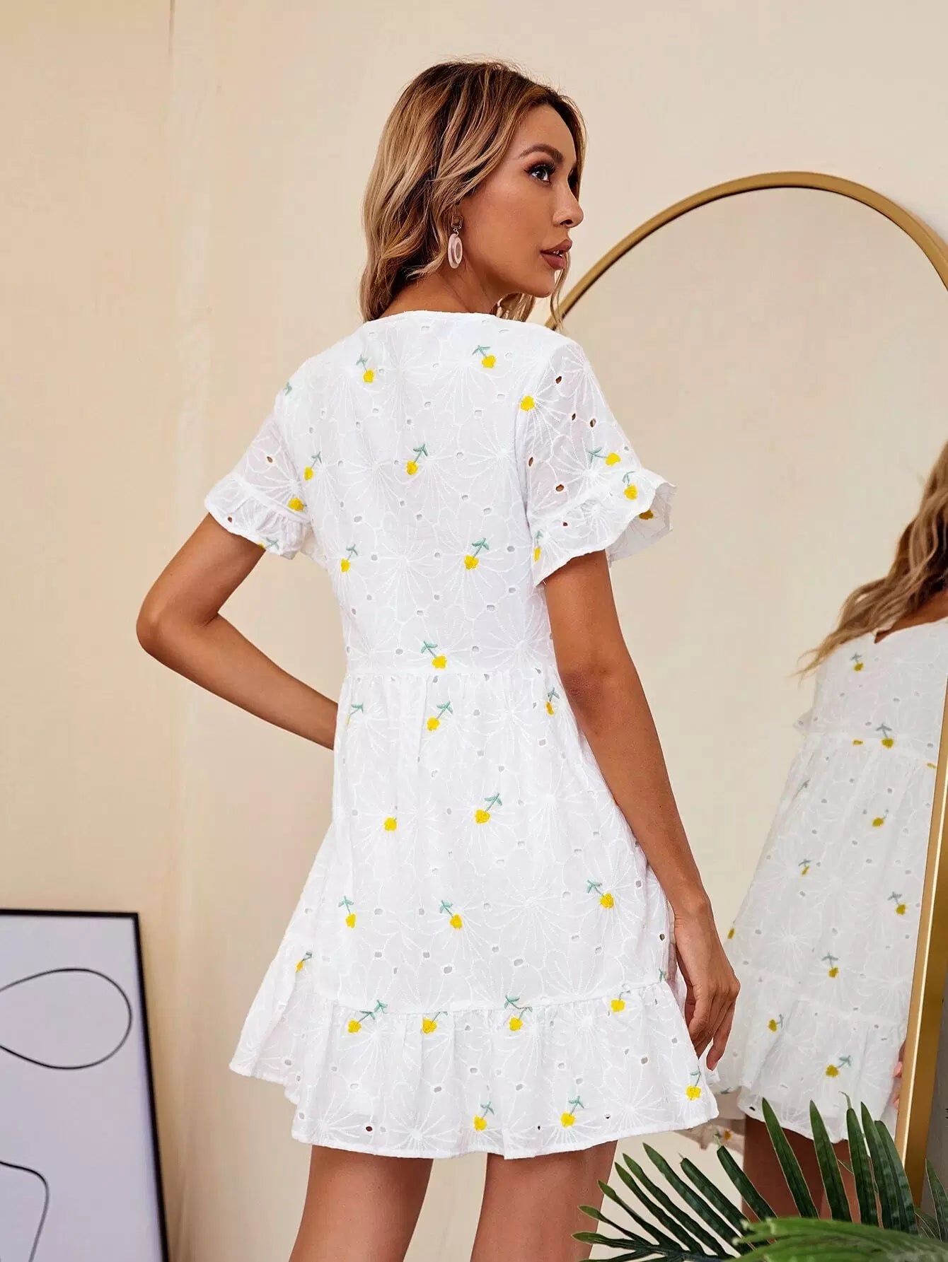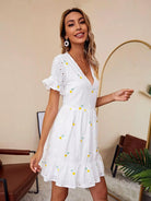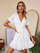 V-neck Ruffle Cuff Floral Schiffy Dress