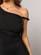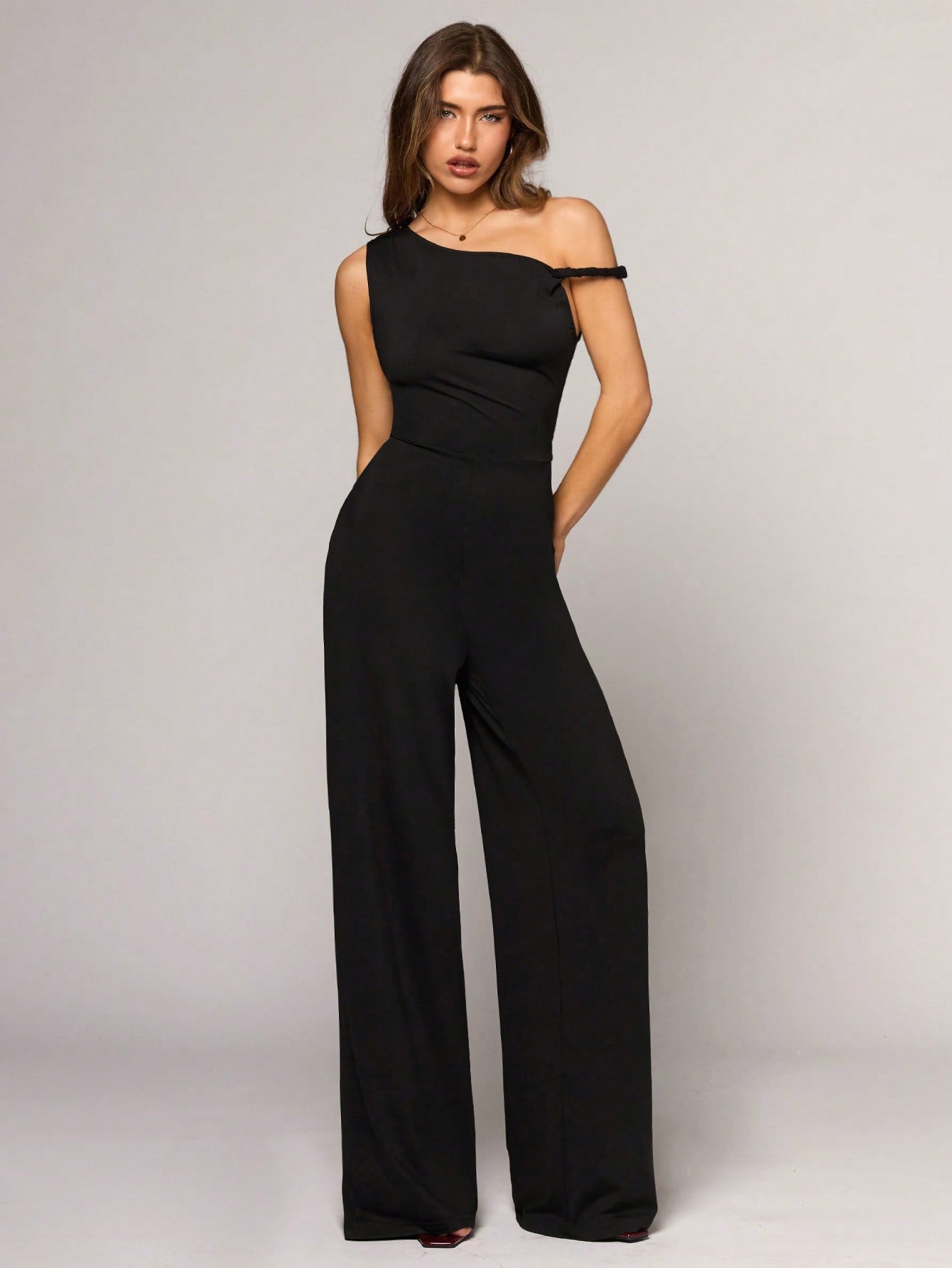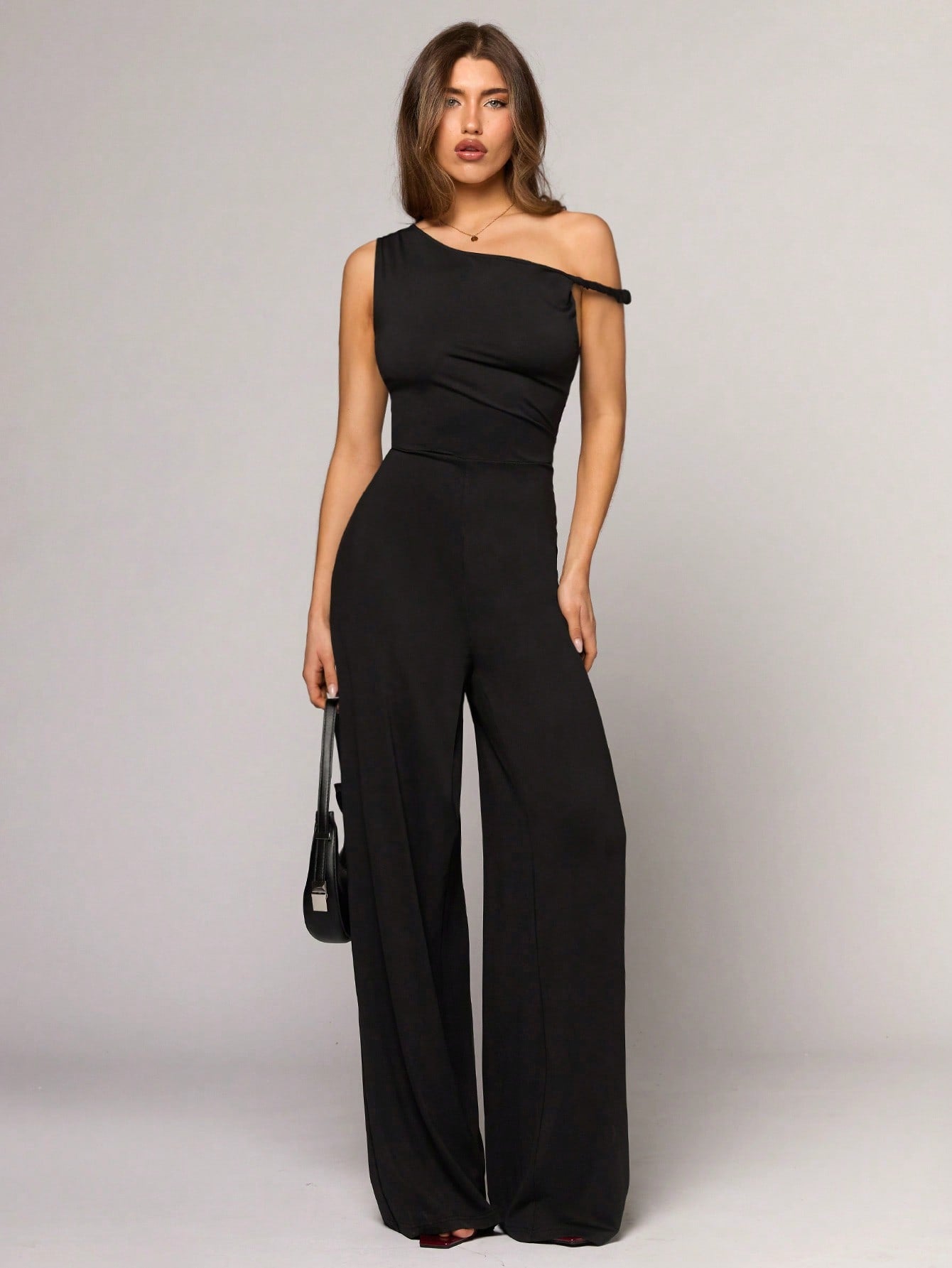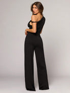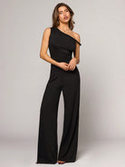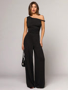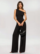 BAE Women's Black Asymmetric Collar Wide Leg Jumpsuit, Fashionable Casual Minimalist Style For Hanging