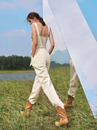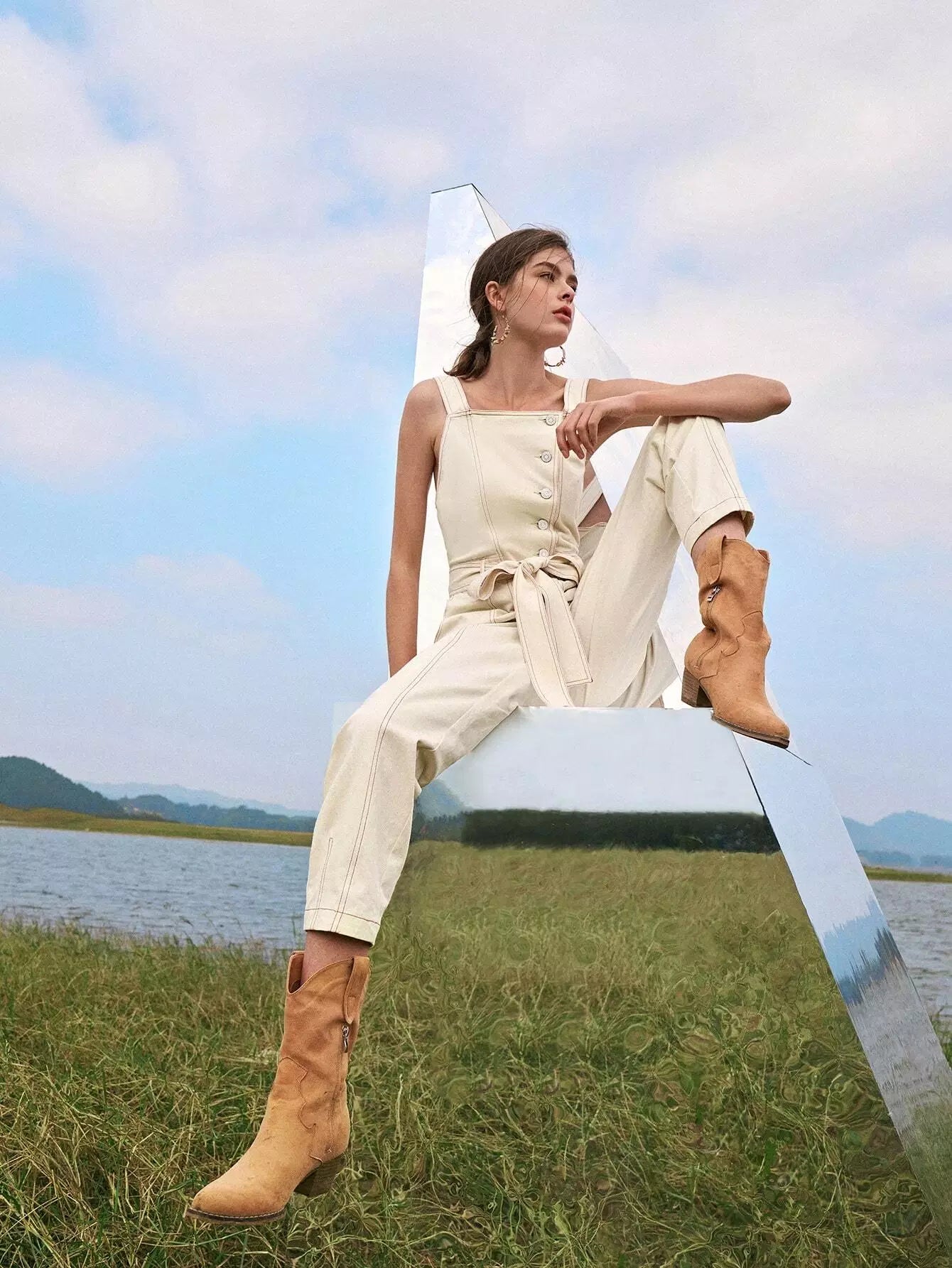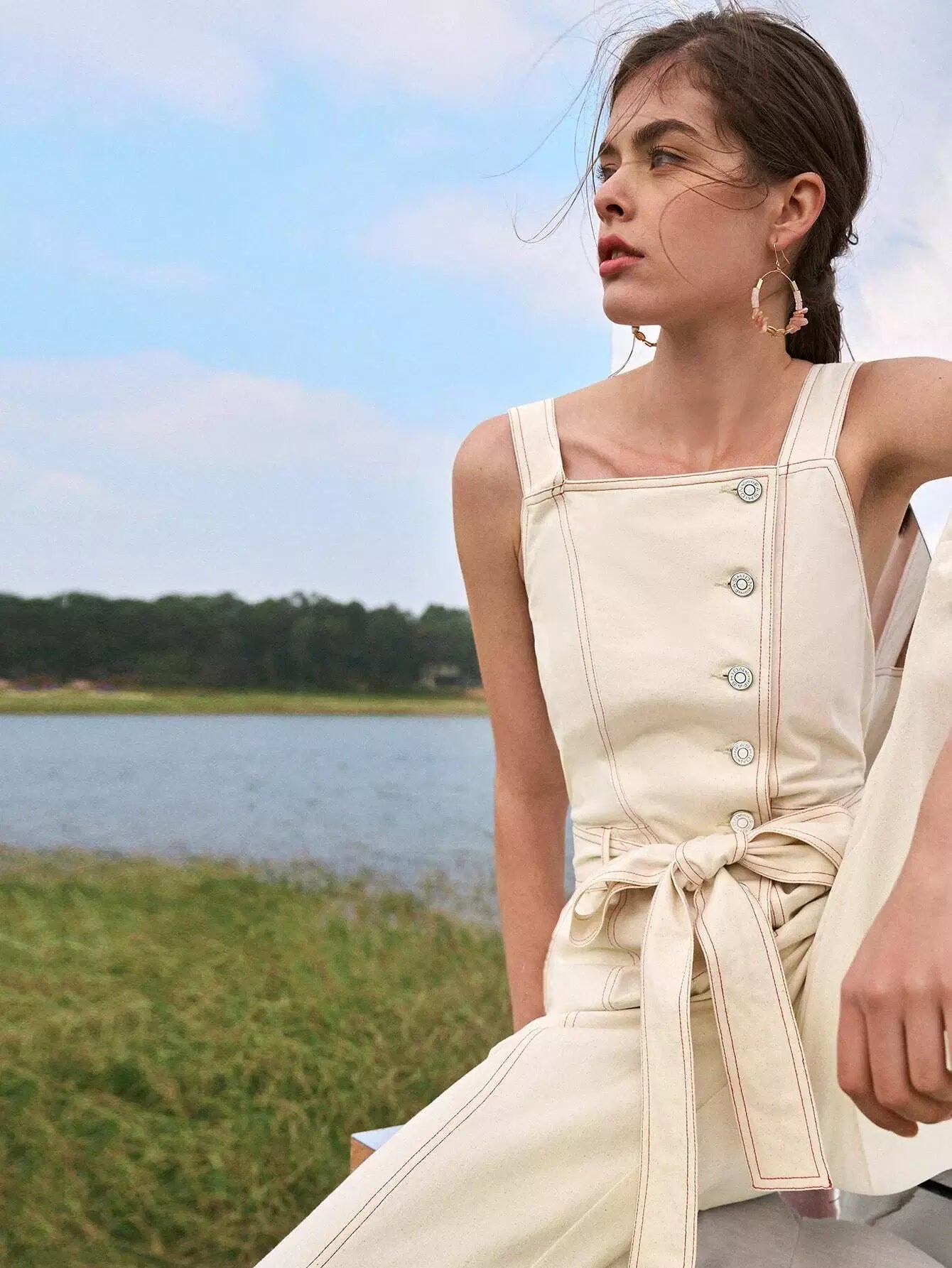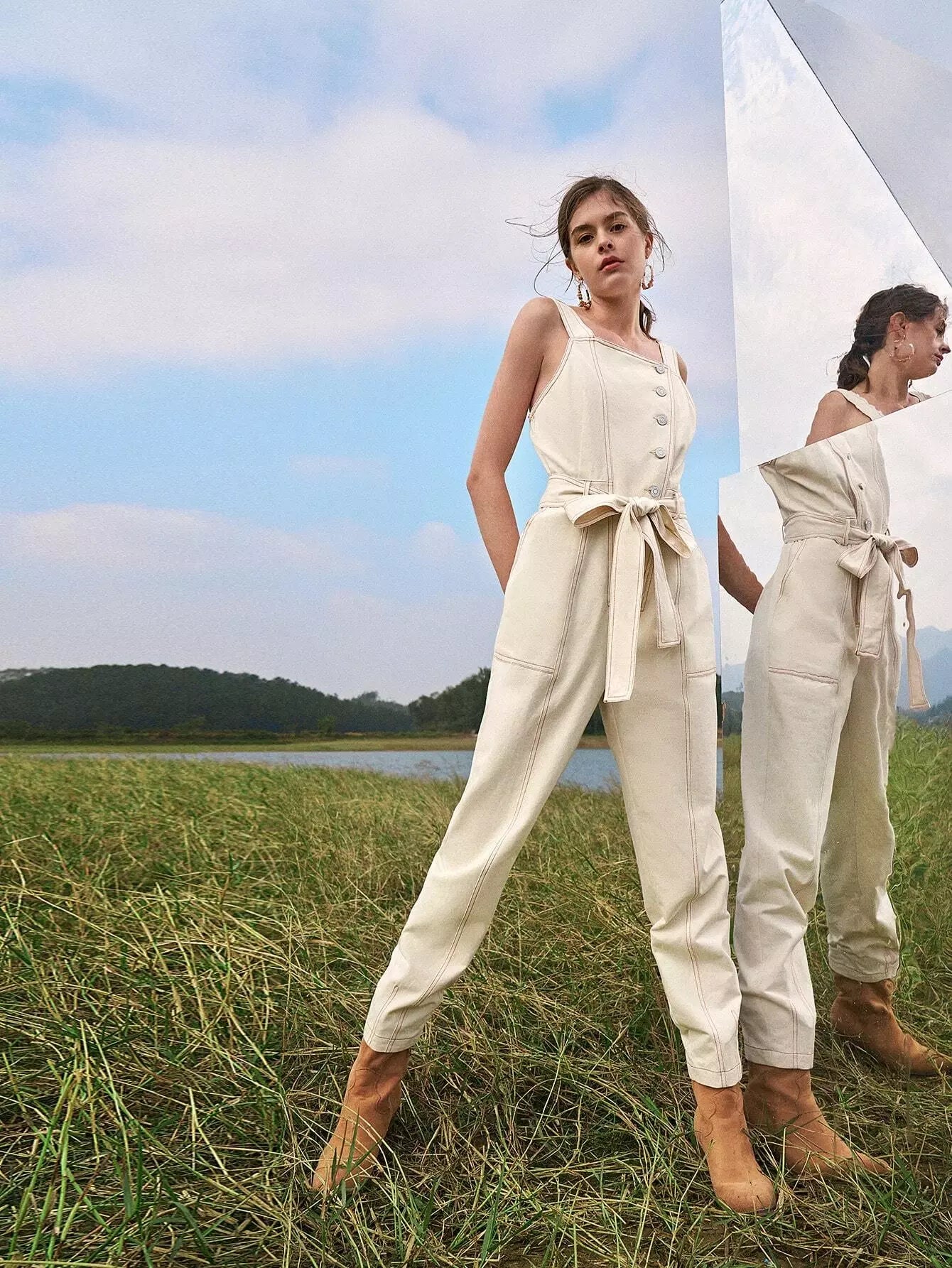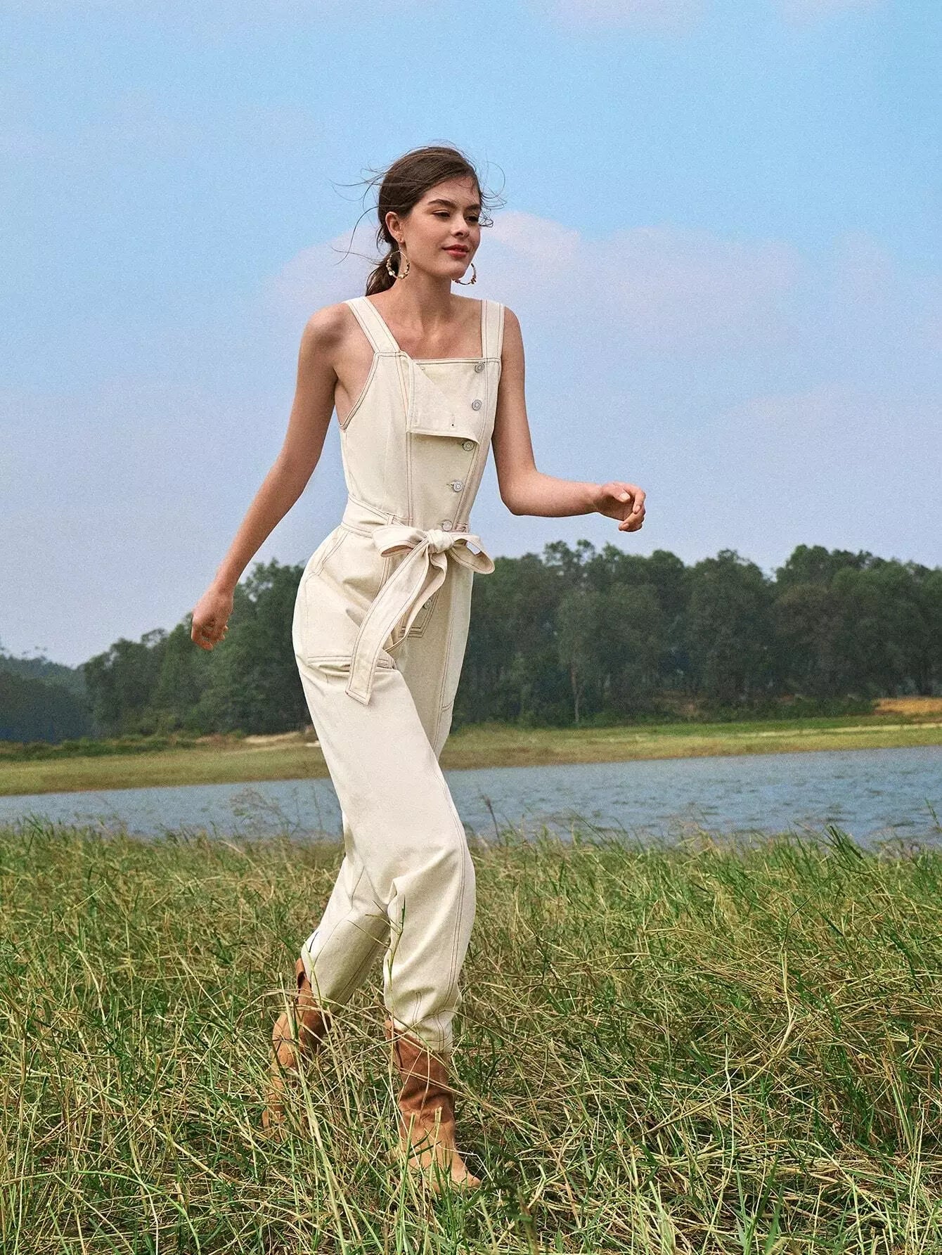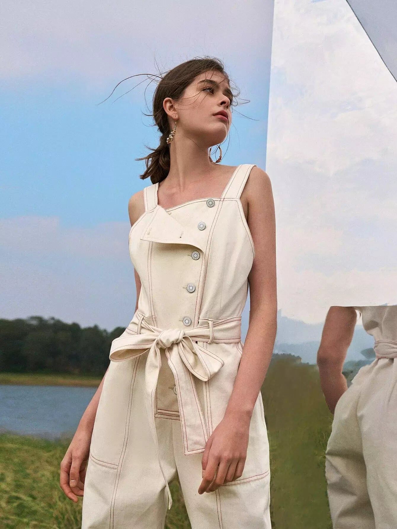 Women - Contrast Stitch Button Placket Belted Overall Jumpsuit