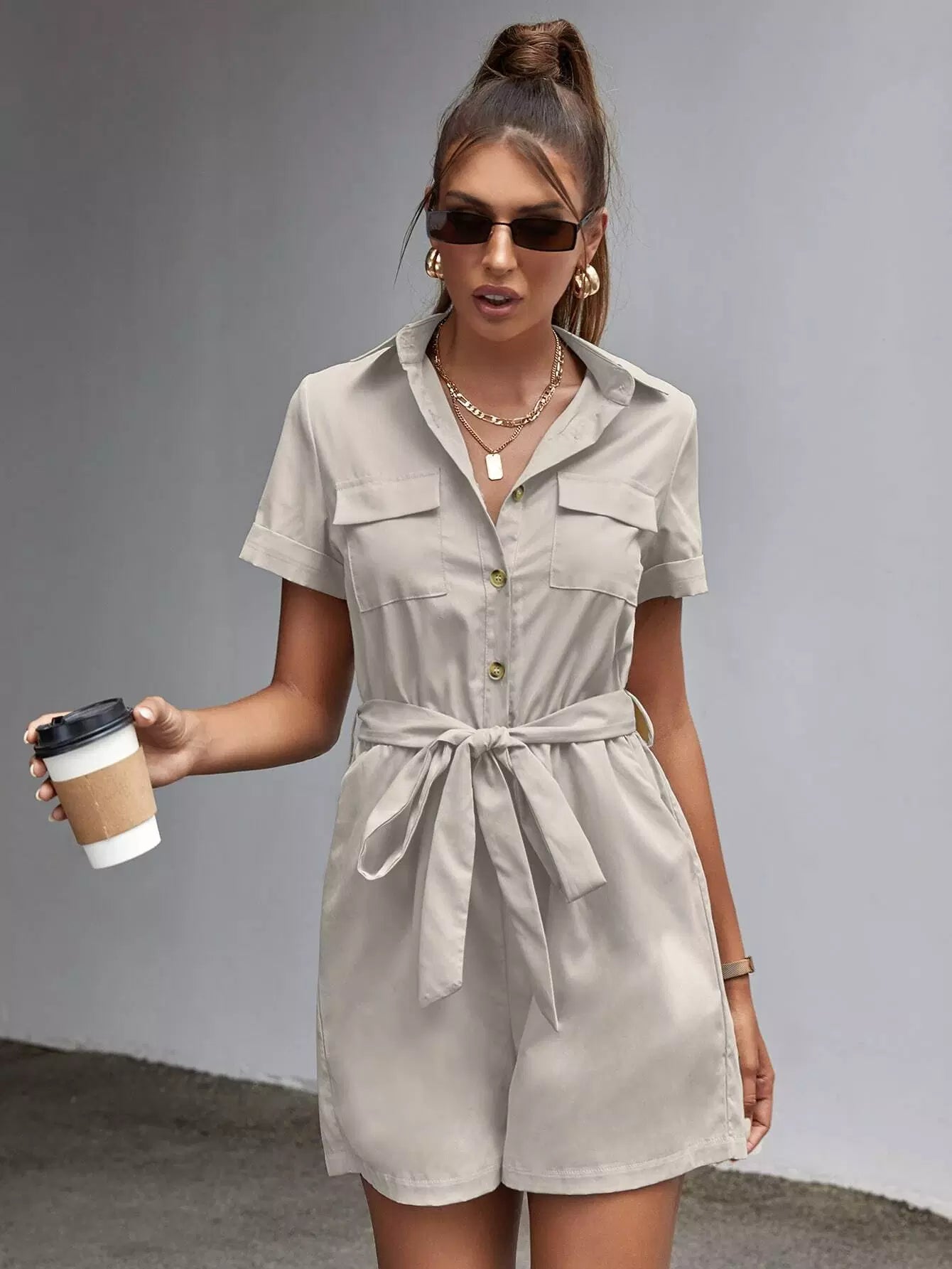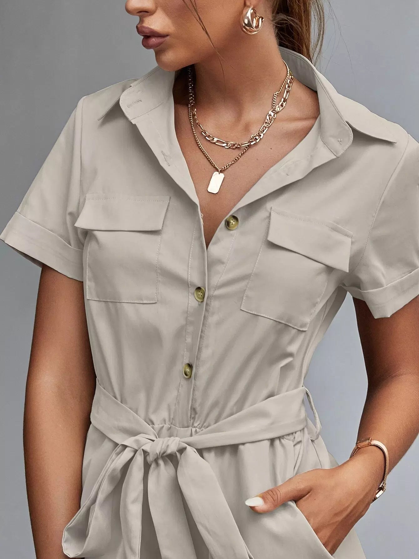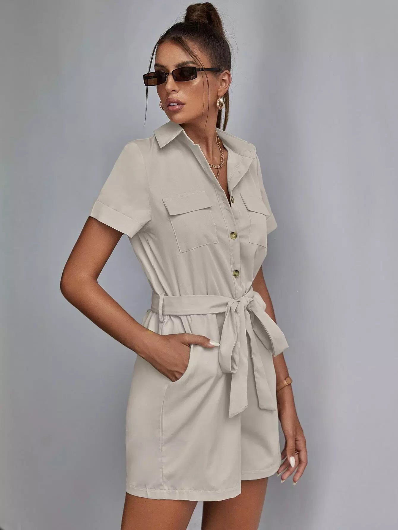 Women - Flap Pocket Self Tie Solid Romper