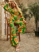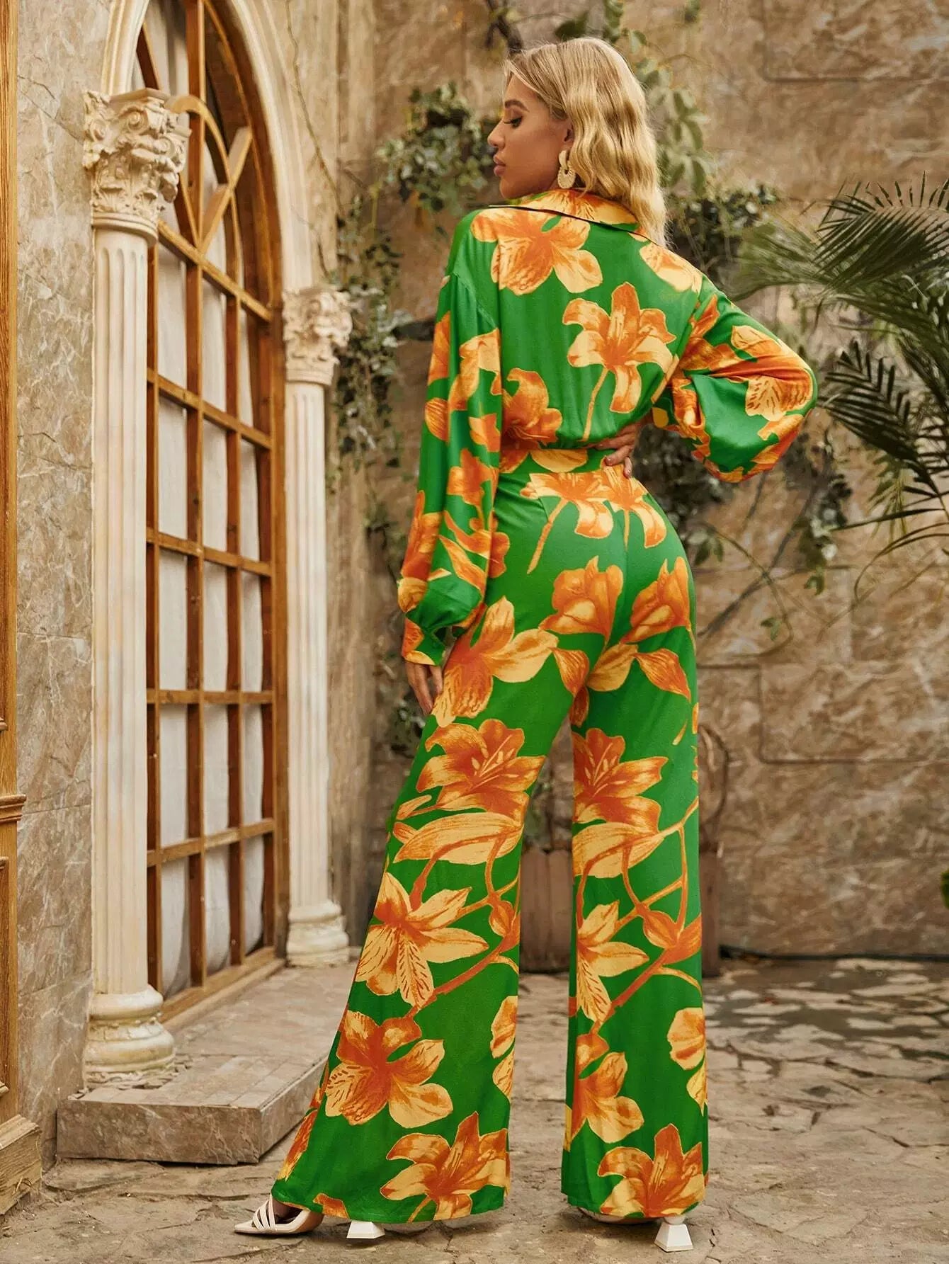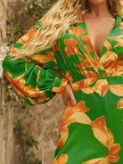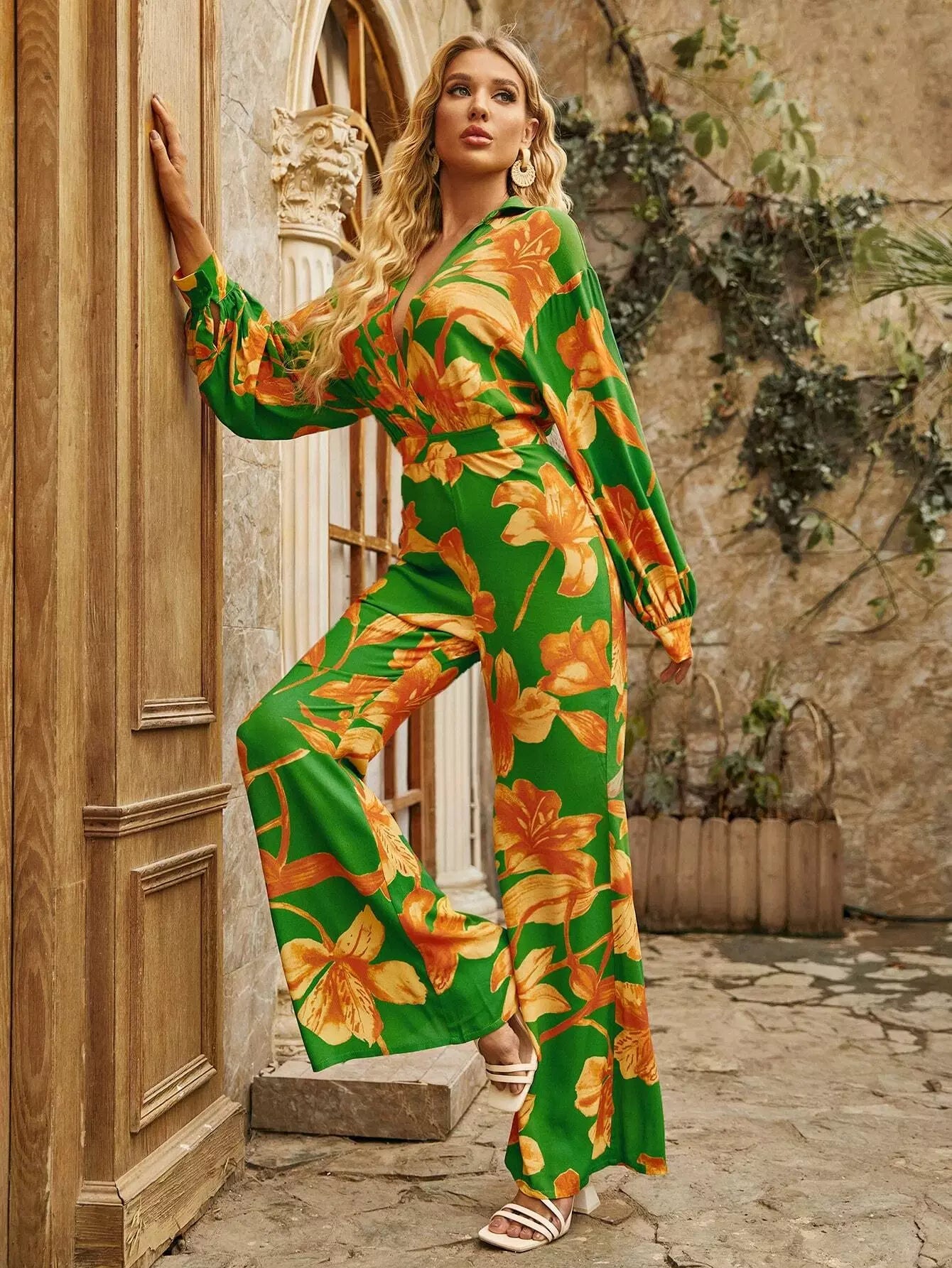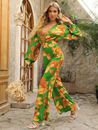 Plants Print Plunging Neck Bishop Sleeve Jumpsuit
