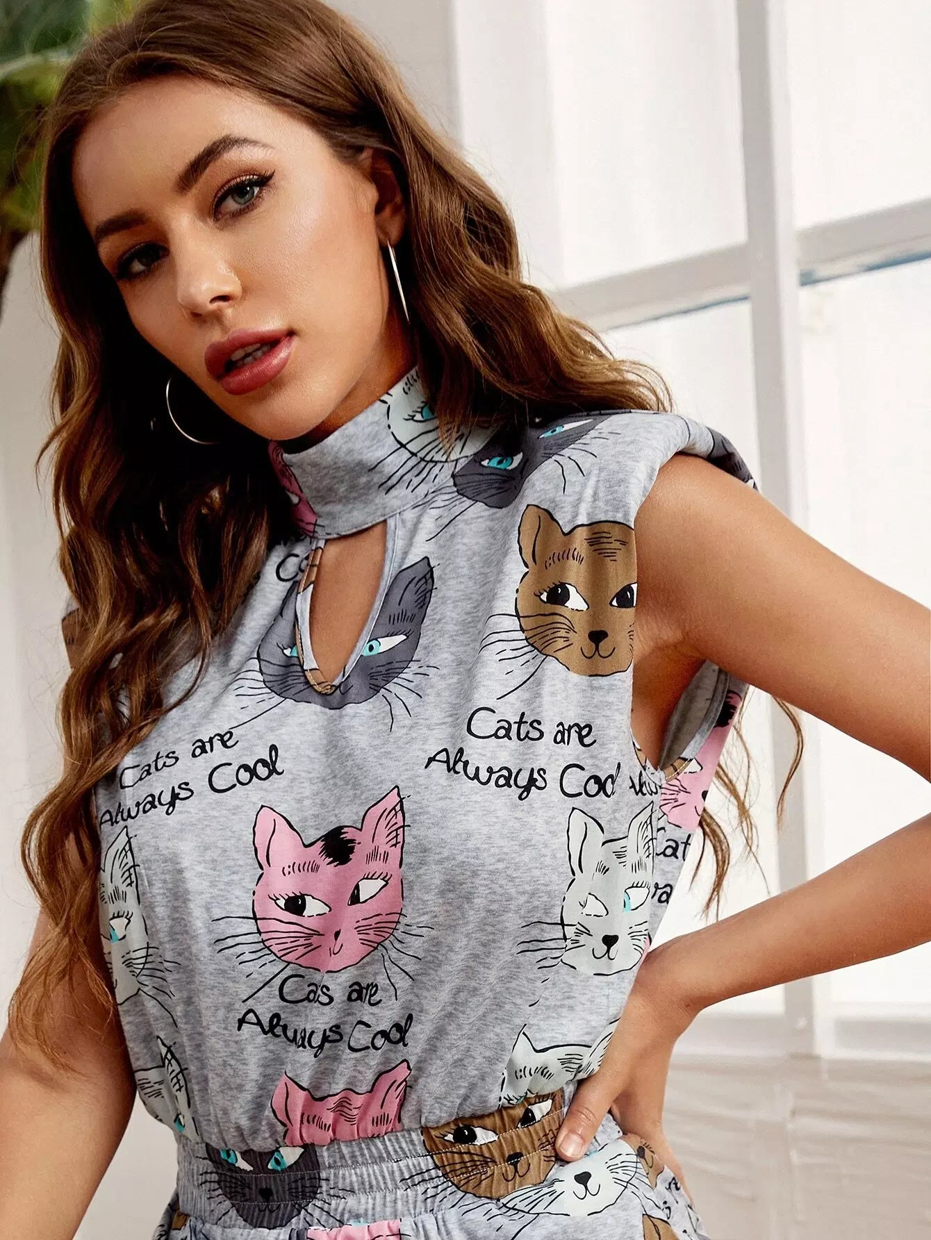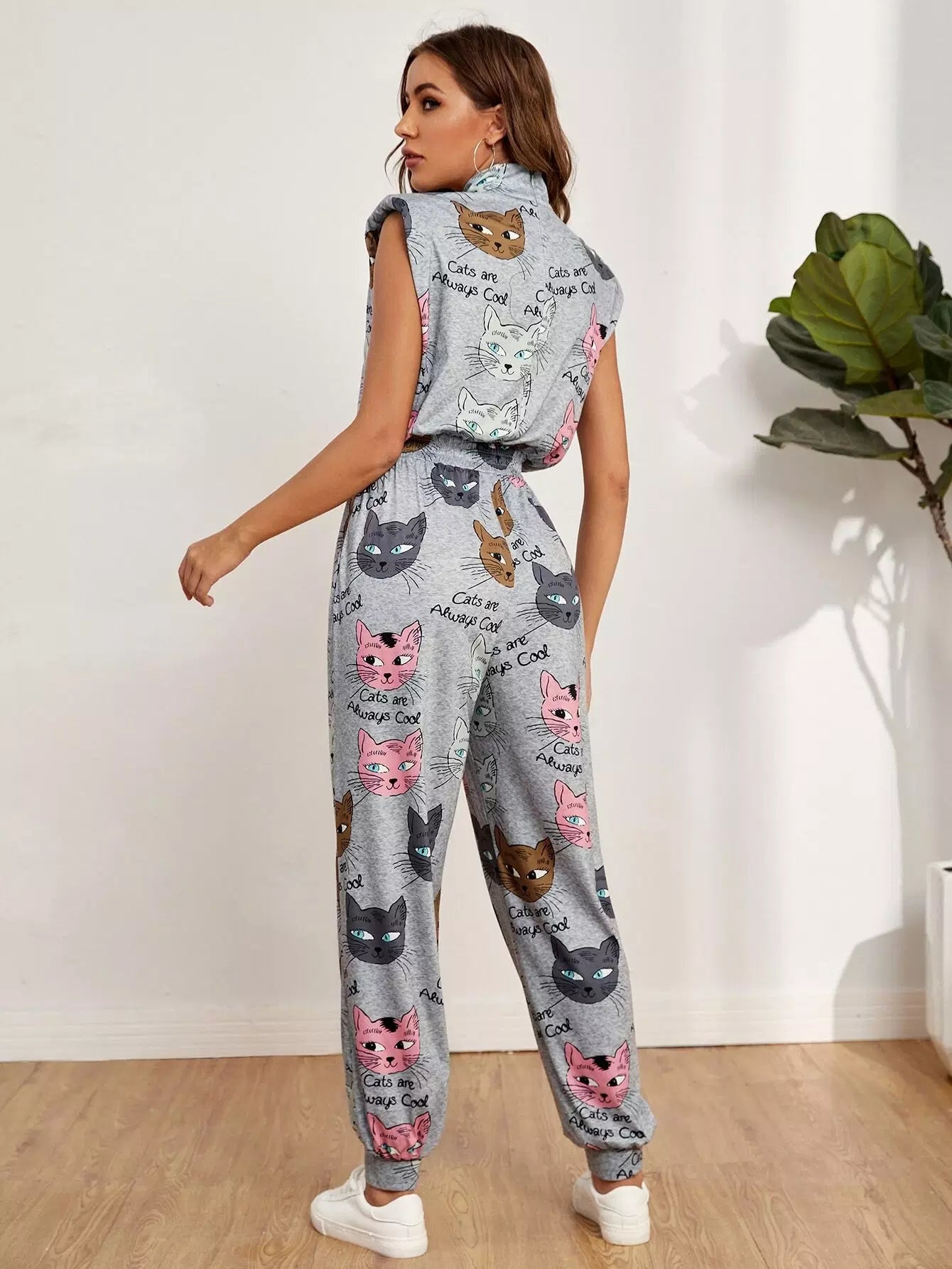 Shoulder Pad Keyhole Neck Cat & Letter Graphic Jumpsuit