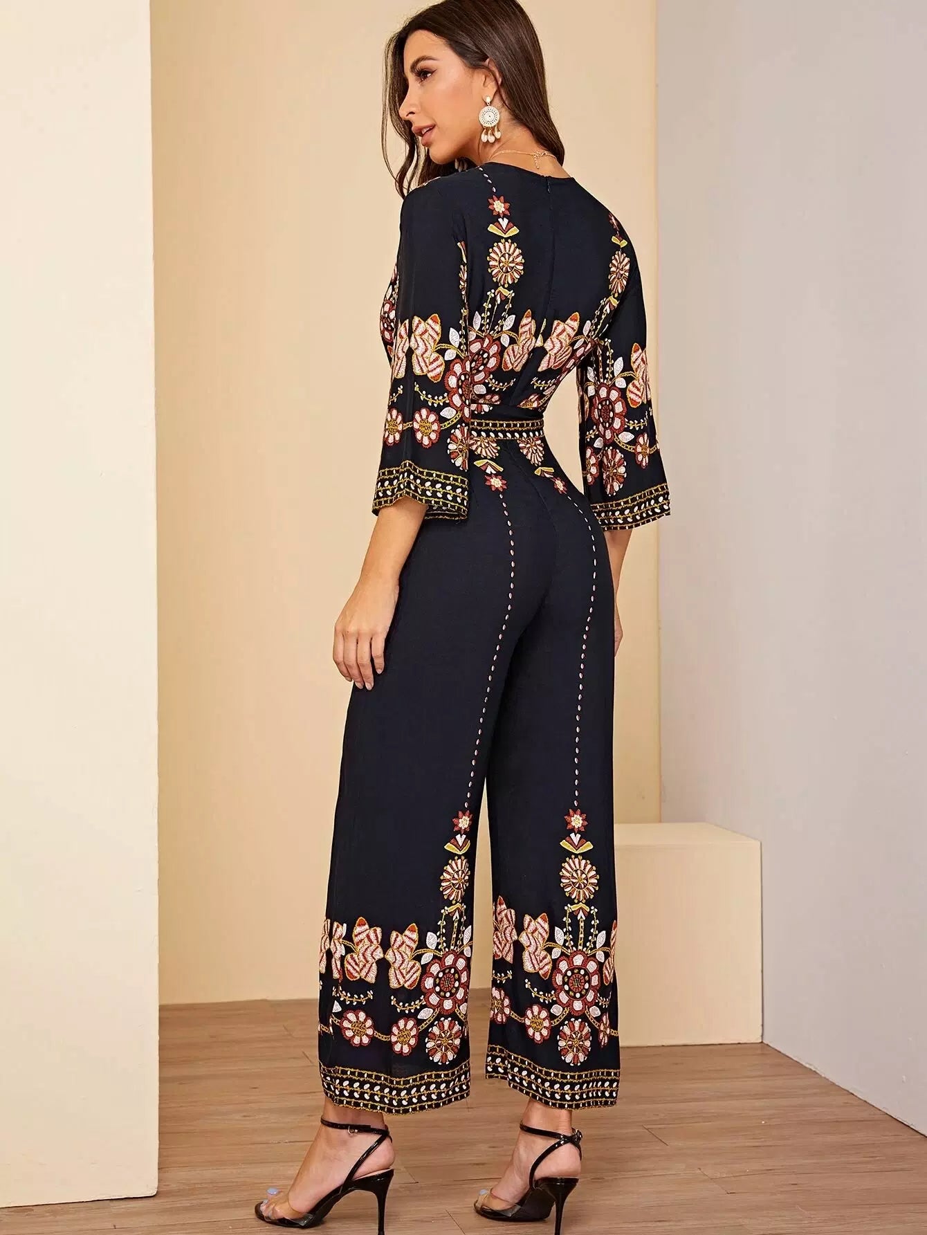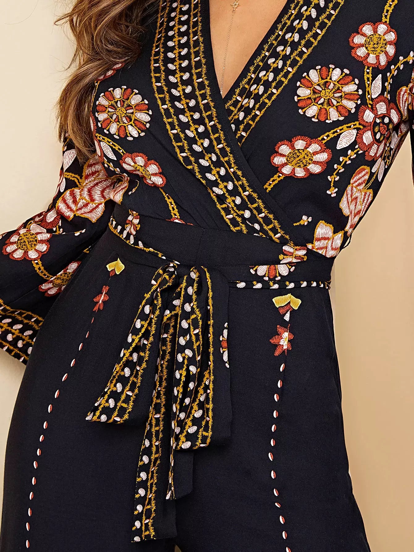 Surplice Wrap Random Floral Wide Leg Jumpsuit Without Belt