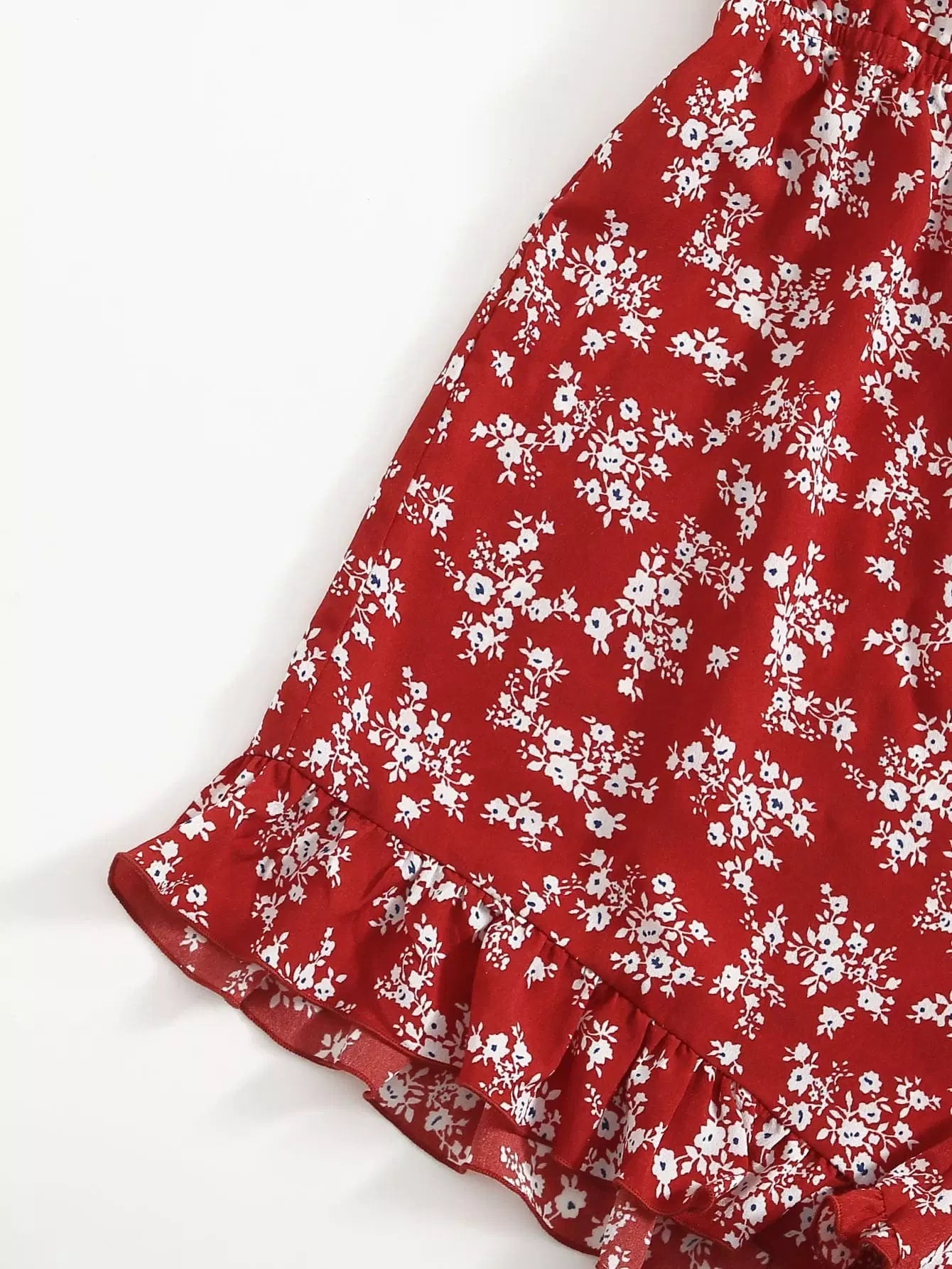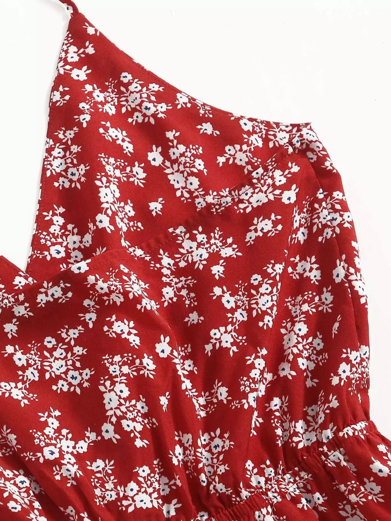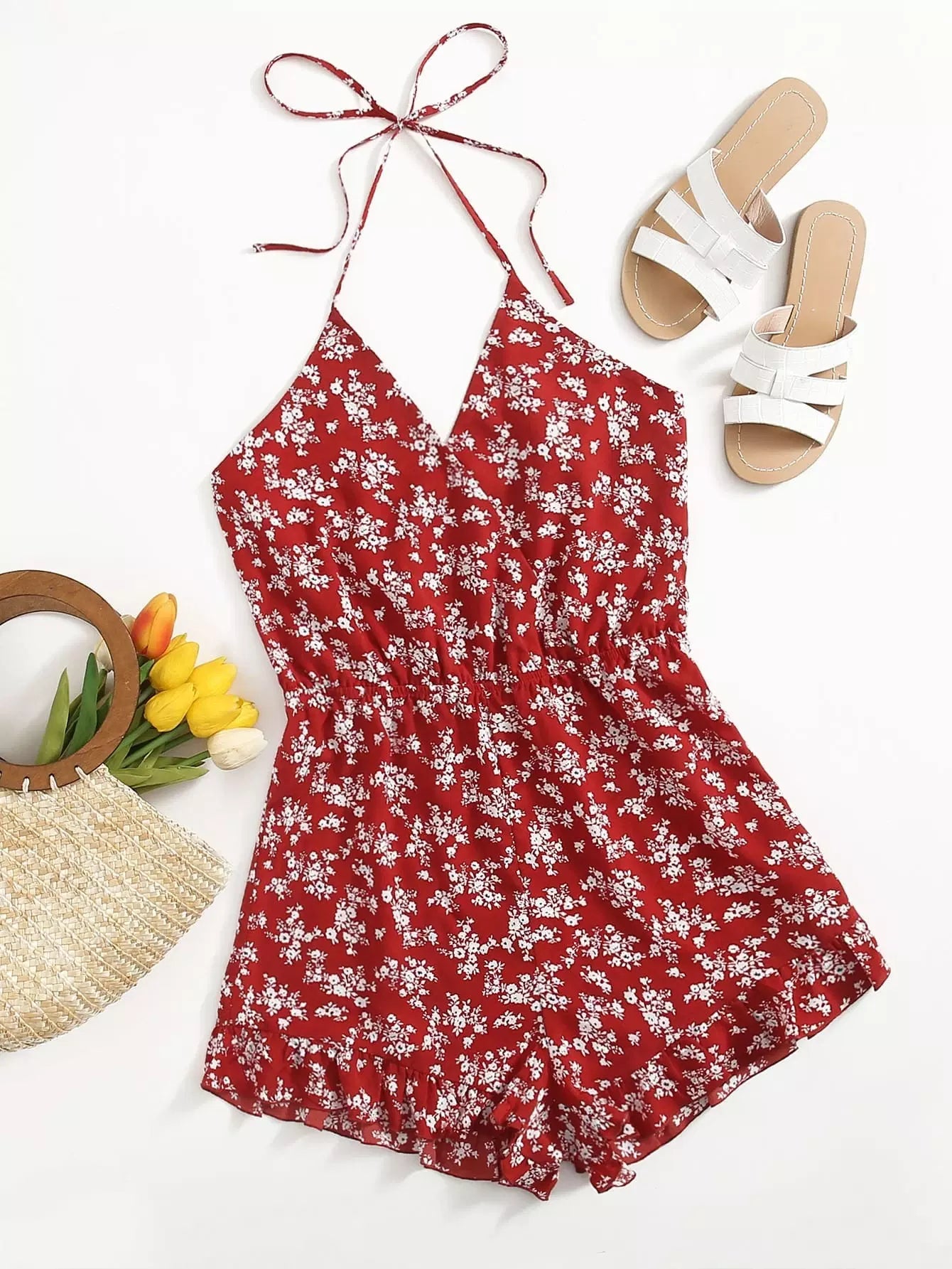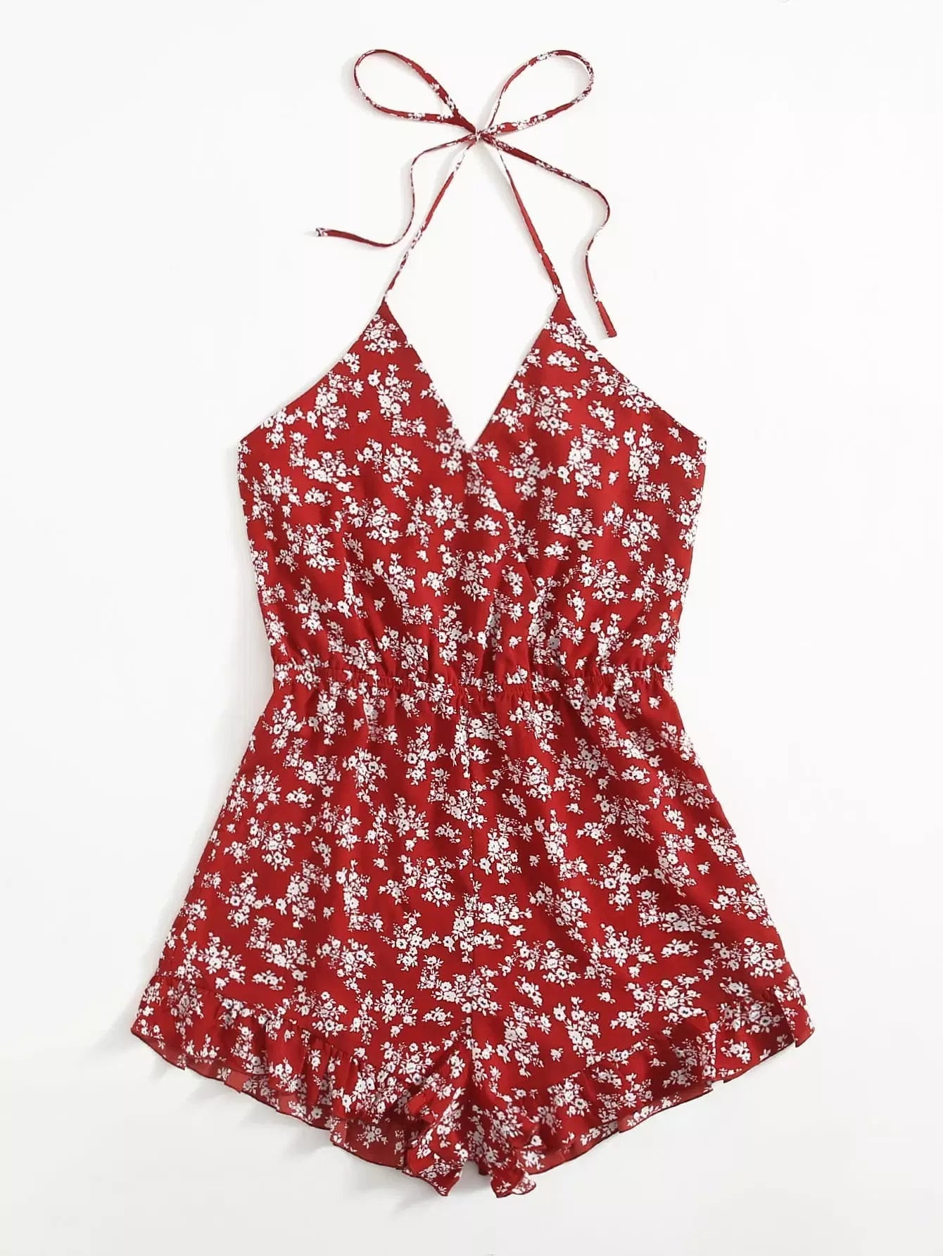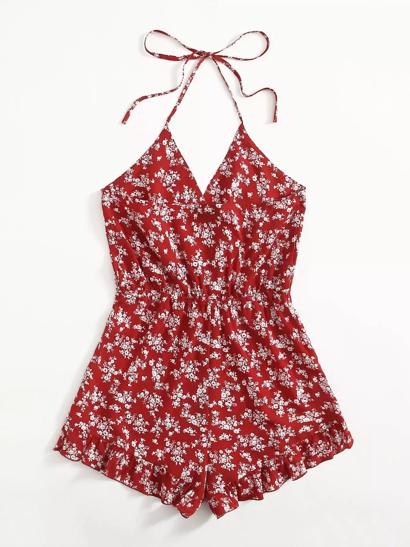Tie Back Ruffle Hem Ditsy Floral Halter Romper