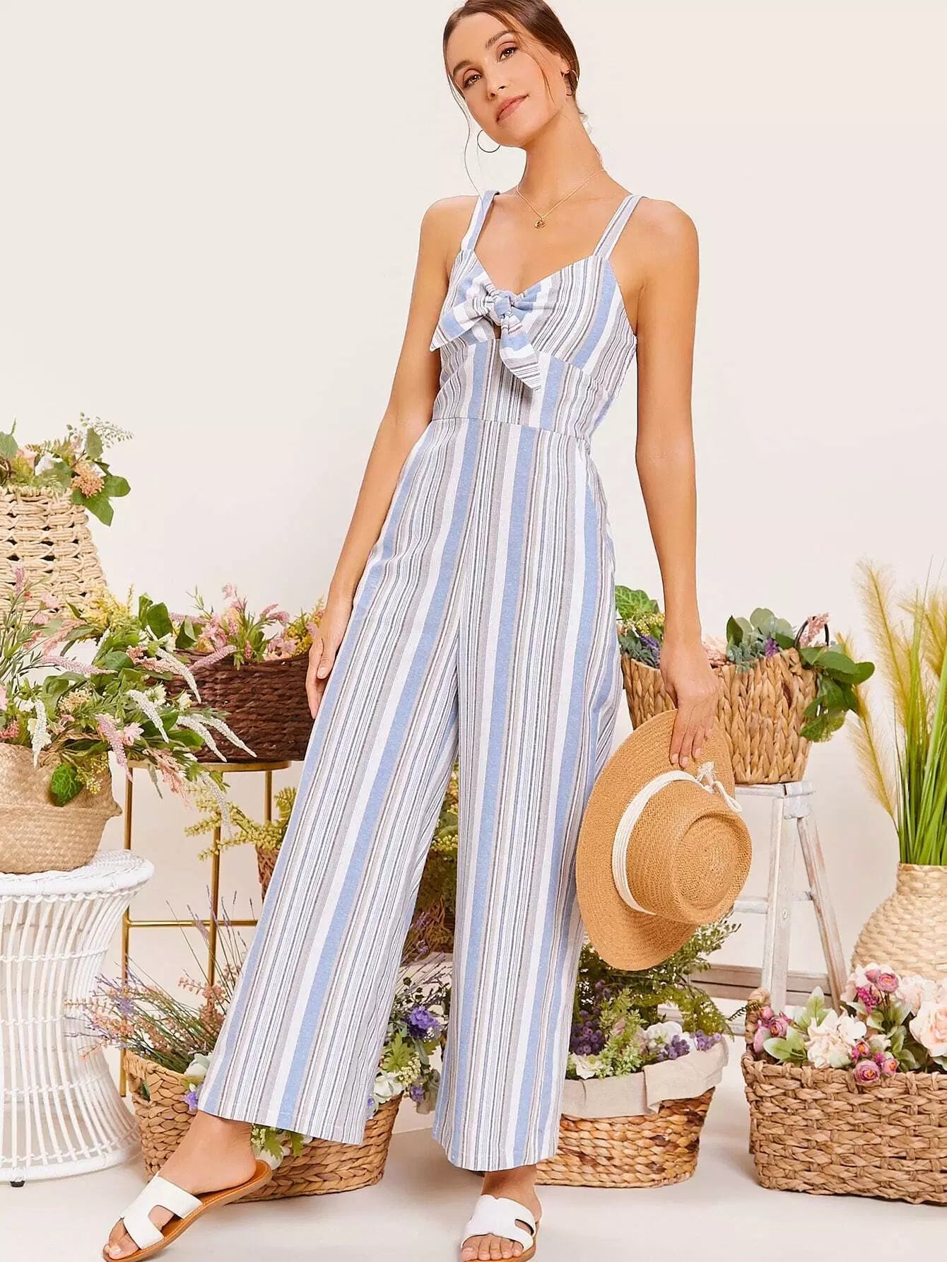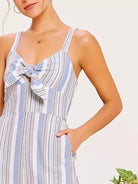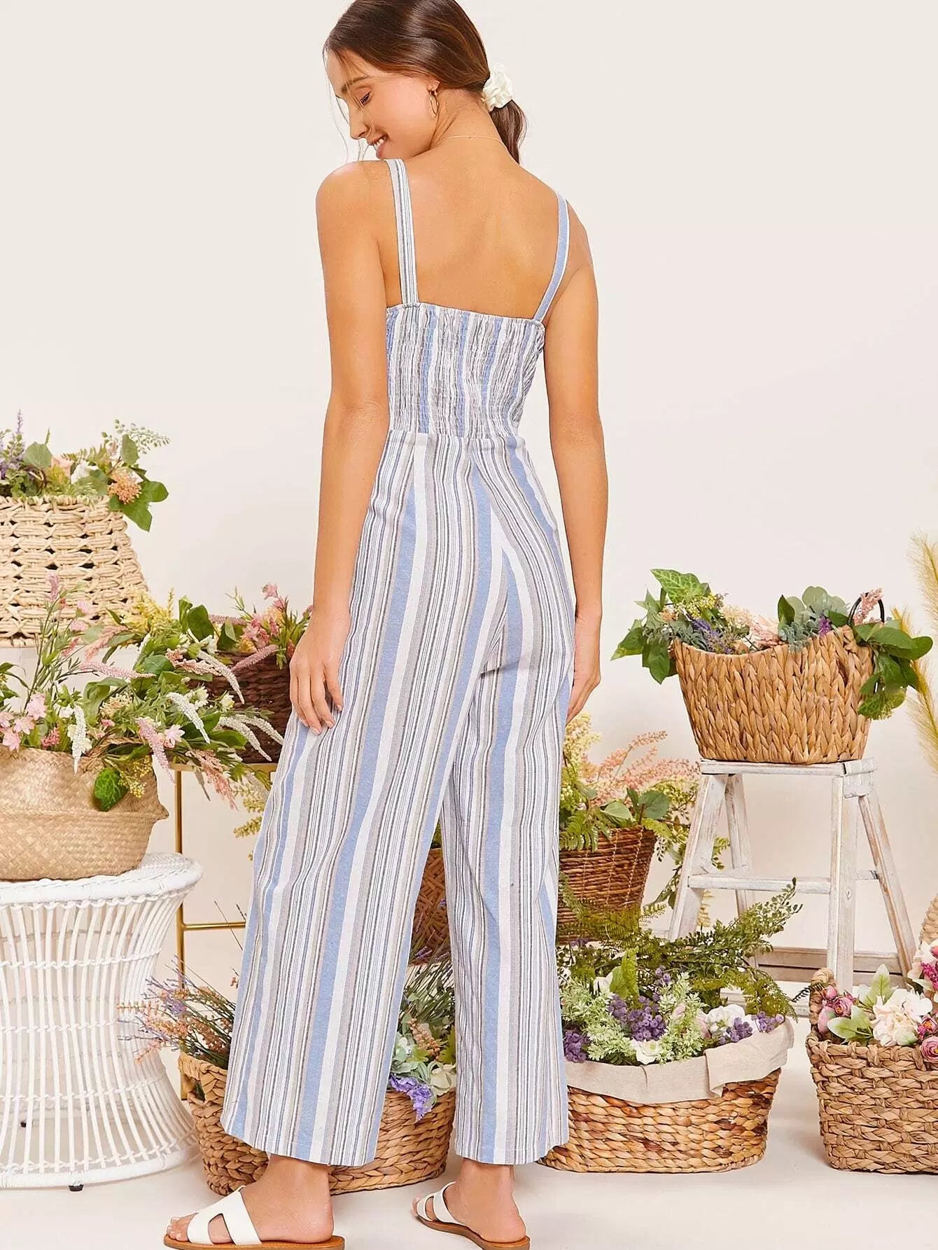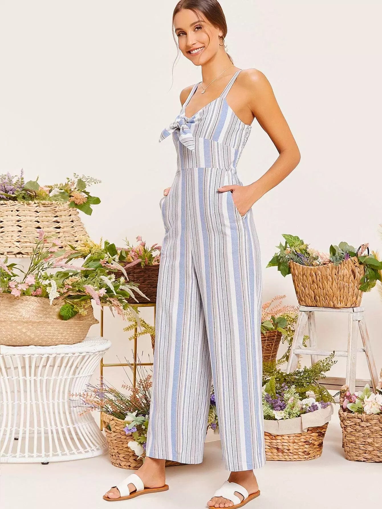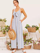 Tie Front Shirred Back Slant Pocket Striped Wide Leg Jumpsuit
