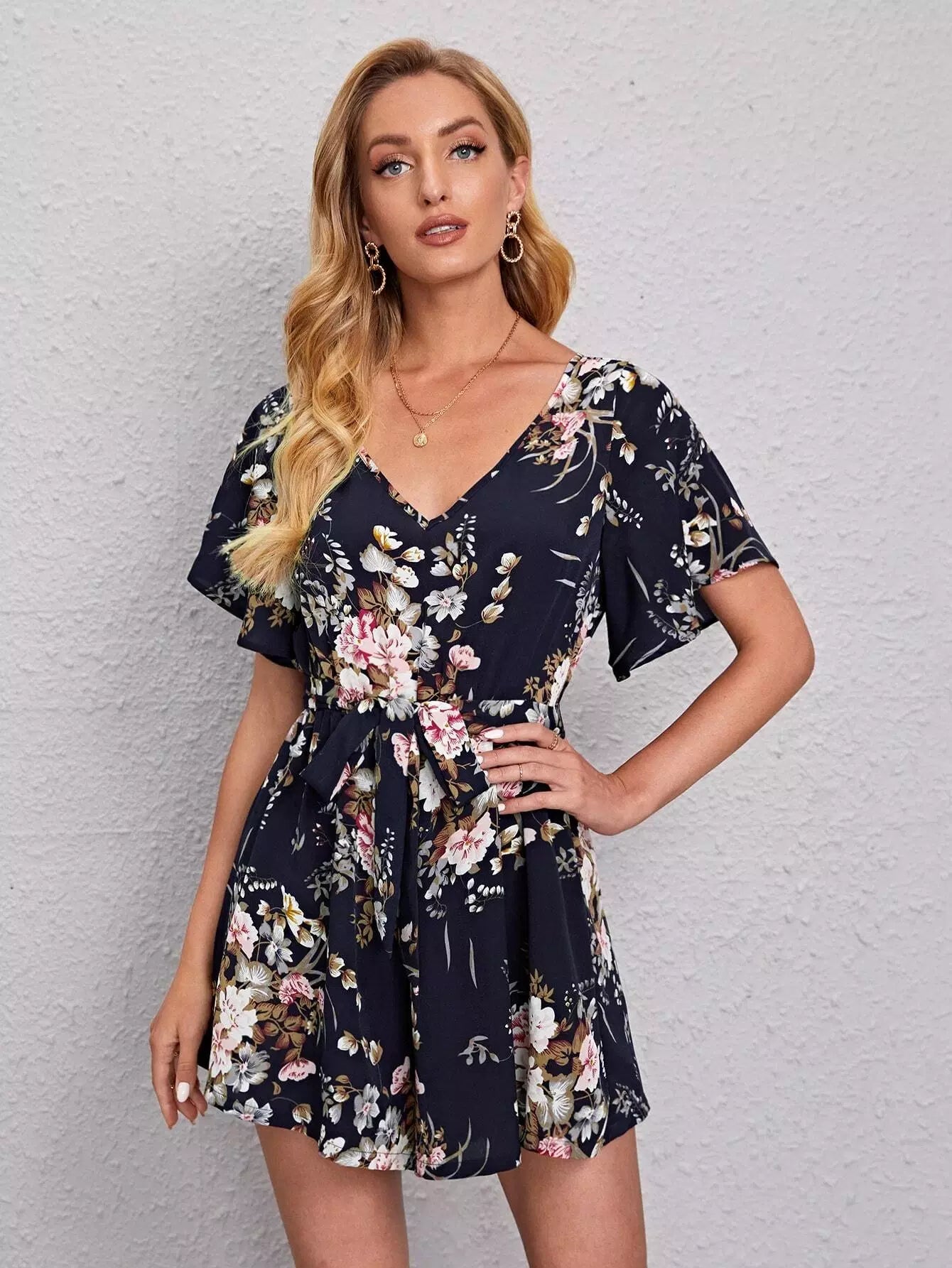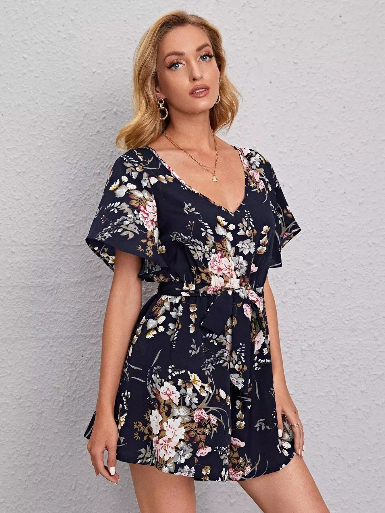 Women - V-neck Butterfly Sleeve Belted Floral Romper