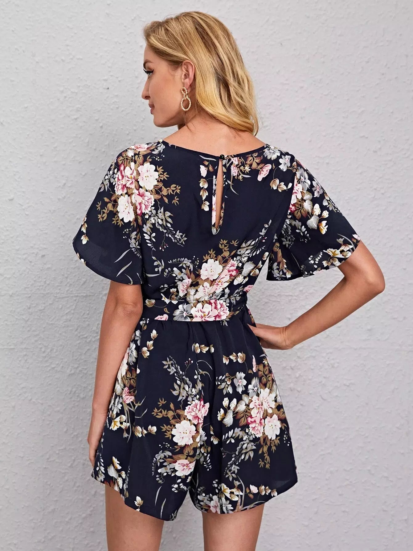 V-neck Butterfly Sleeve Floral Romper Without Belt