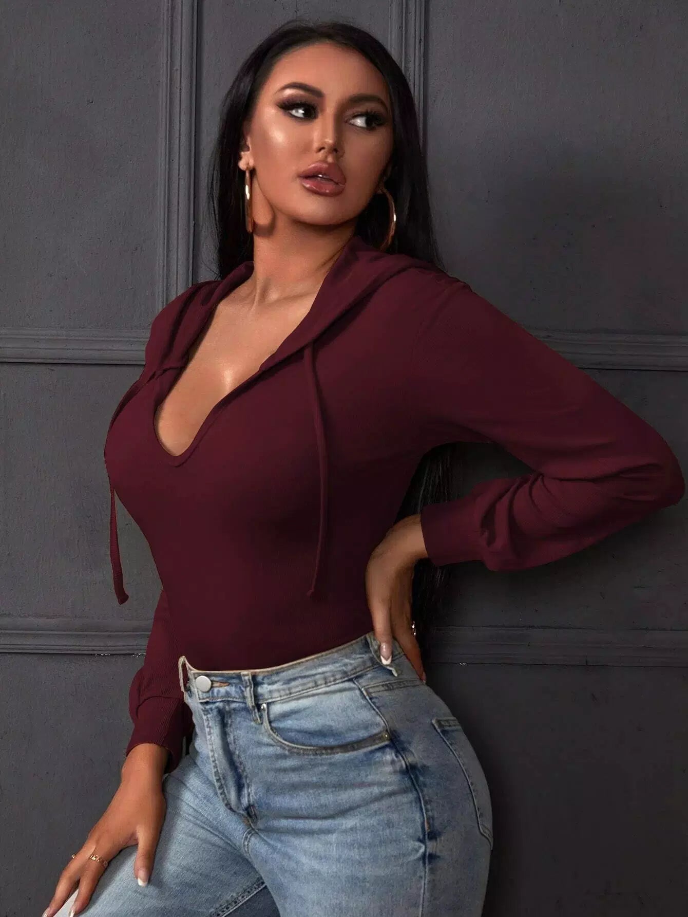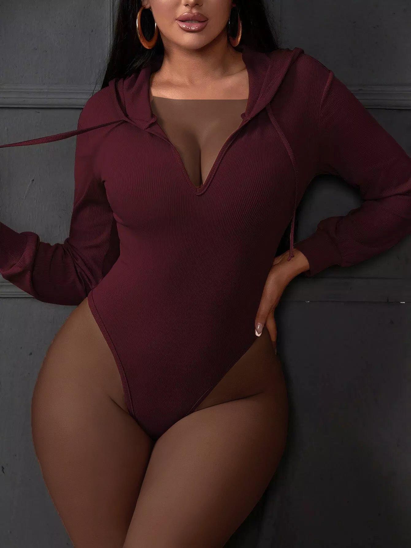 High Cut Drawstring Hooded Ribbed Knit Bodysuit