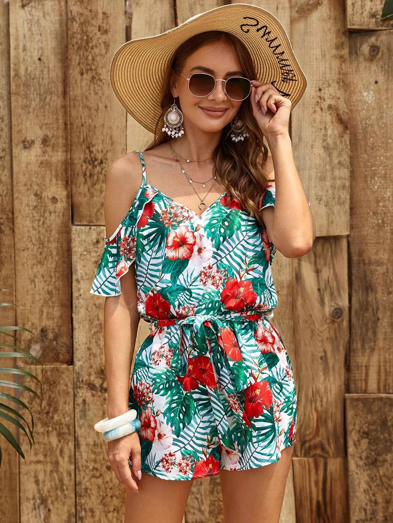 Cold Shoulder Ruffle Trim Tropical Romper Without Belt