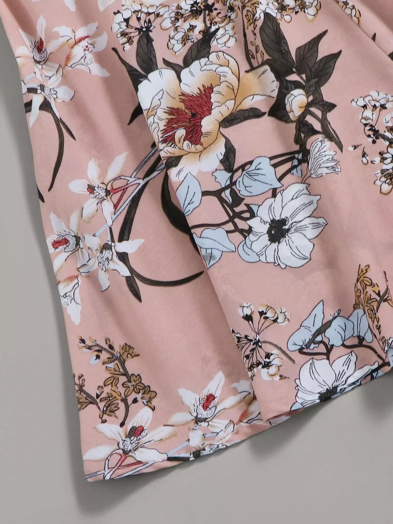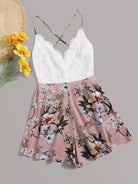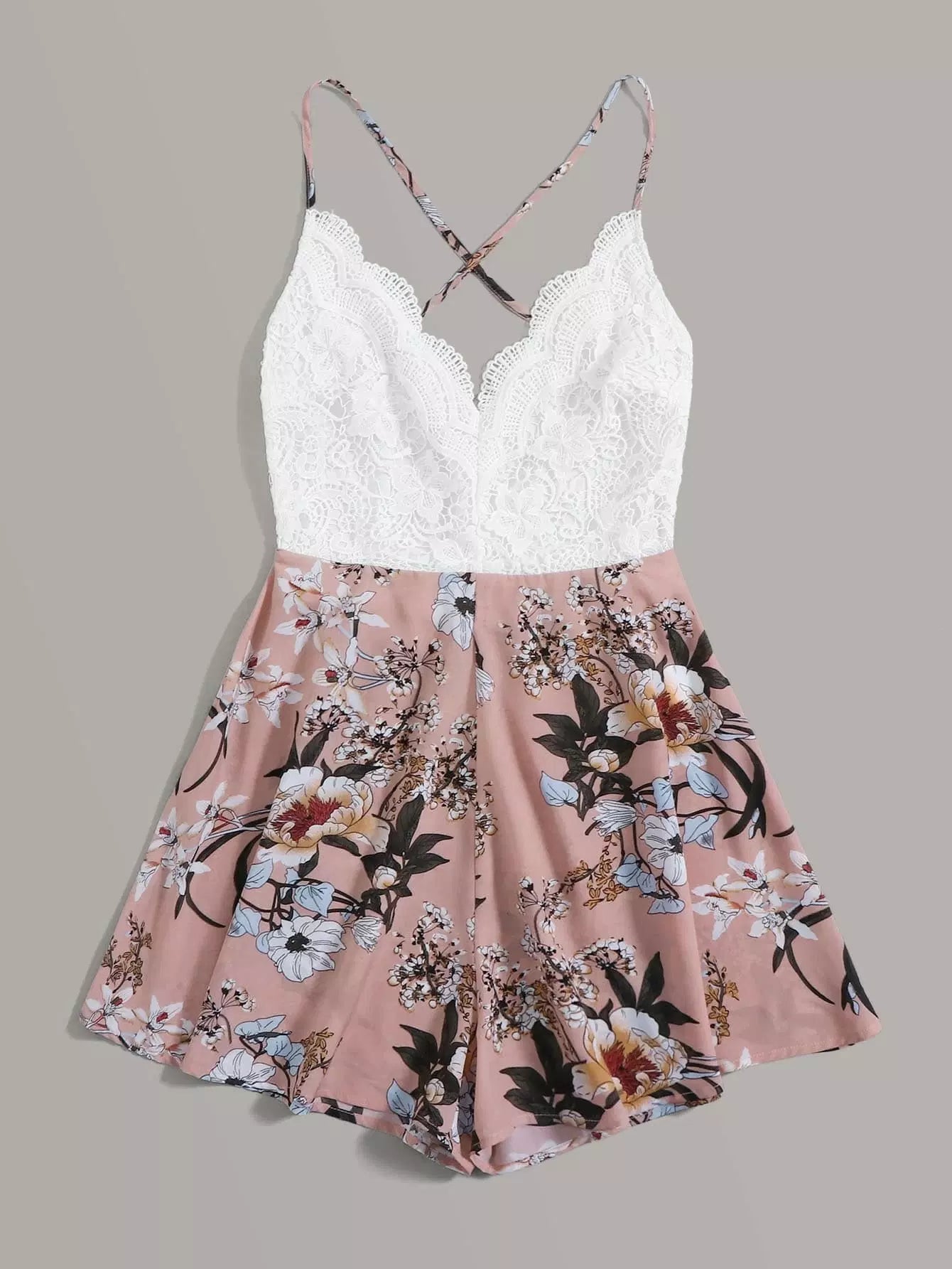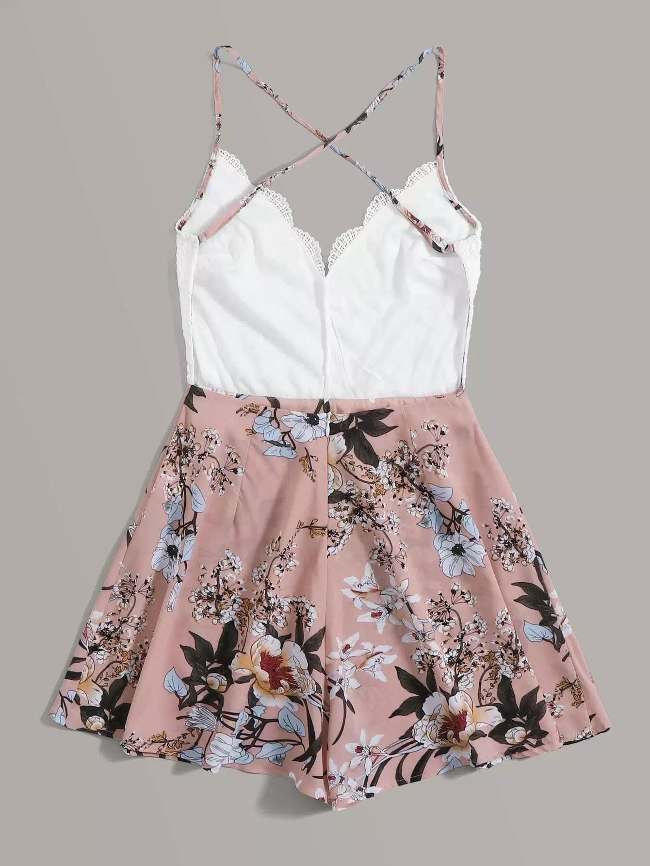 Crisscross Back Guipure Lace Bodice Floral Print Slip Romper