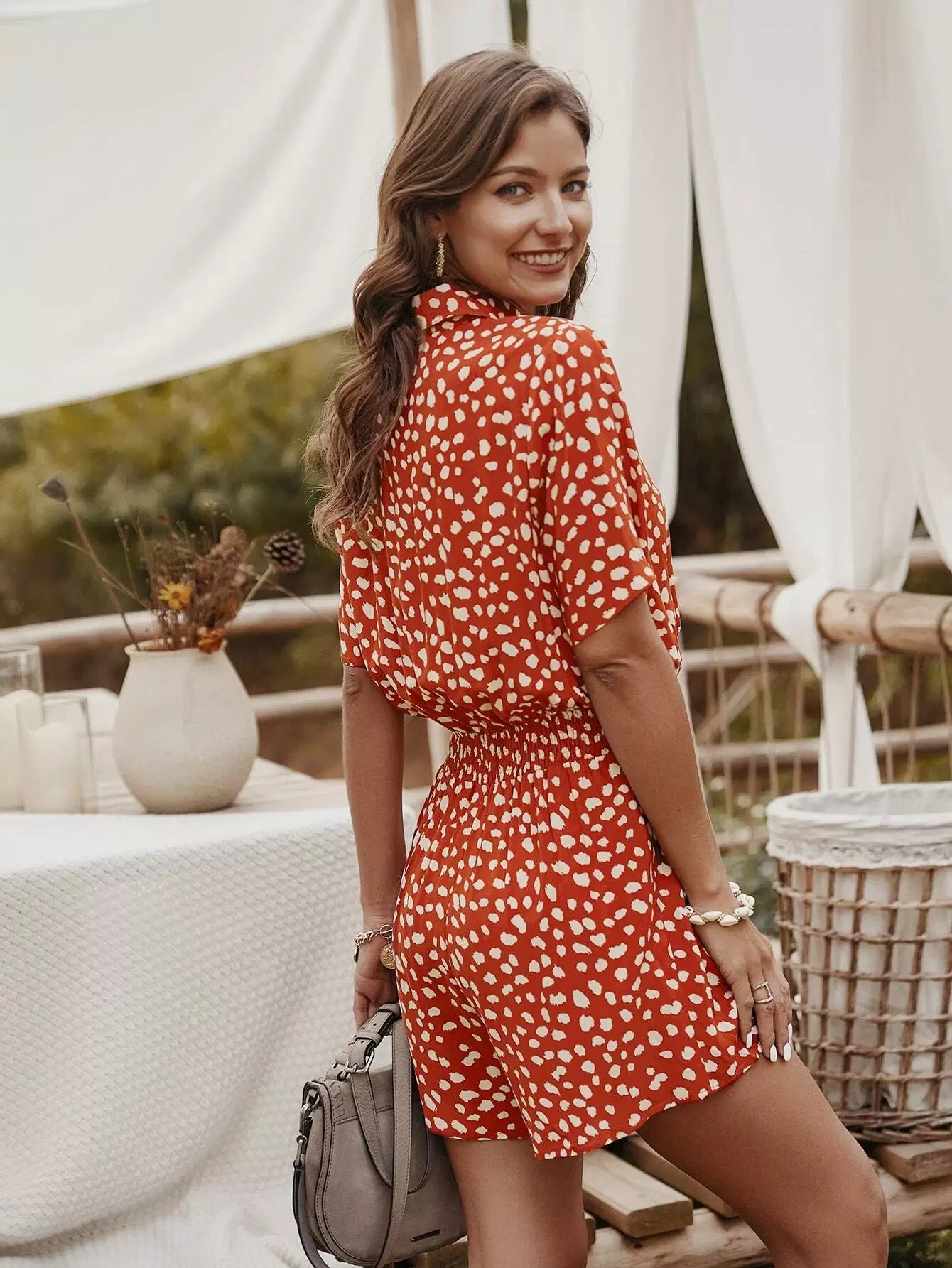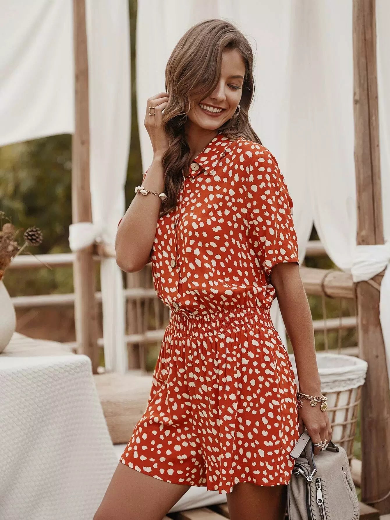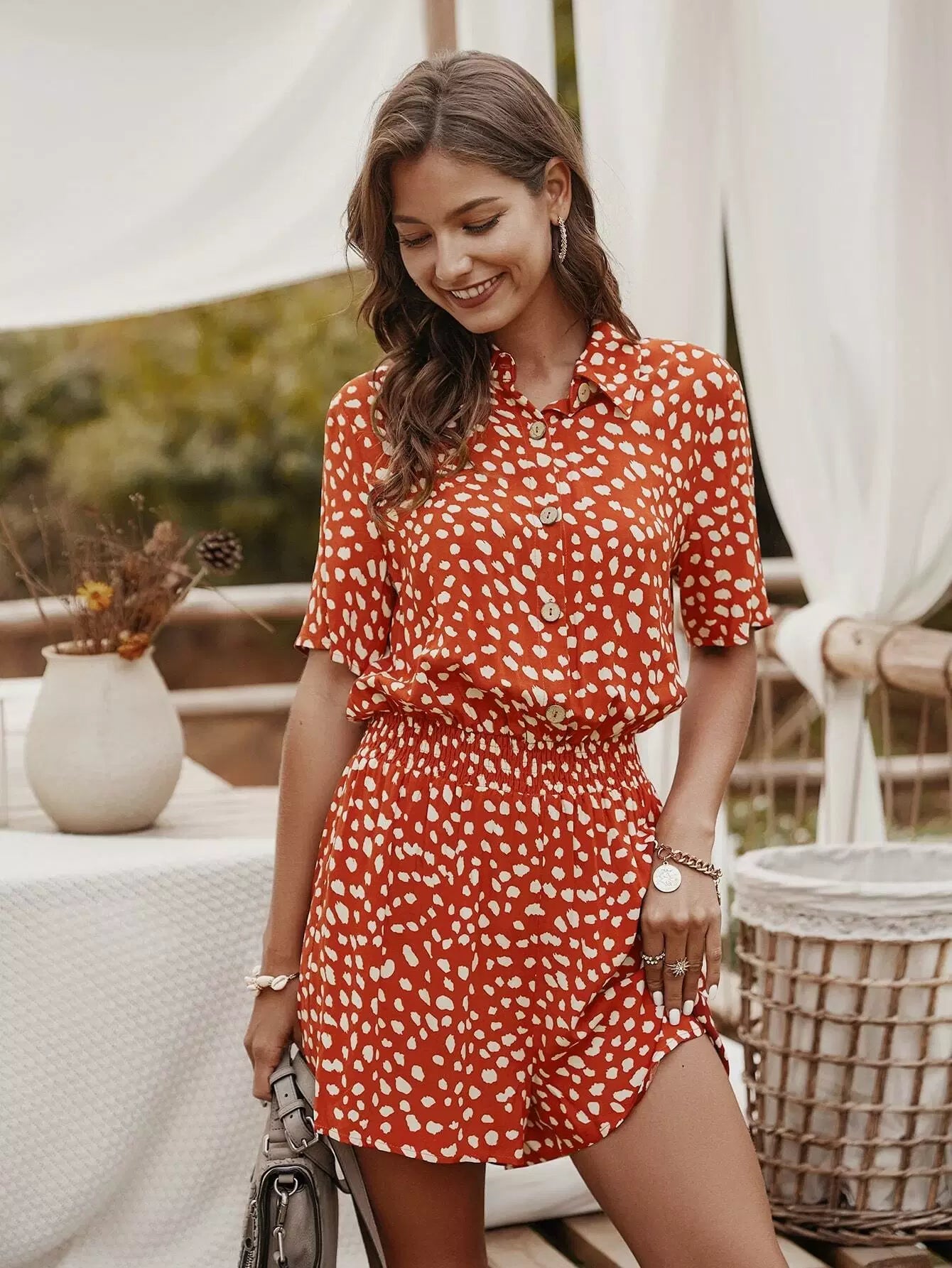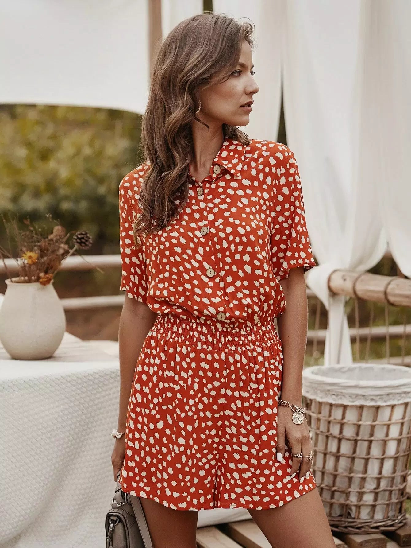 Dalmatian Print Shirred Waist Shirt Romper