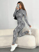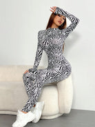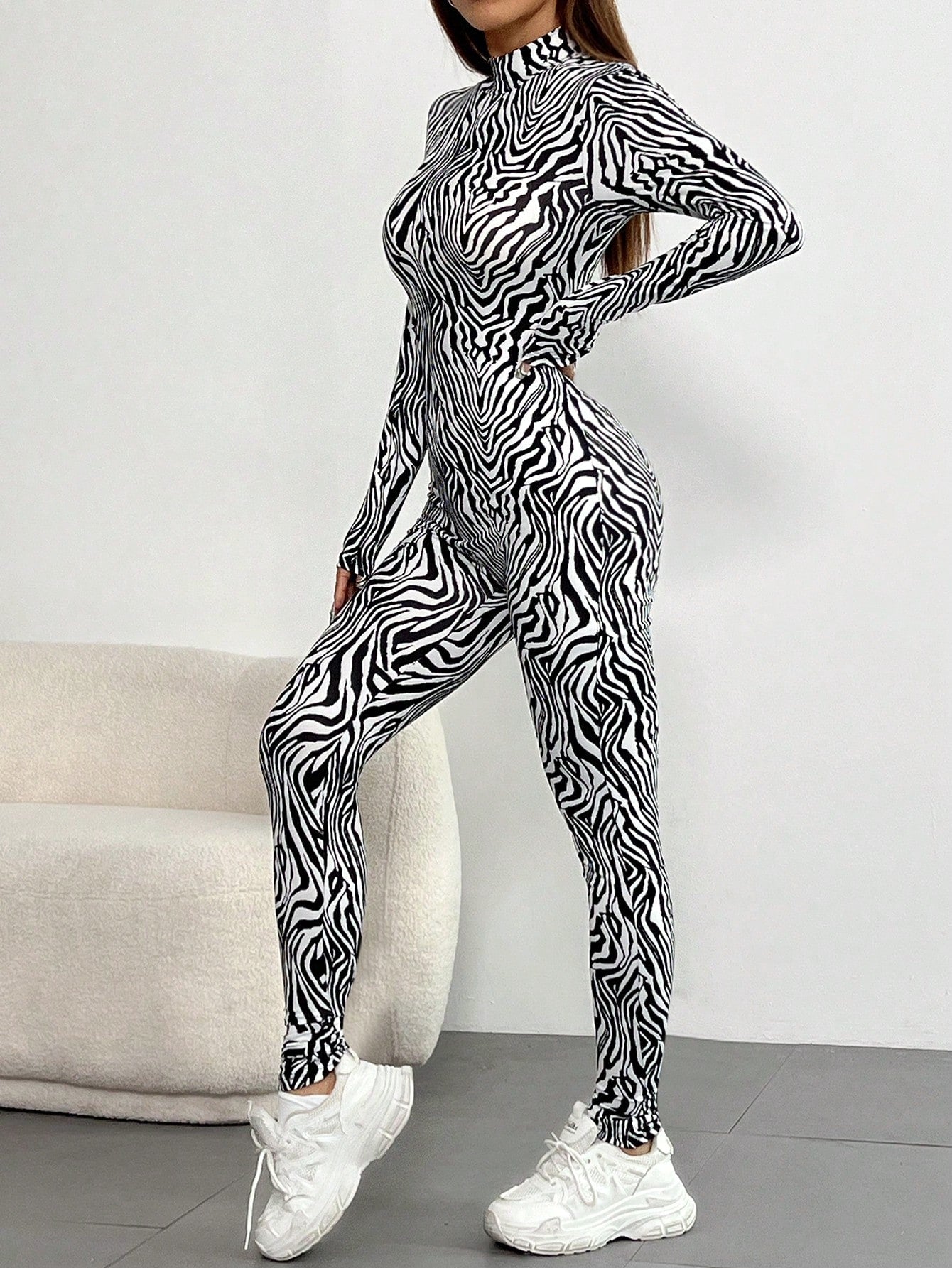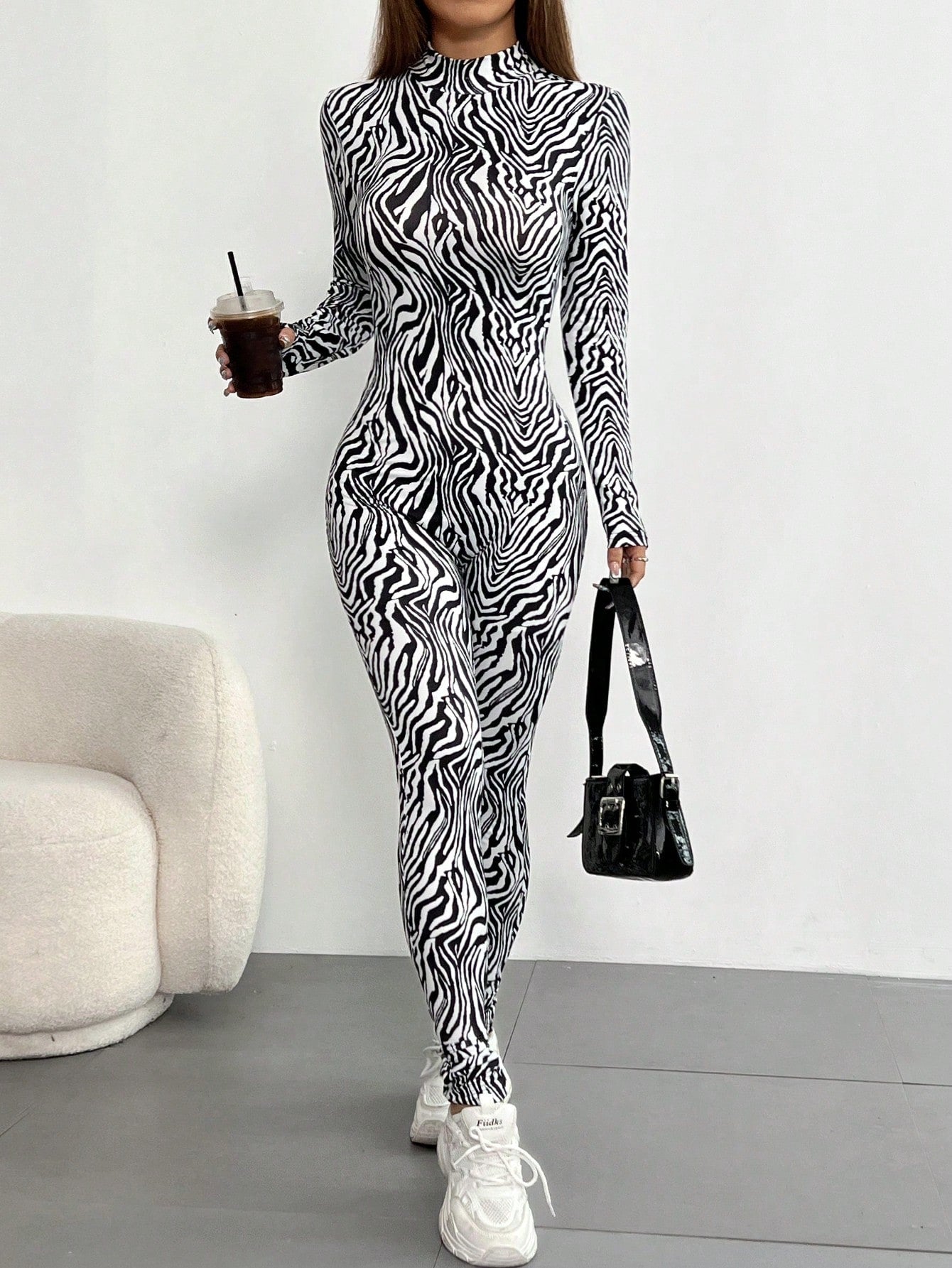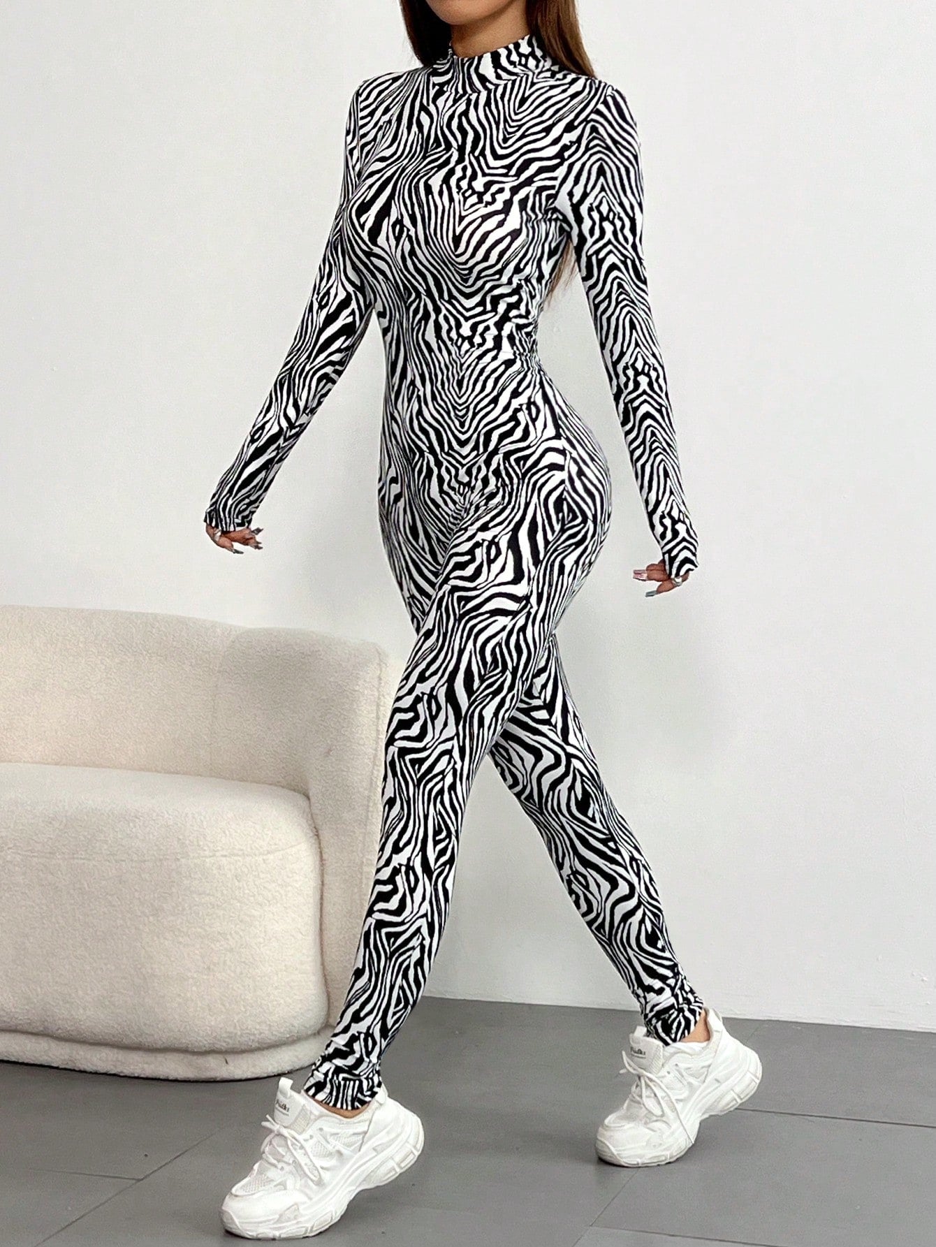 Flirla 1pc Fashionable Zebra Striped Stand Collar Long Sleeve Jumpsuit For Spring And Autumn Fall Cloth