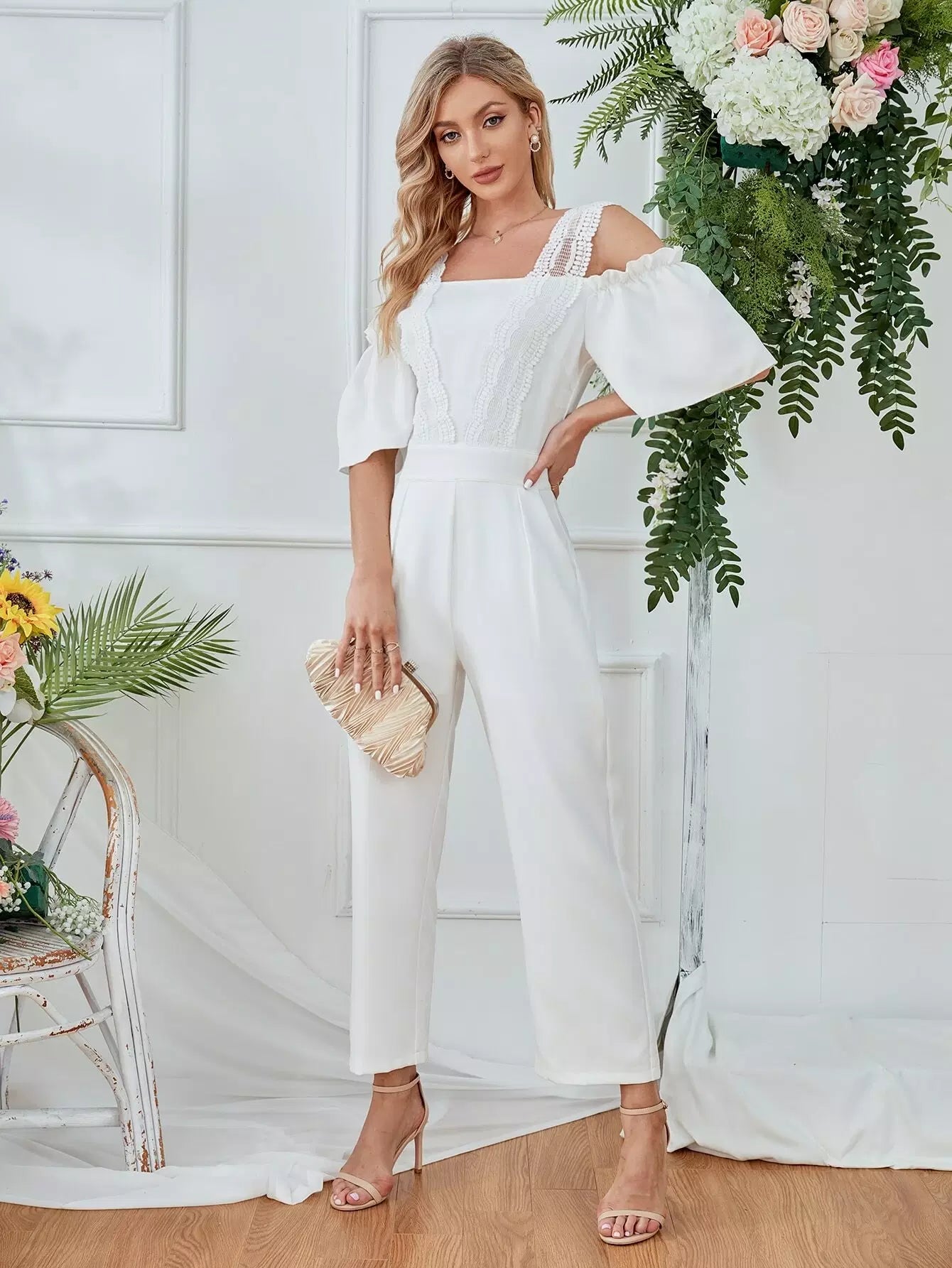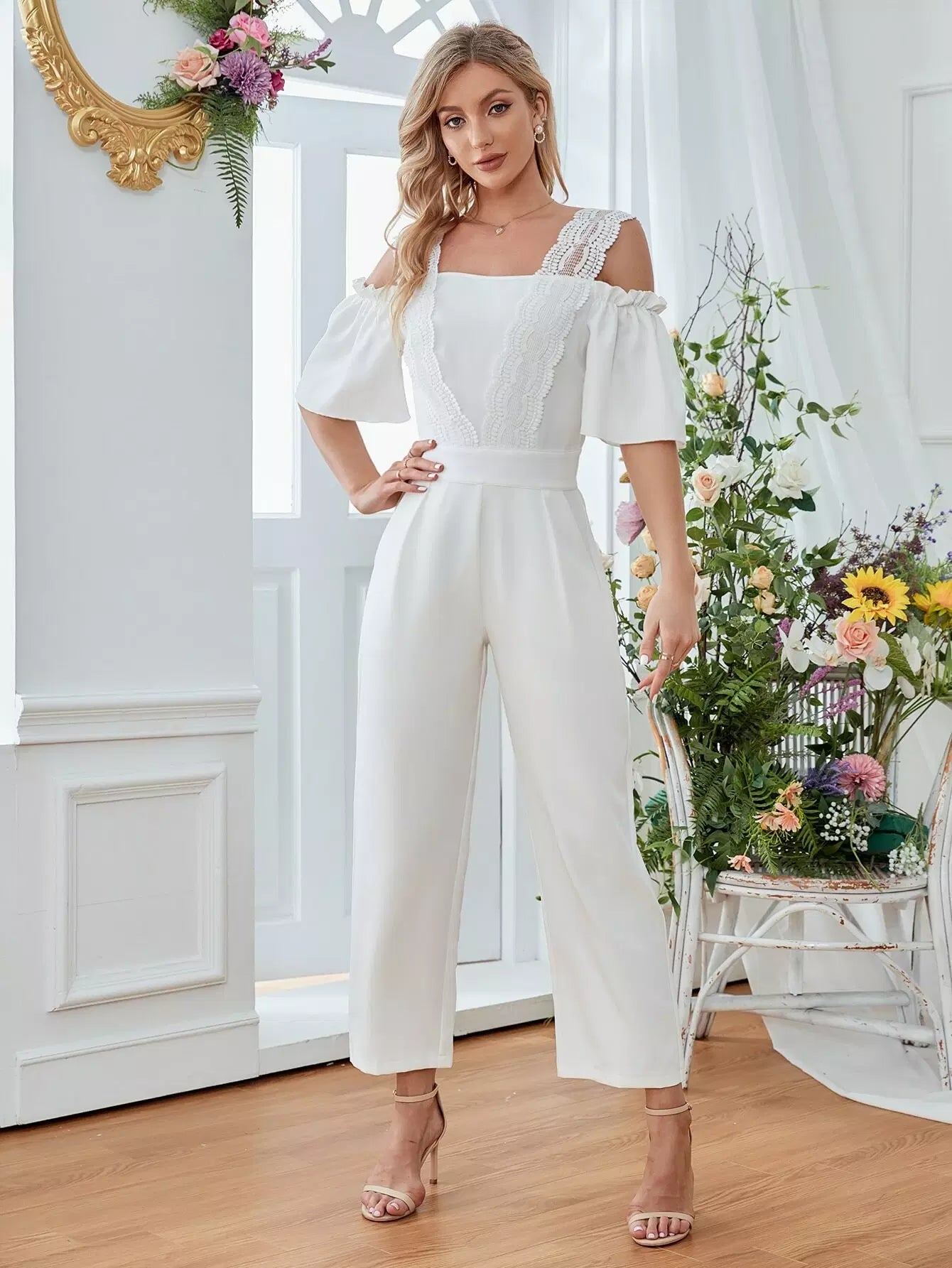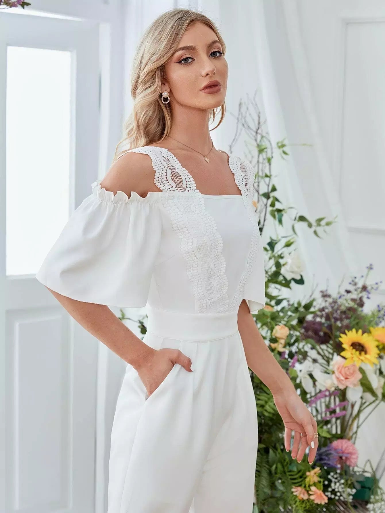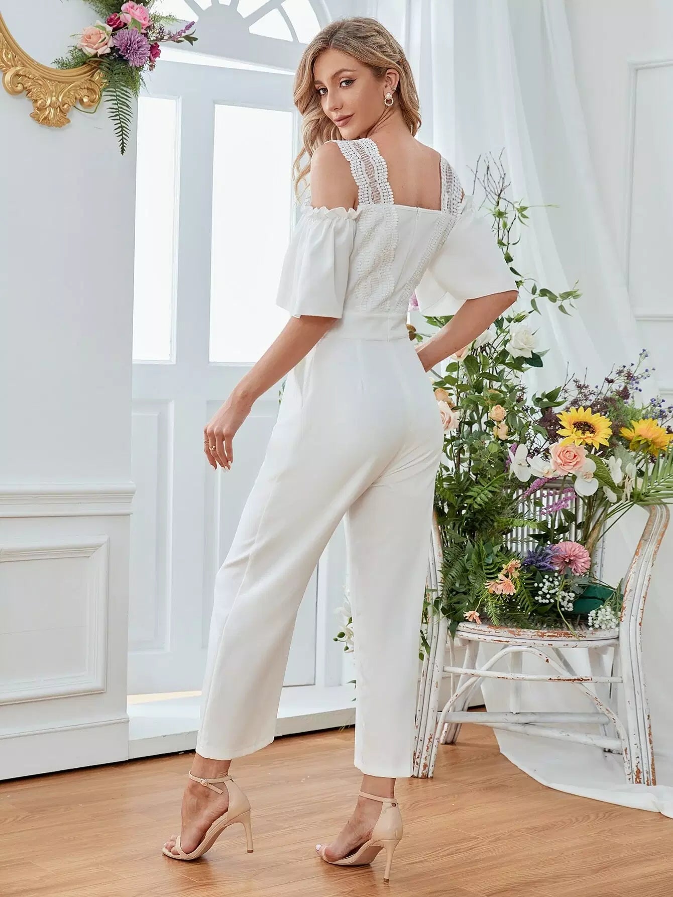 Guipure Lace Insert Cold Shoulder Jumpsuit