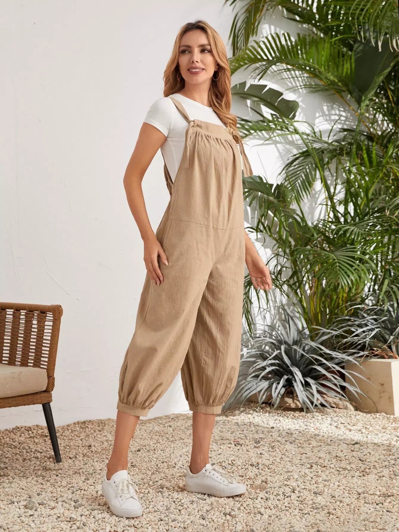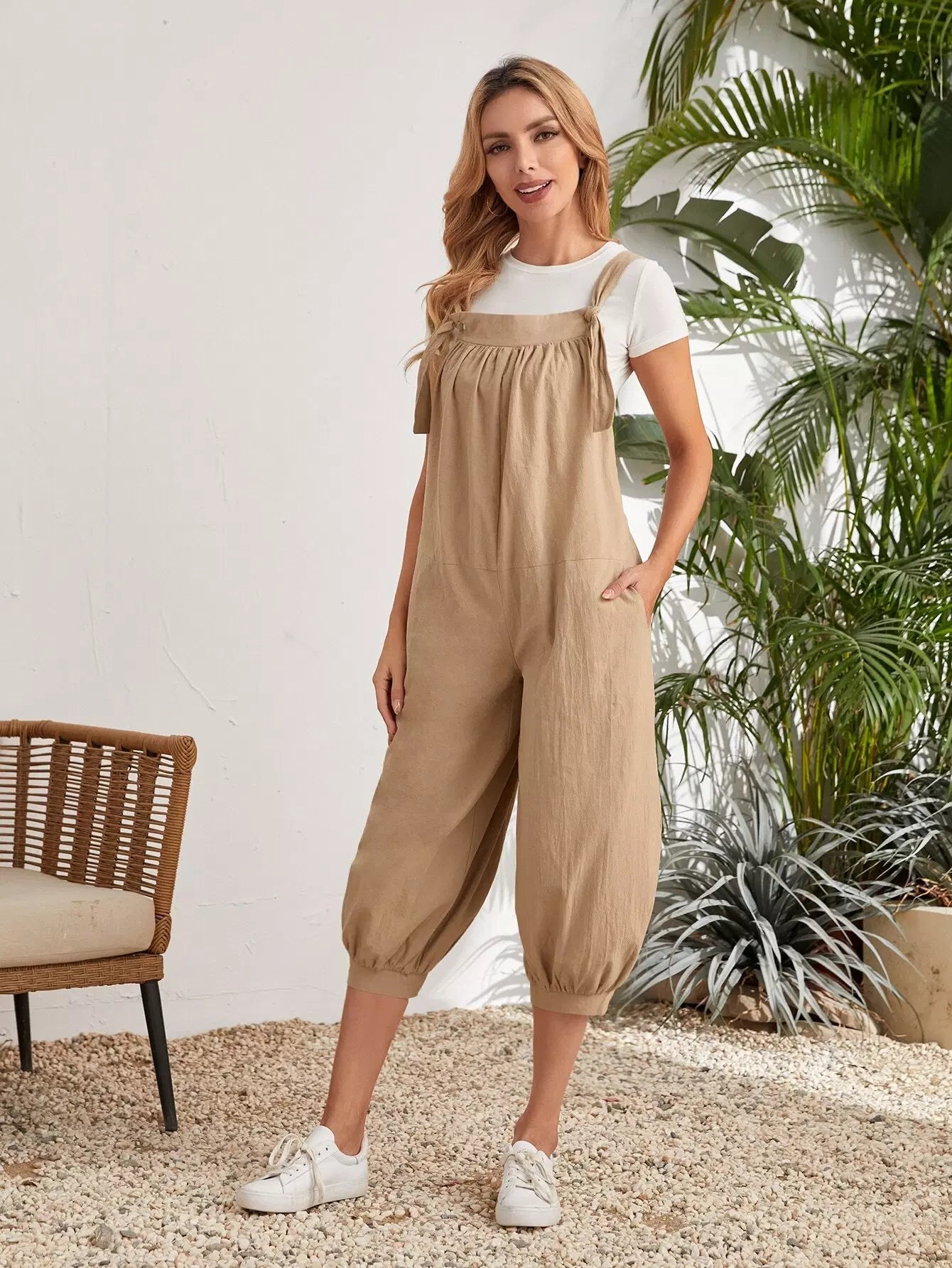 Knot Shoulder Tapered Hem Crop Pinafore Jumpsuit