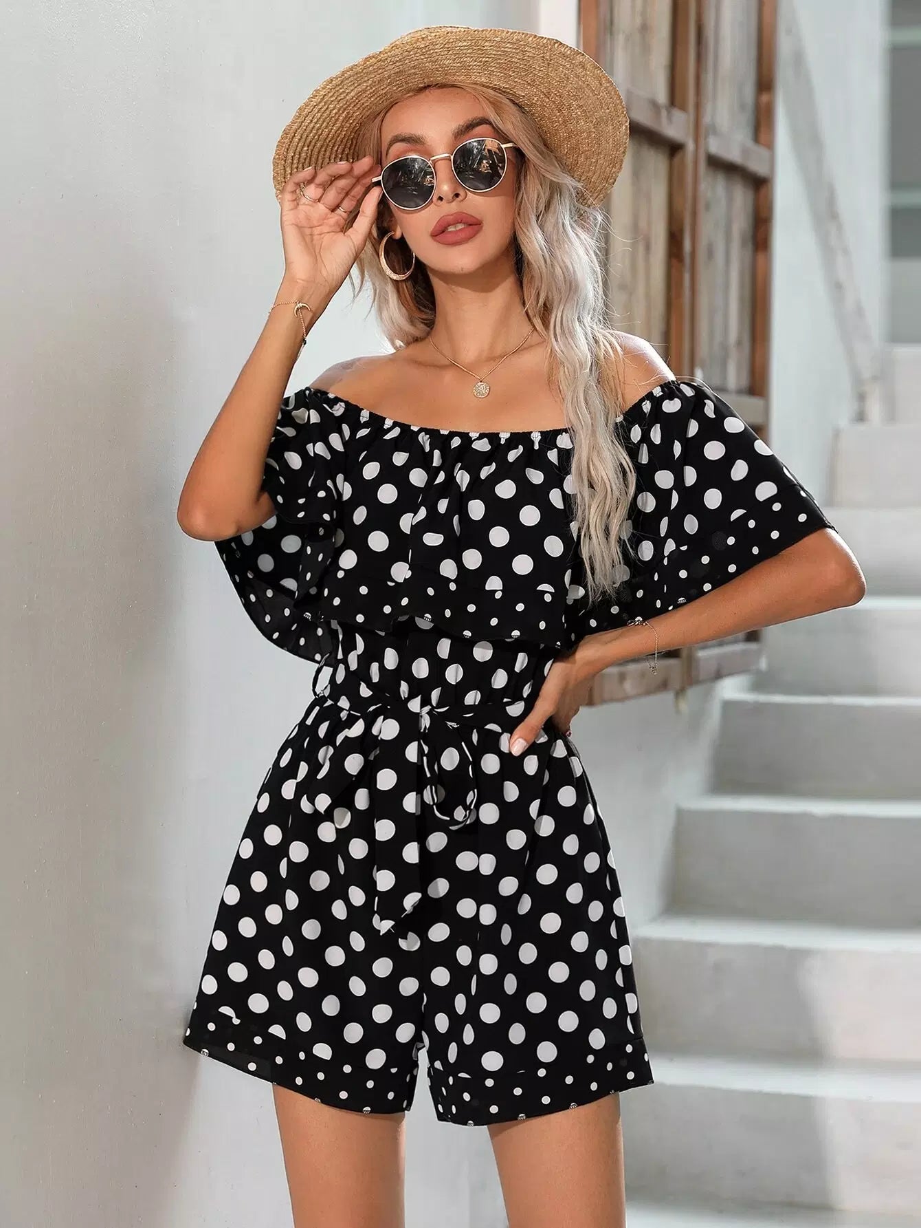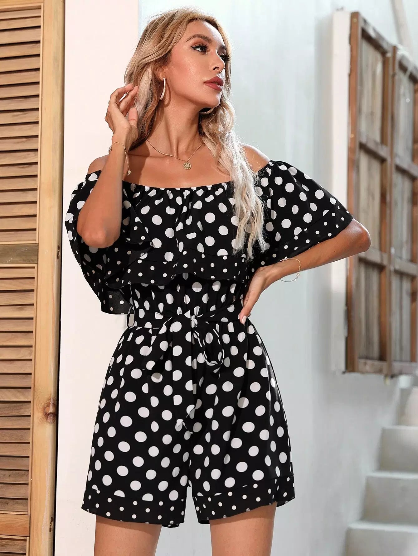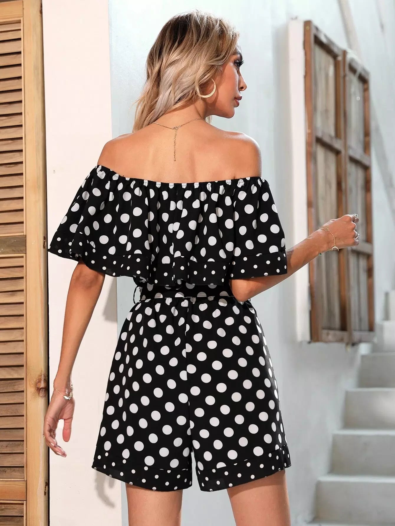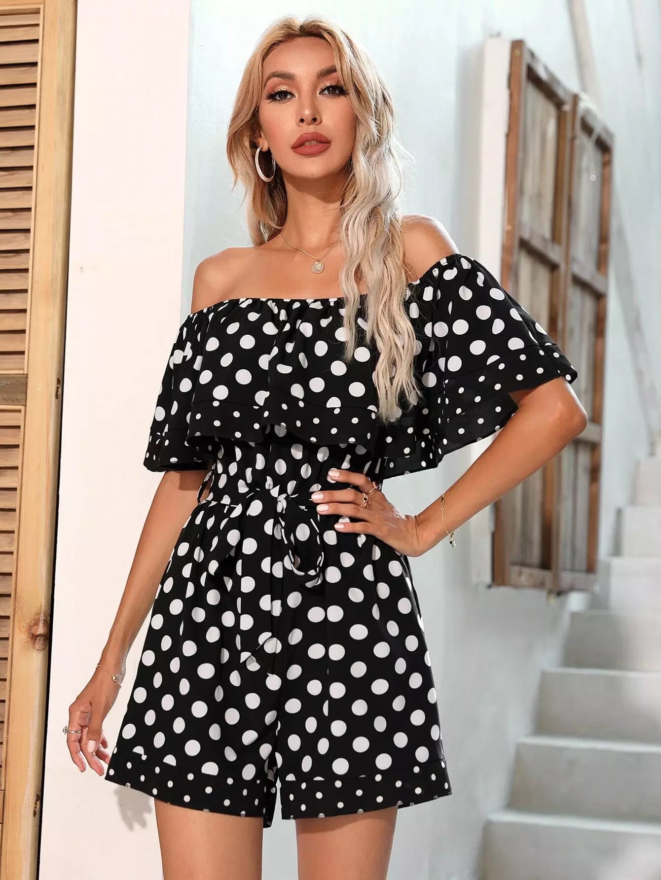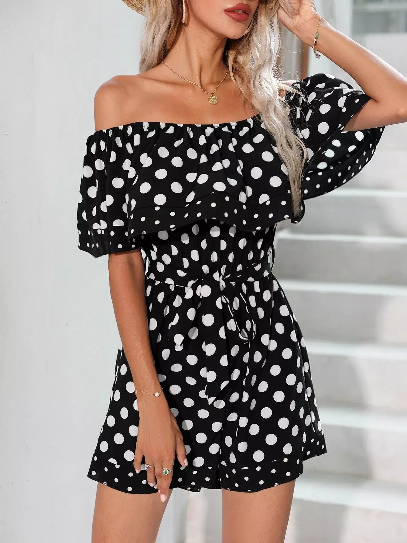 Polka Dot Off Shoulder Romper Without Belt