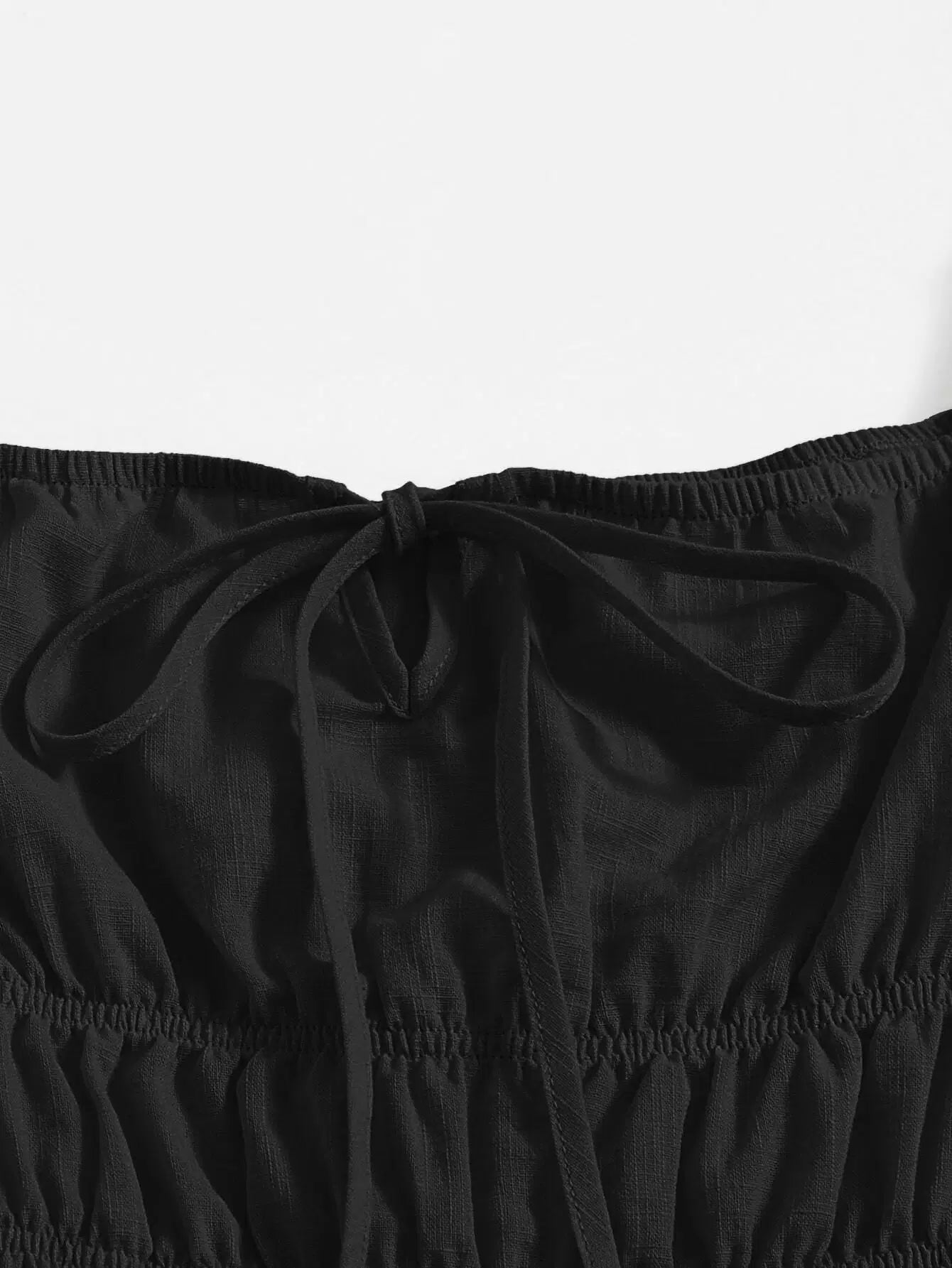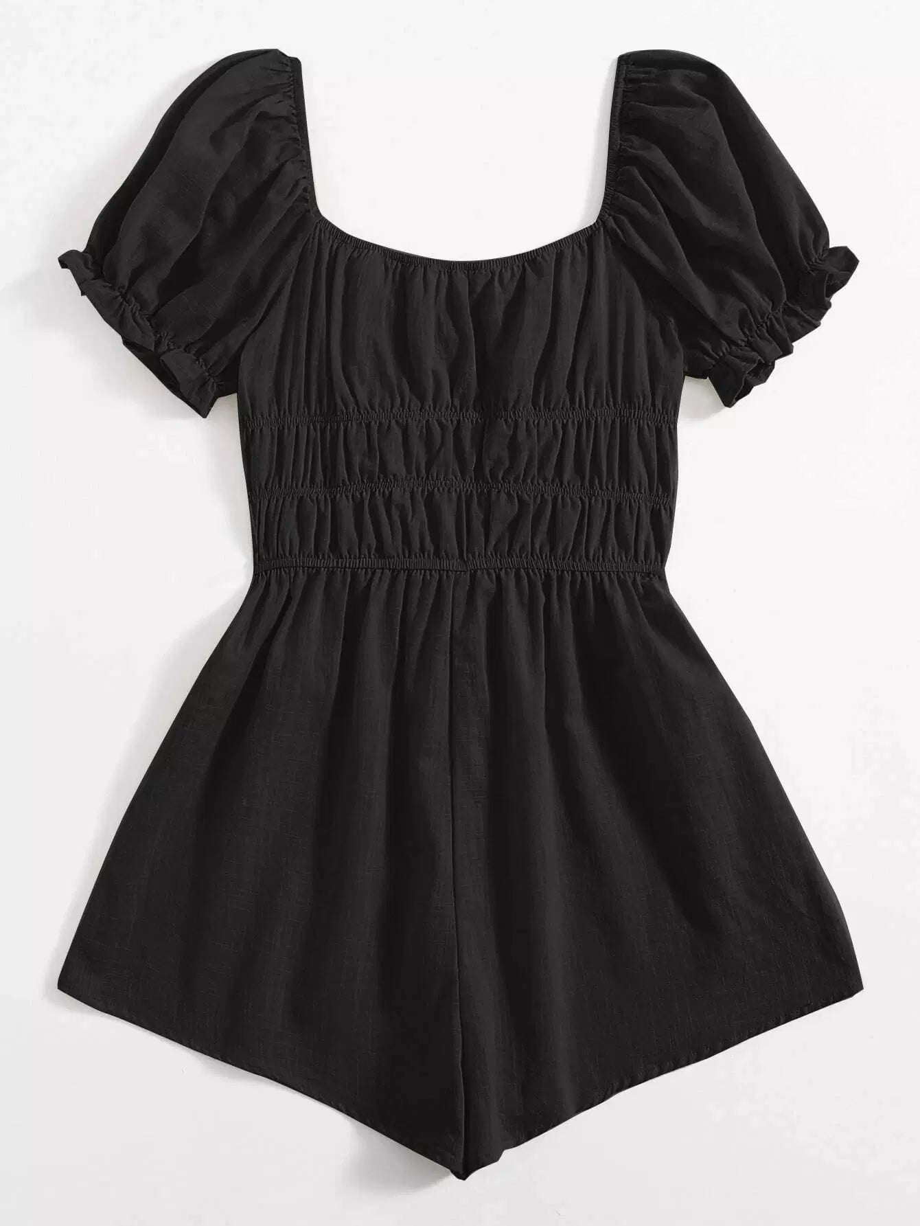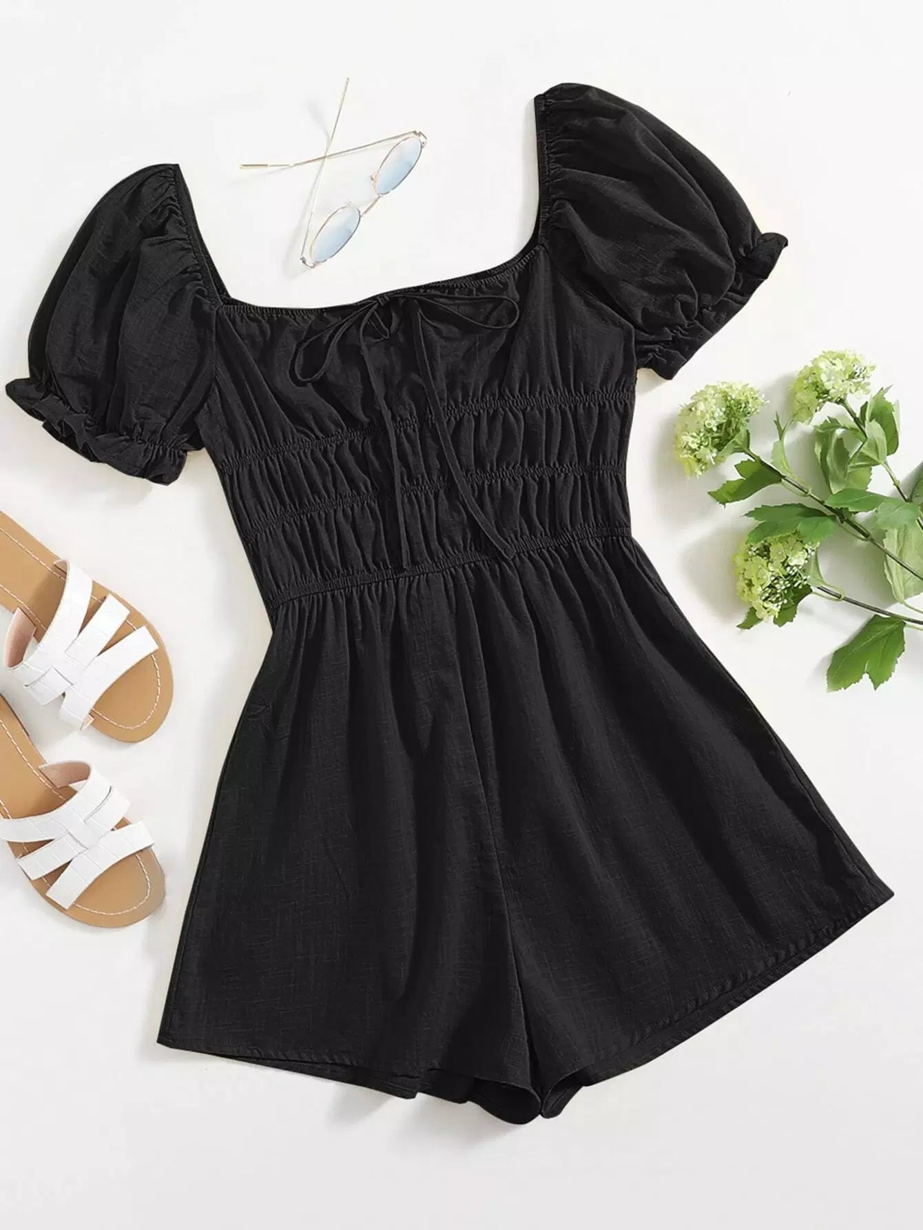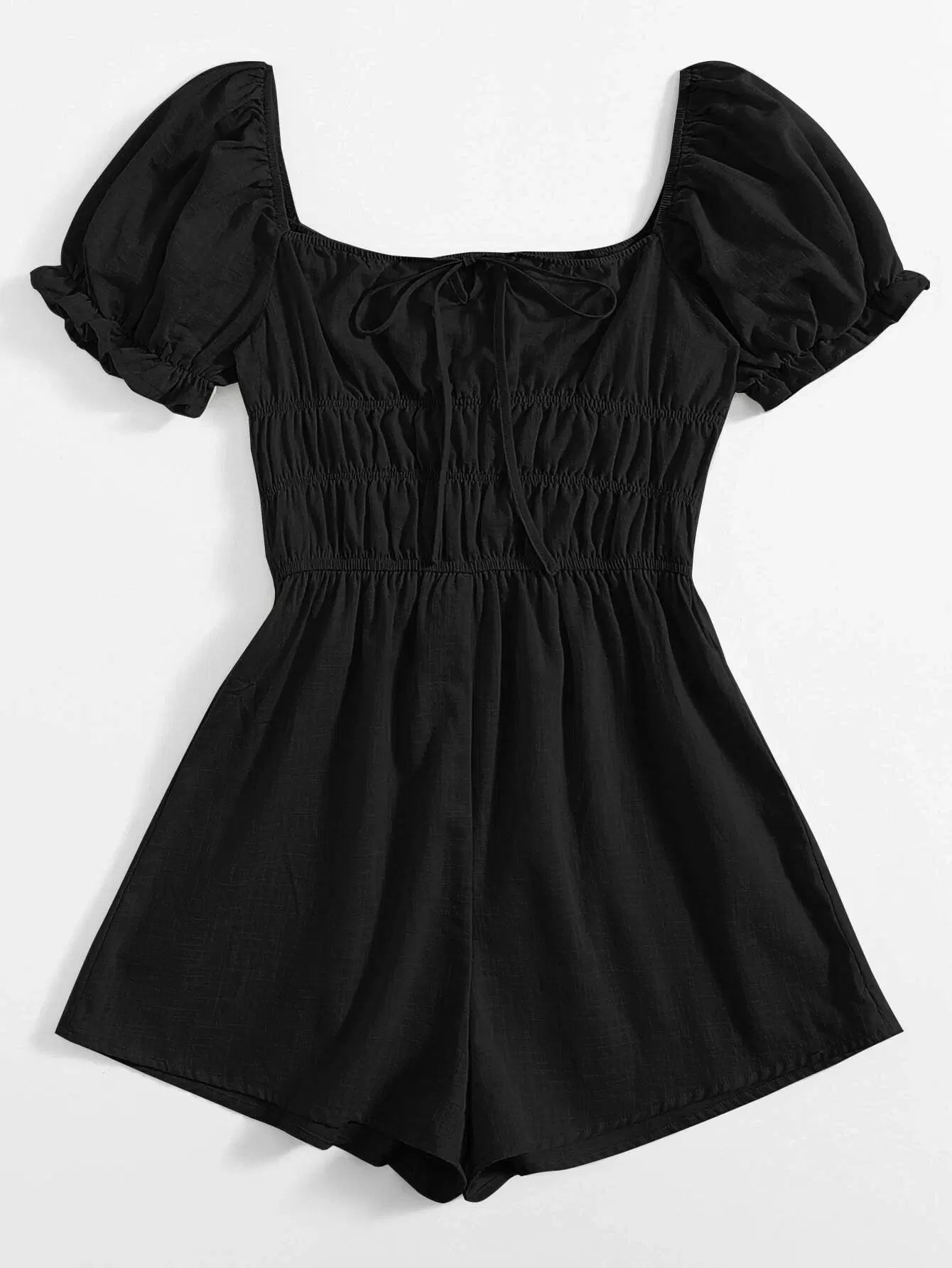Puff Sleeve Tie Front Crinkle Waist Romper