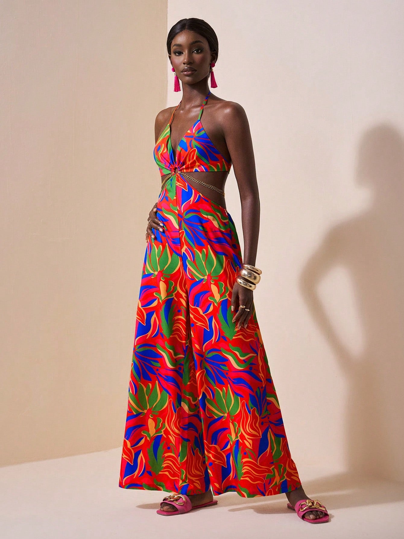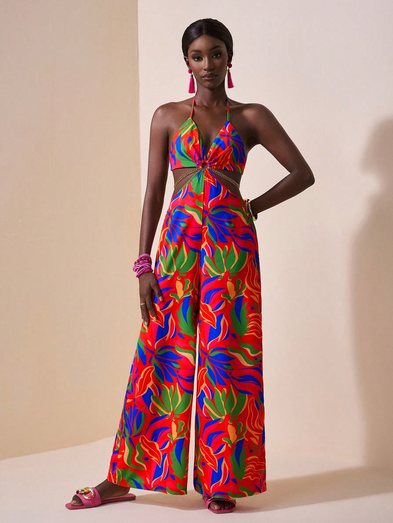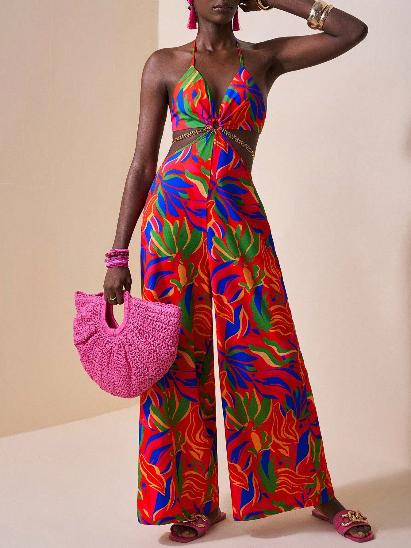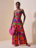 Slaydiva Vacation Casual Tropical Print Chain Decor Side Cut-Out Sleeveless Backless Jumpsuit