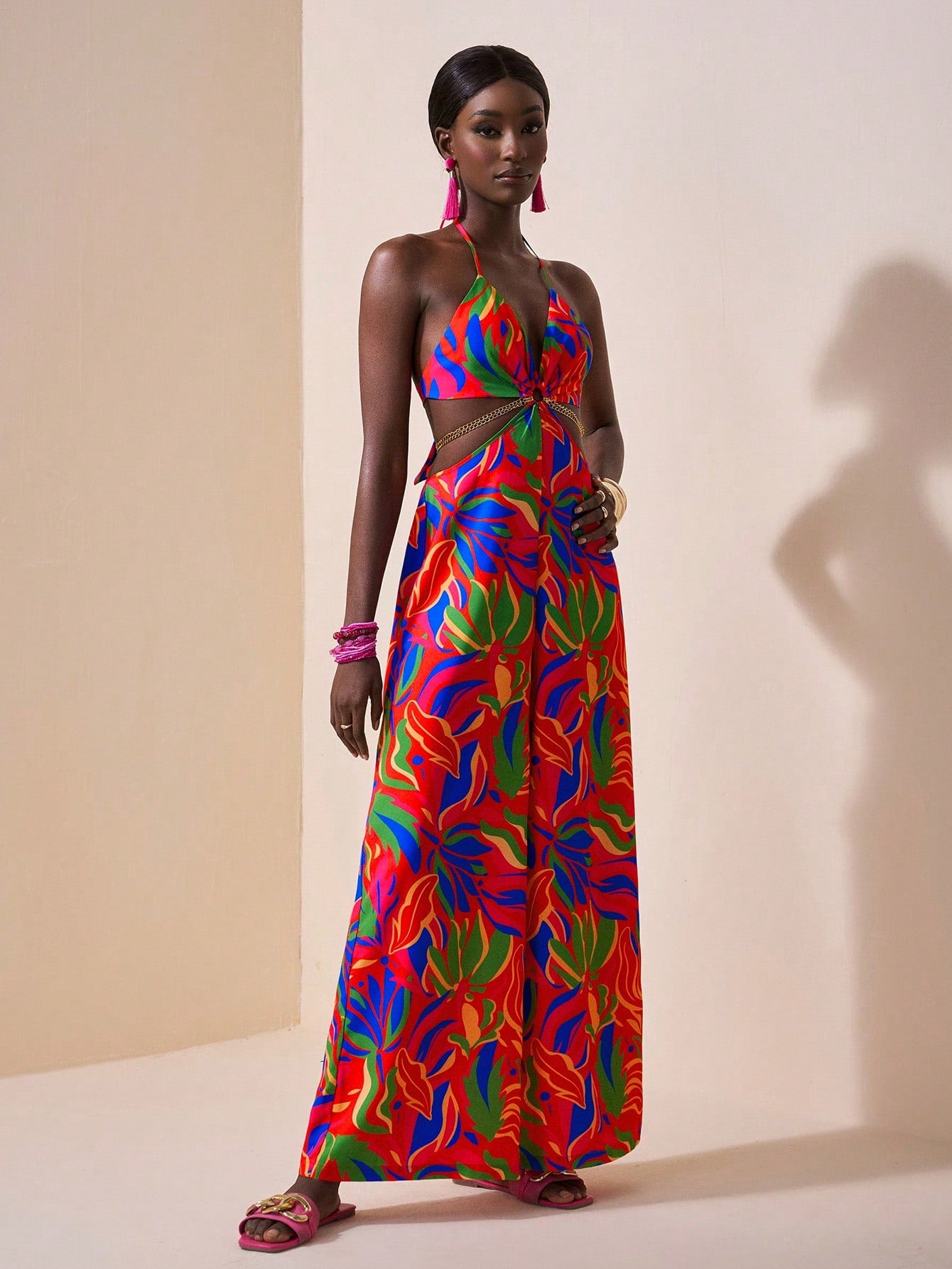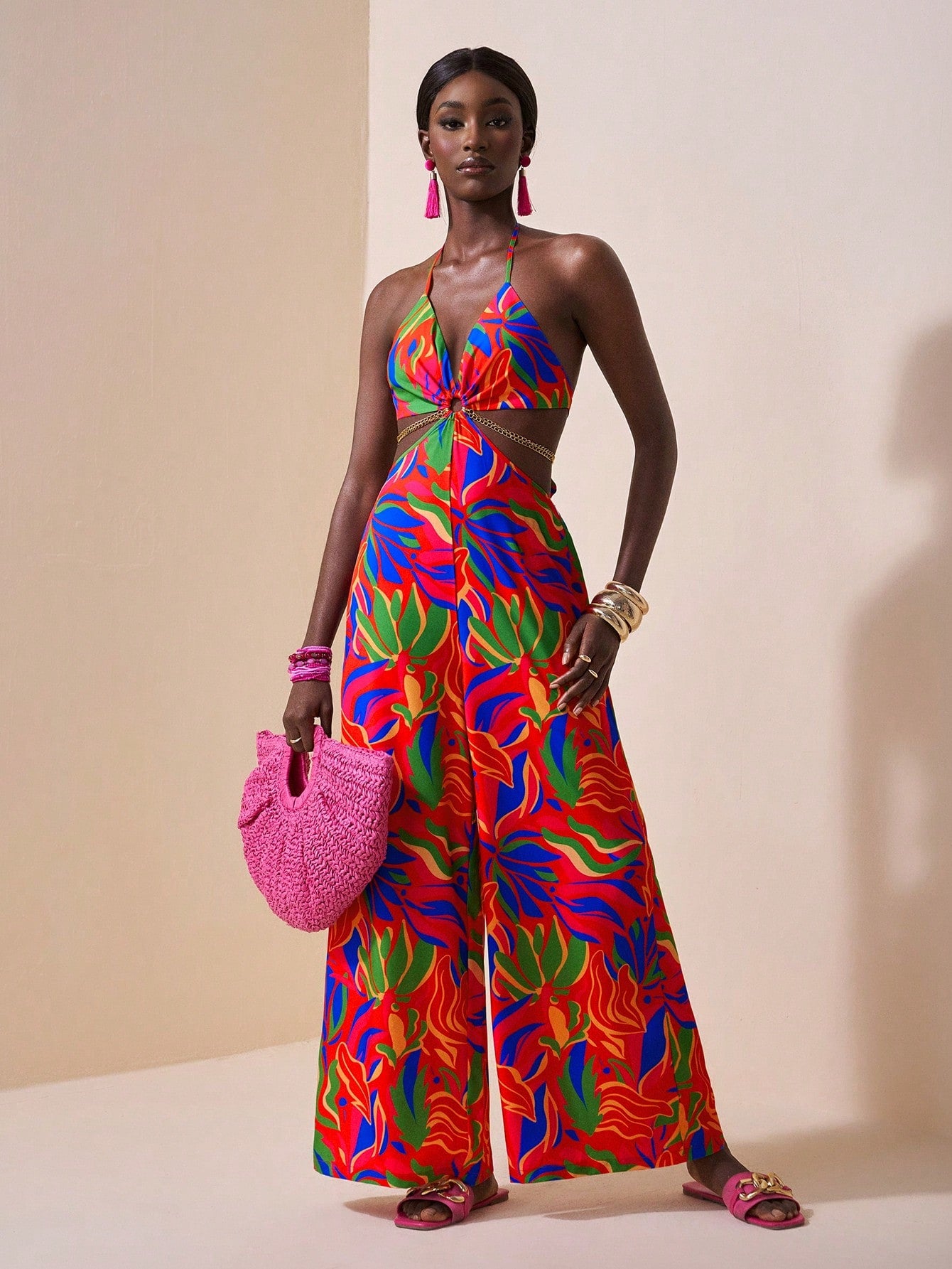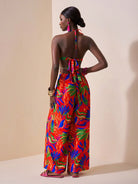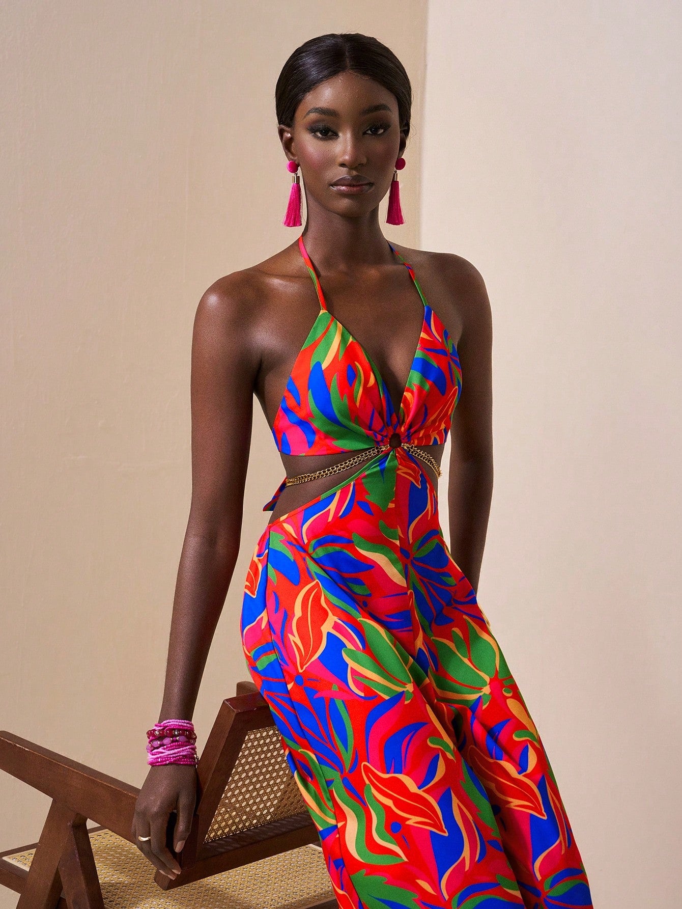 Slaydiva Vacation Casual Tropical Print Chain Decor Side Cut-Out Sleeveless Backless Jumpsuit