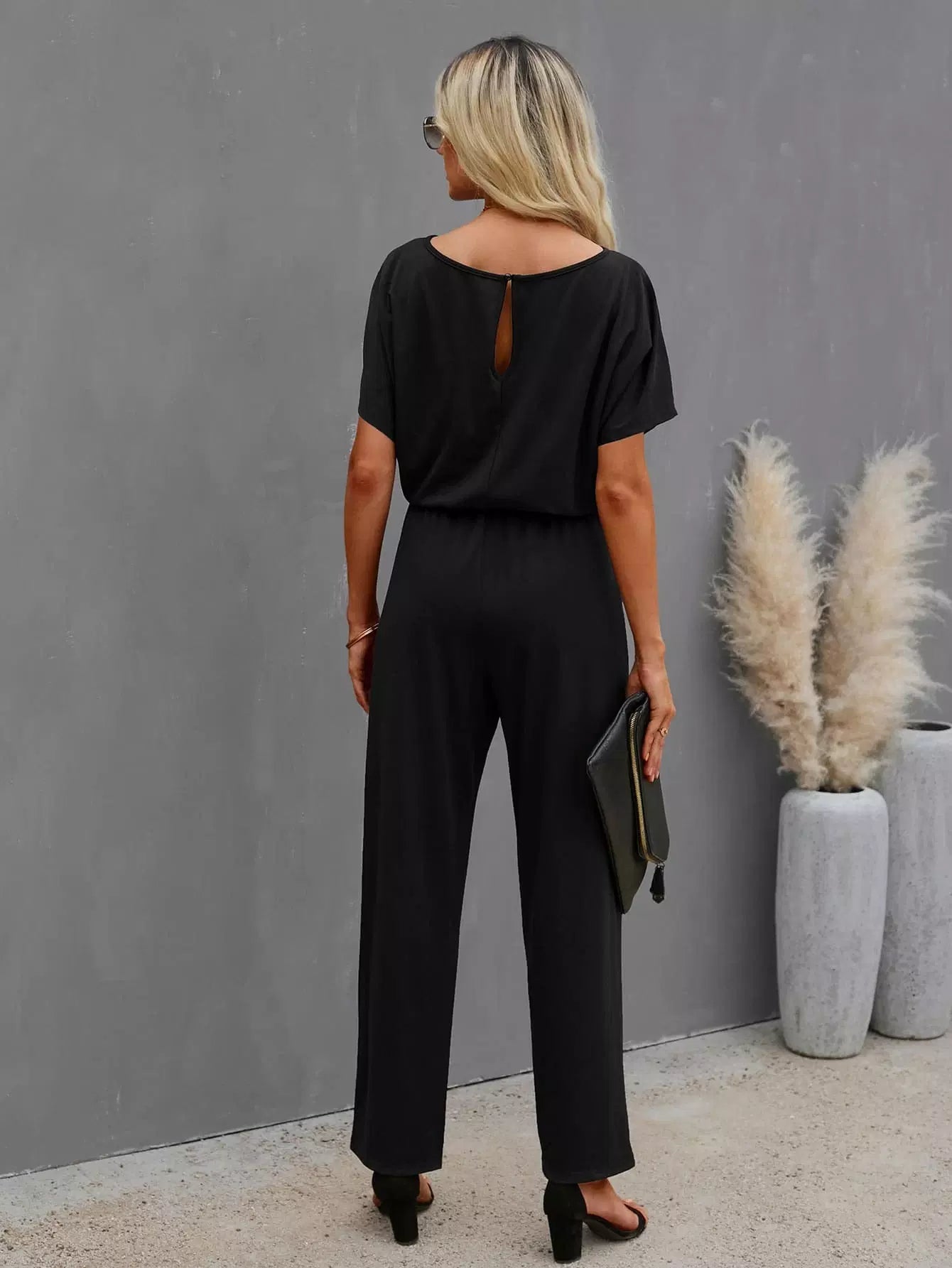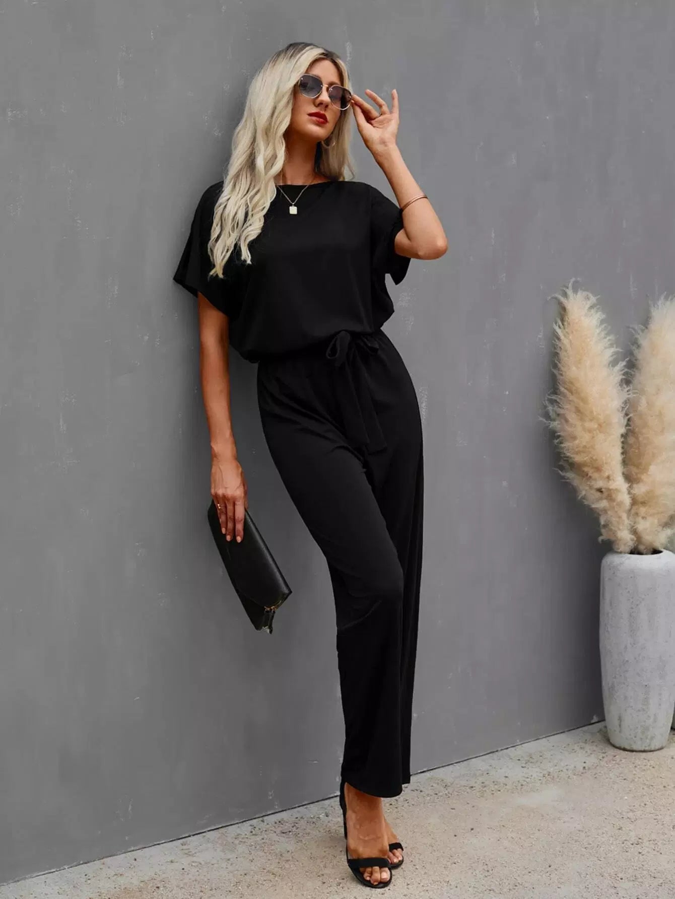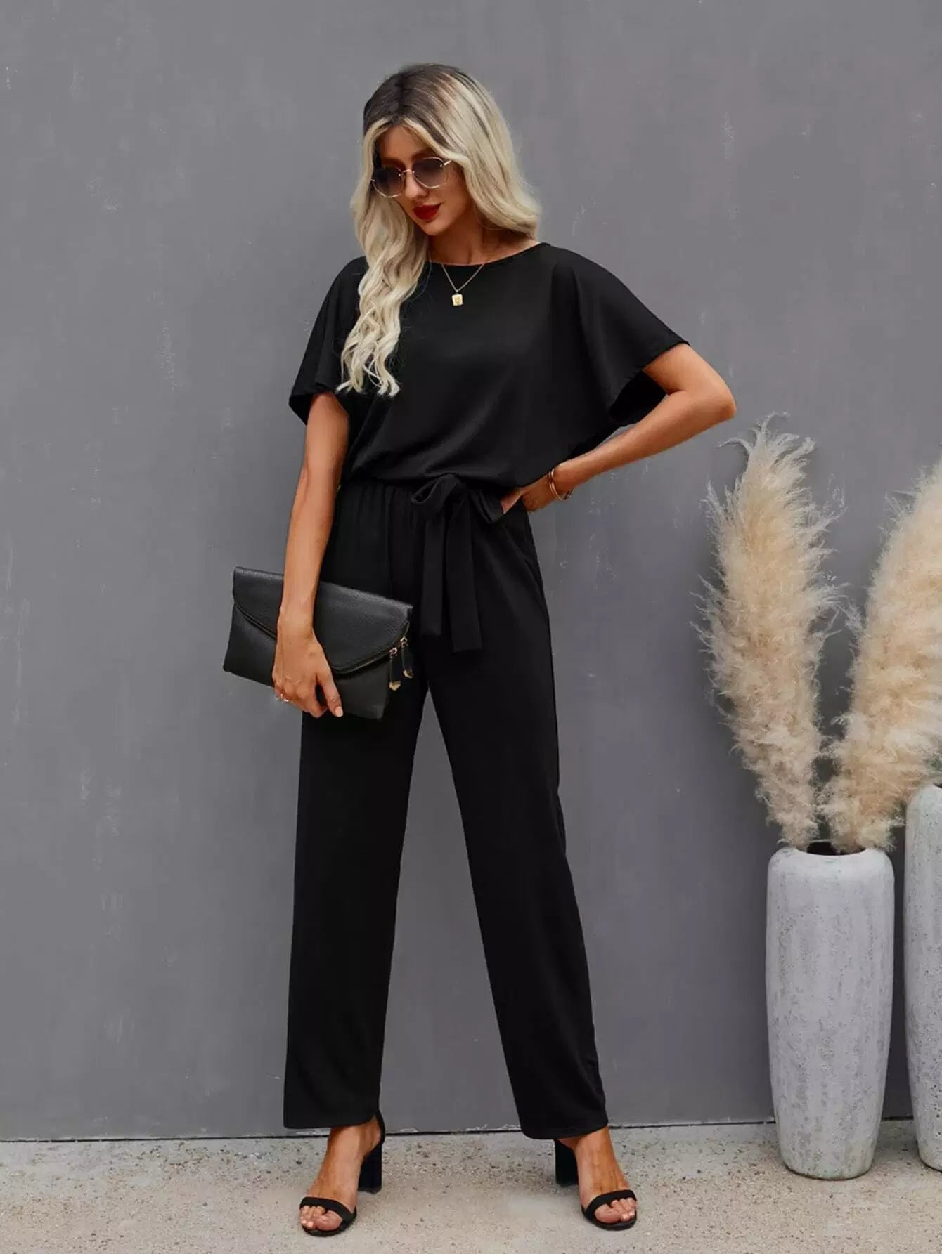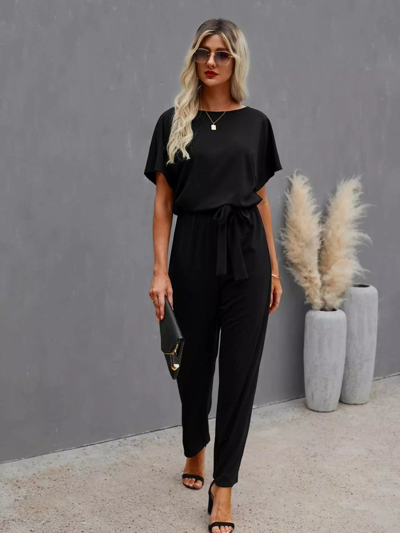 Solid Batwing Sleeve Jumpsuit Without Belt