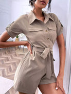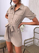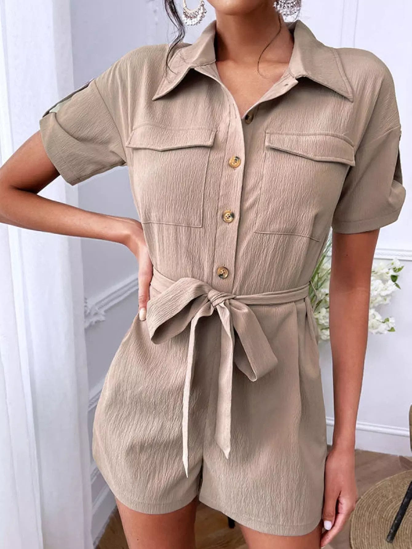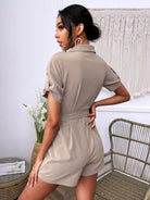 Solid Flap Pocket Button Front Roll Up Sleeve Romper Without Belt